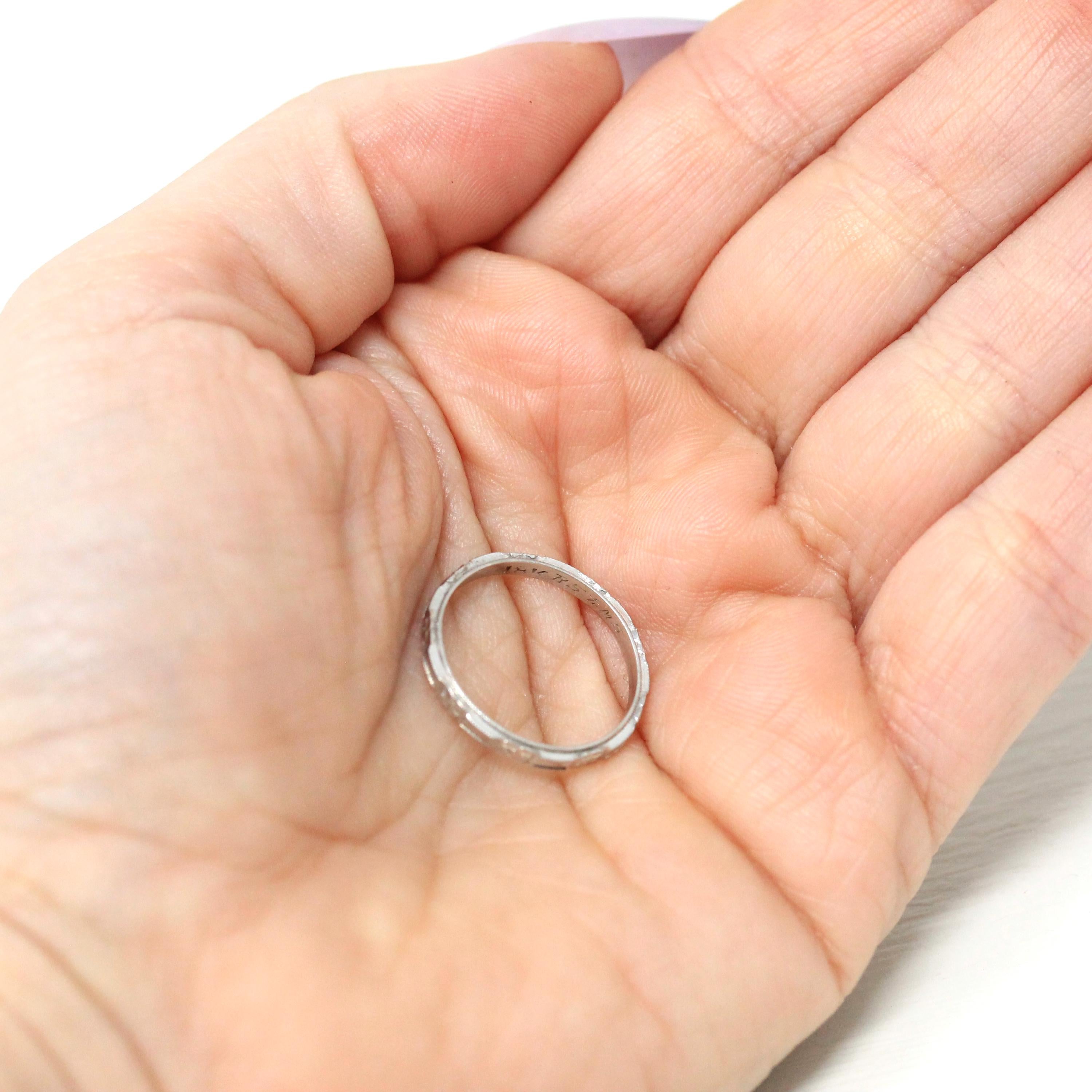 Art Deco Wedding Band - Vintage 18k White Gold Orange Blossom Inscribed Eternity Ring - Circa 1930s Size 5.75 Bridal Fine 30s Floral Jewelry