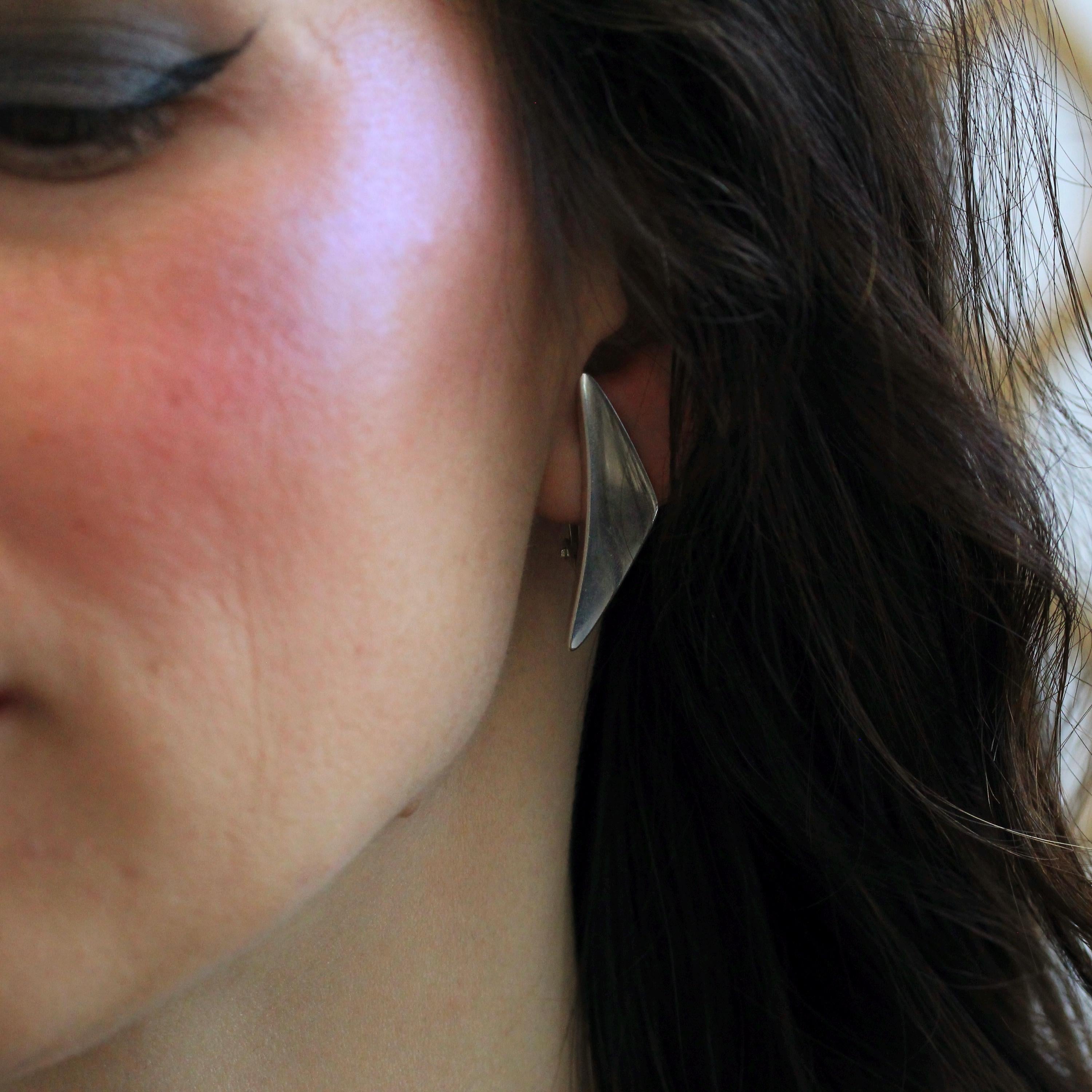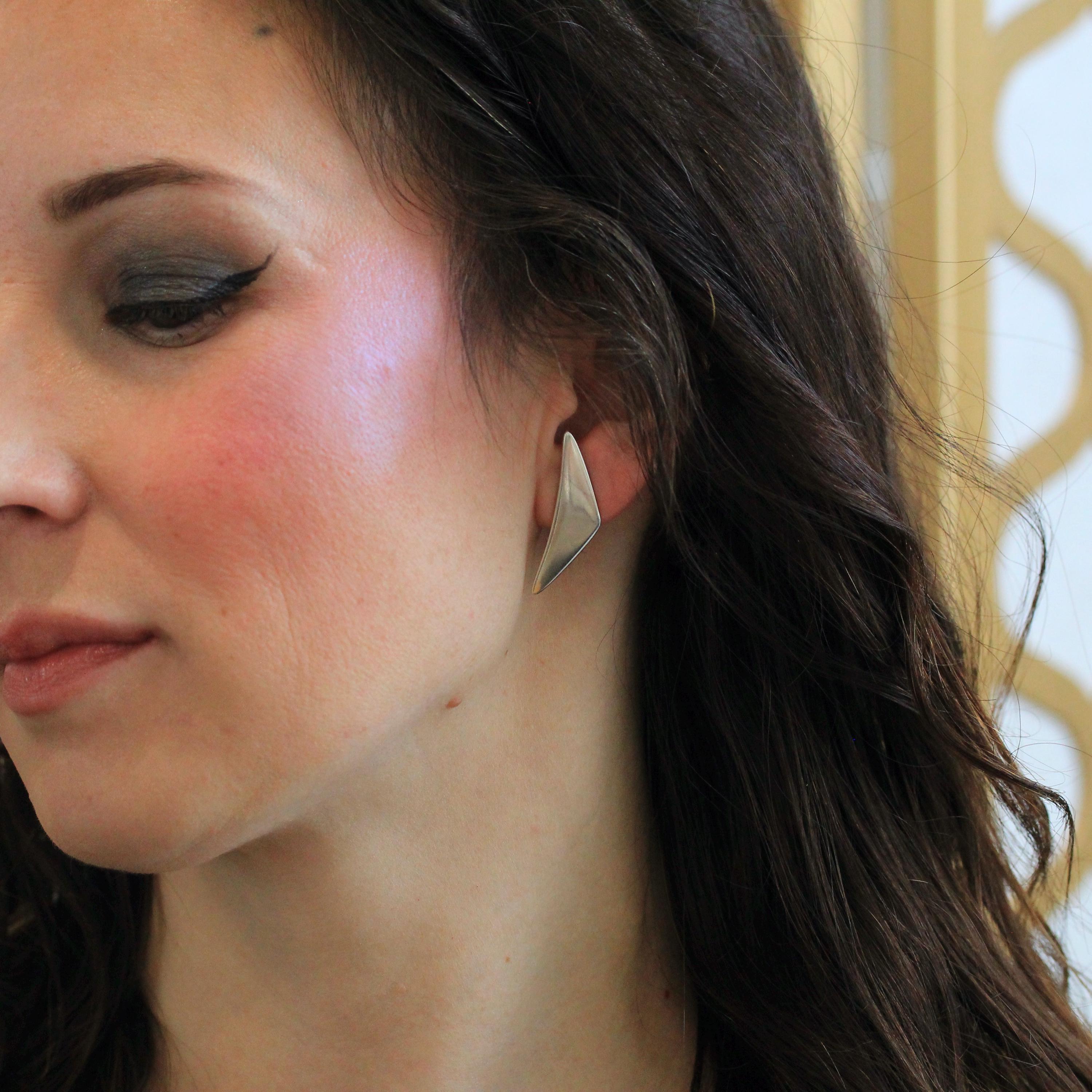 Lovely vintage circa 1930s Art Deco era sterling silver earrings! This stunning statement pair are a fun triangular boomerang shape and secure with clip-on closures; perfect for both non pierced or pierced ears. Timeless fashion accessories from the 1930s!