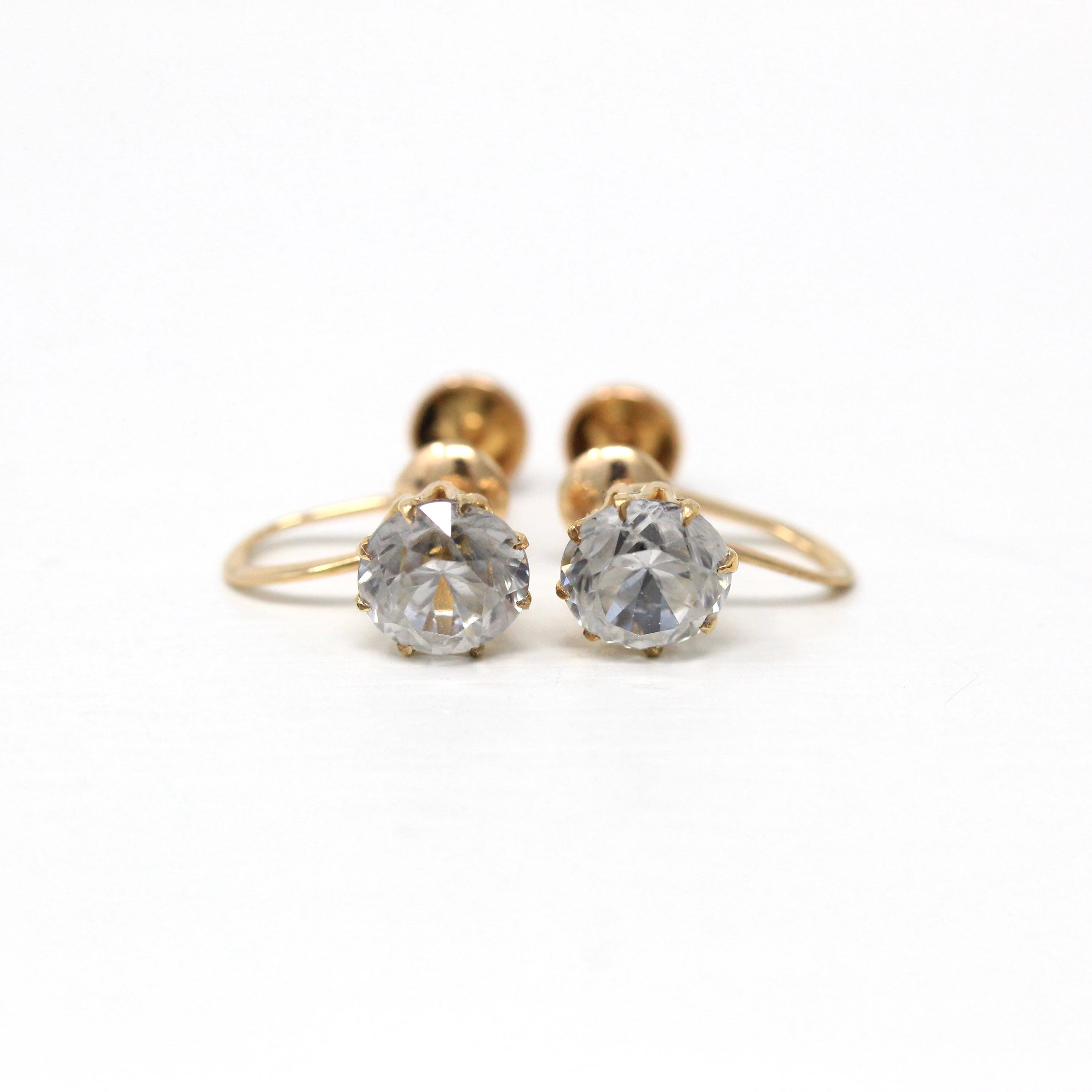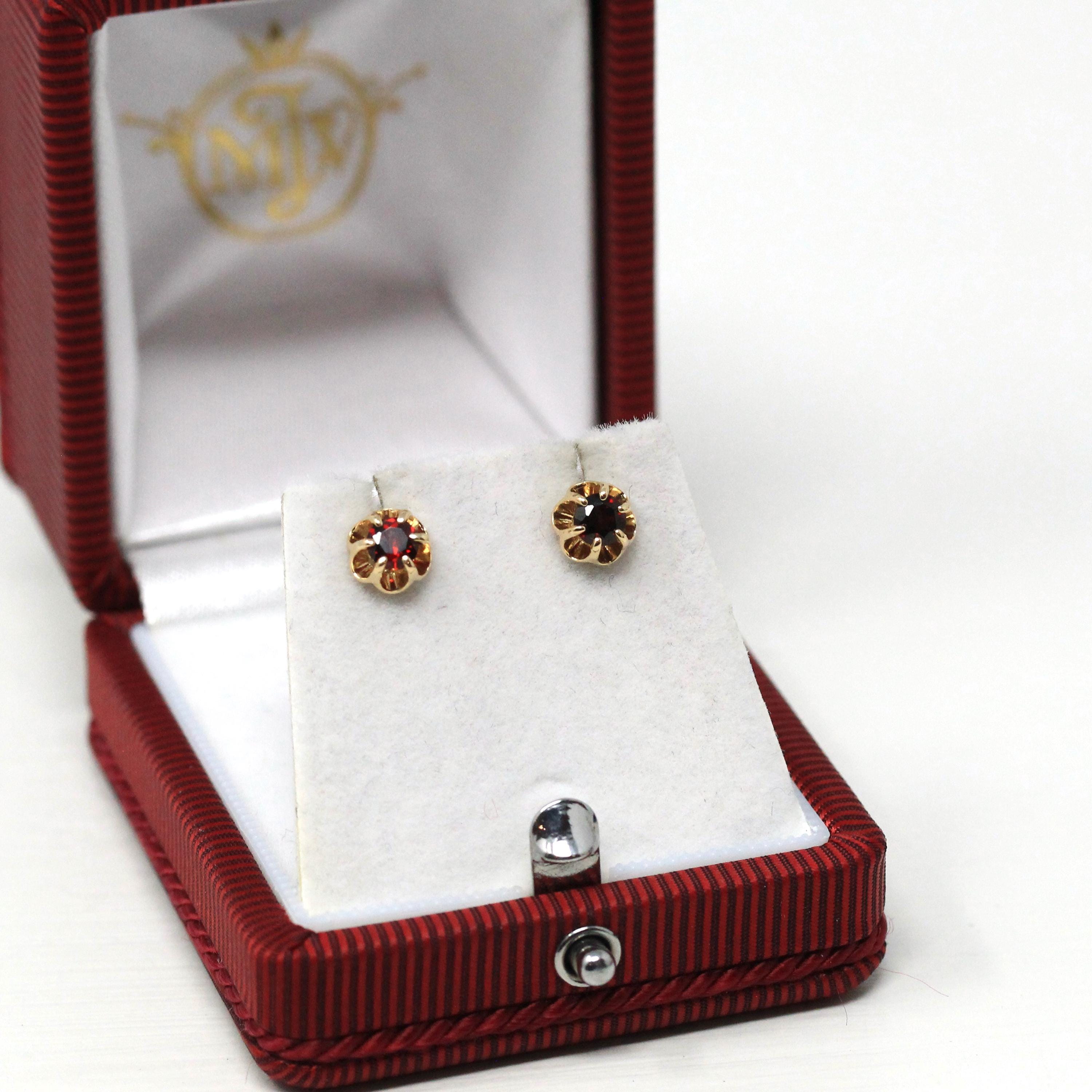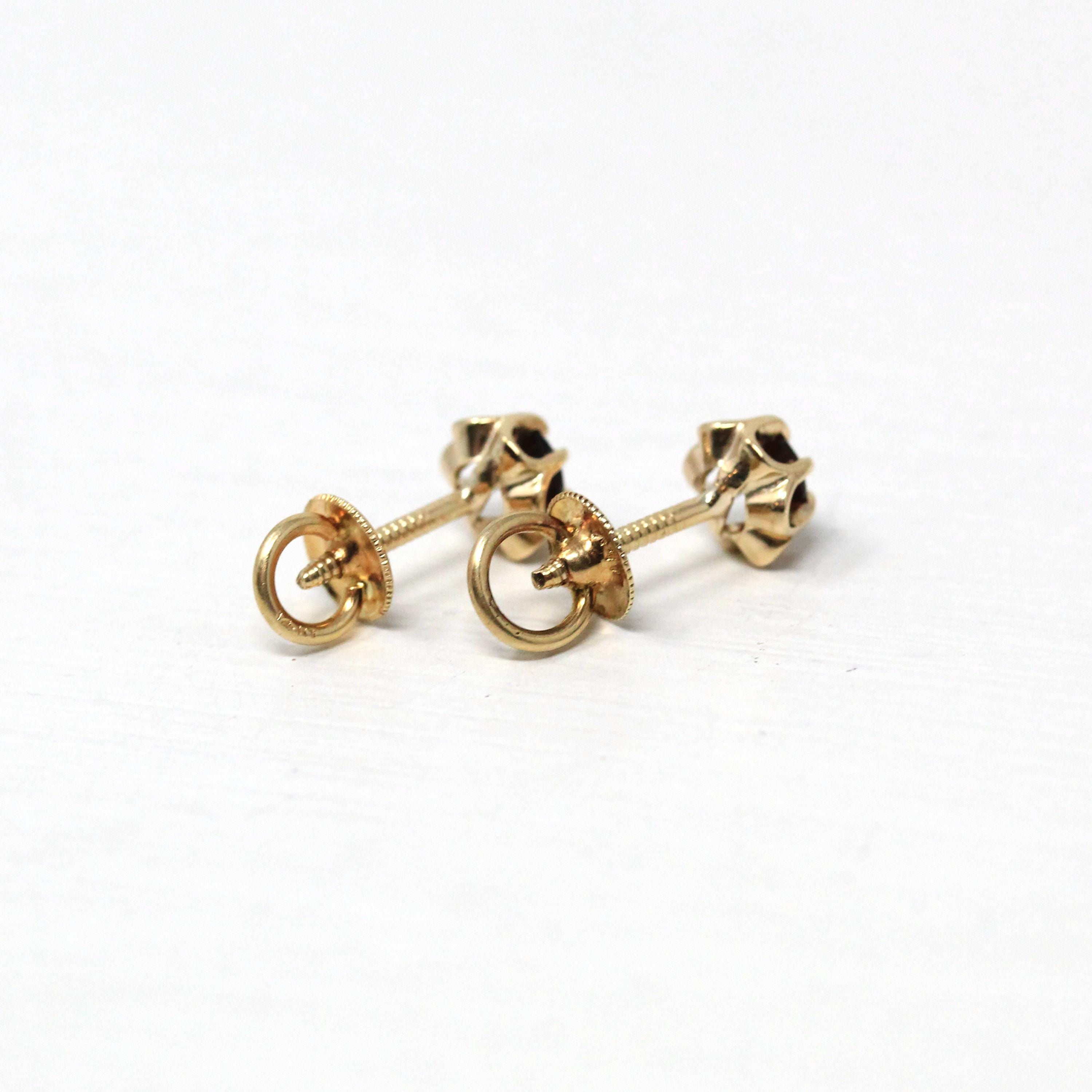 Pink Glass Earrings - Retro 10k Yellow Gold Threaded Push Backs Pair - Circa 1940s Era Round Faceted Pink Red Stones Fine 40s Jewelry
