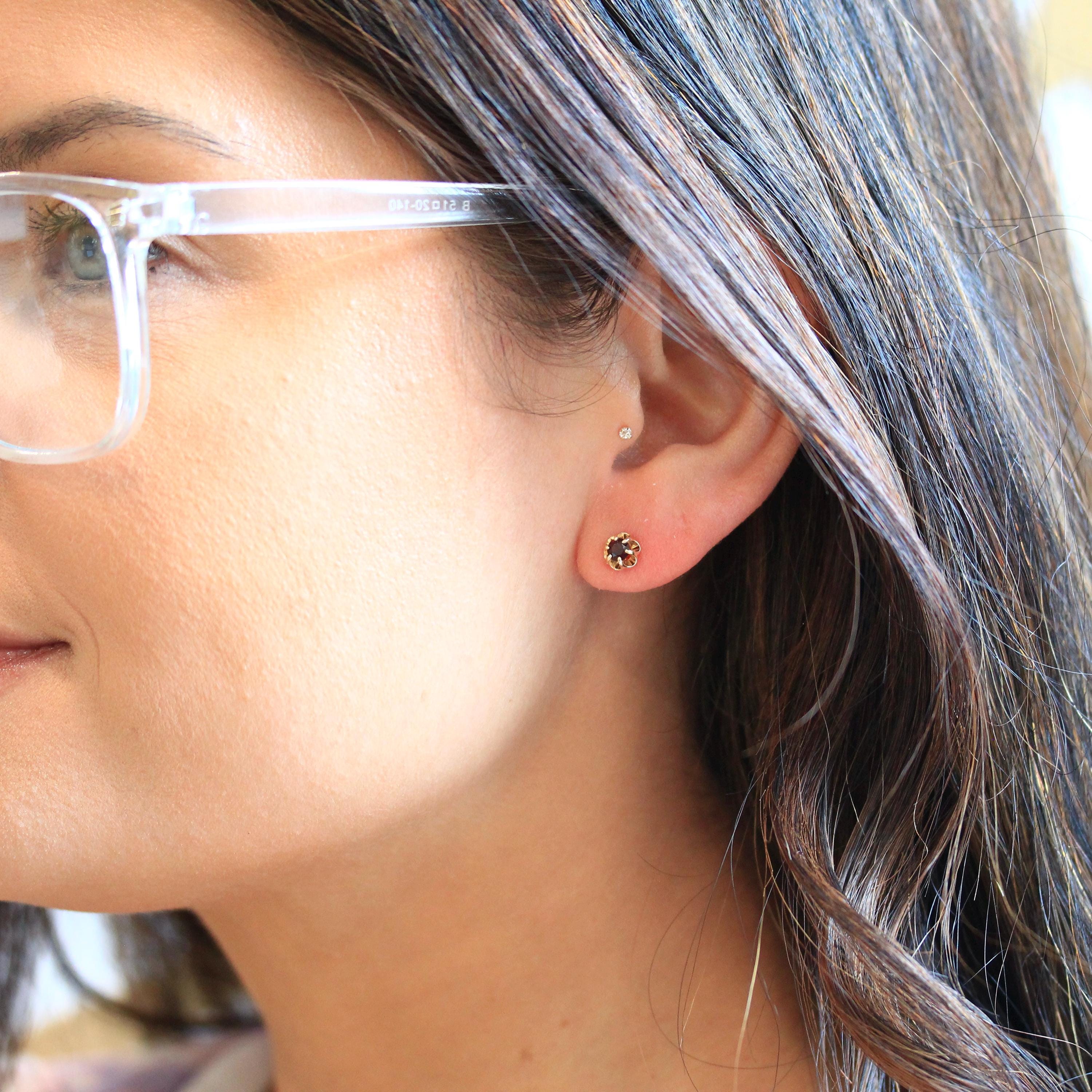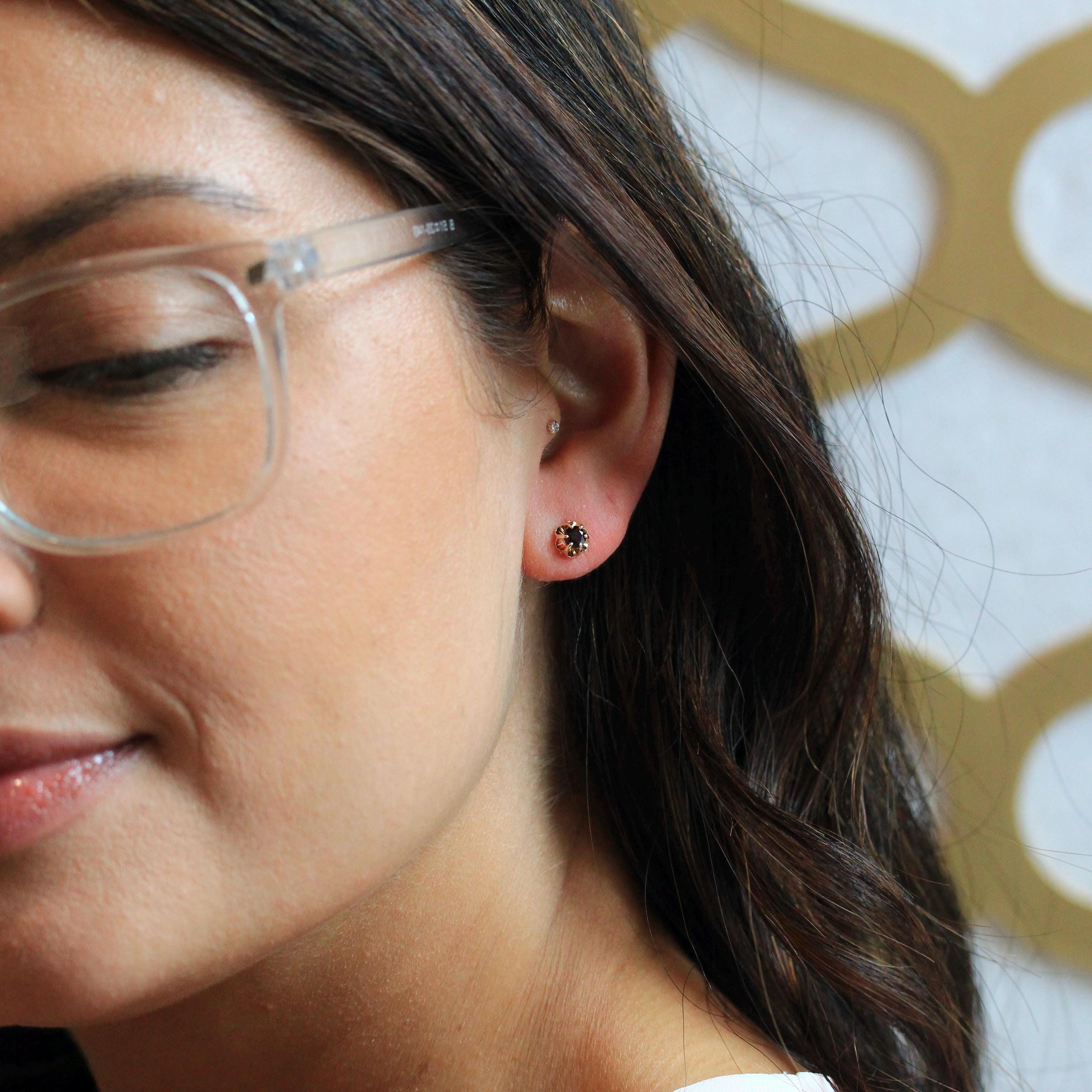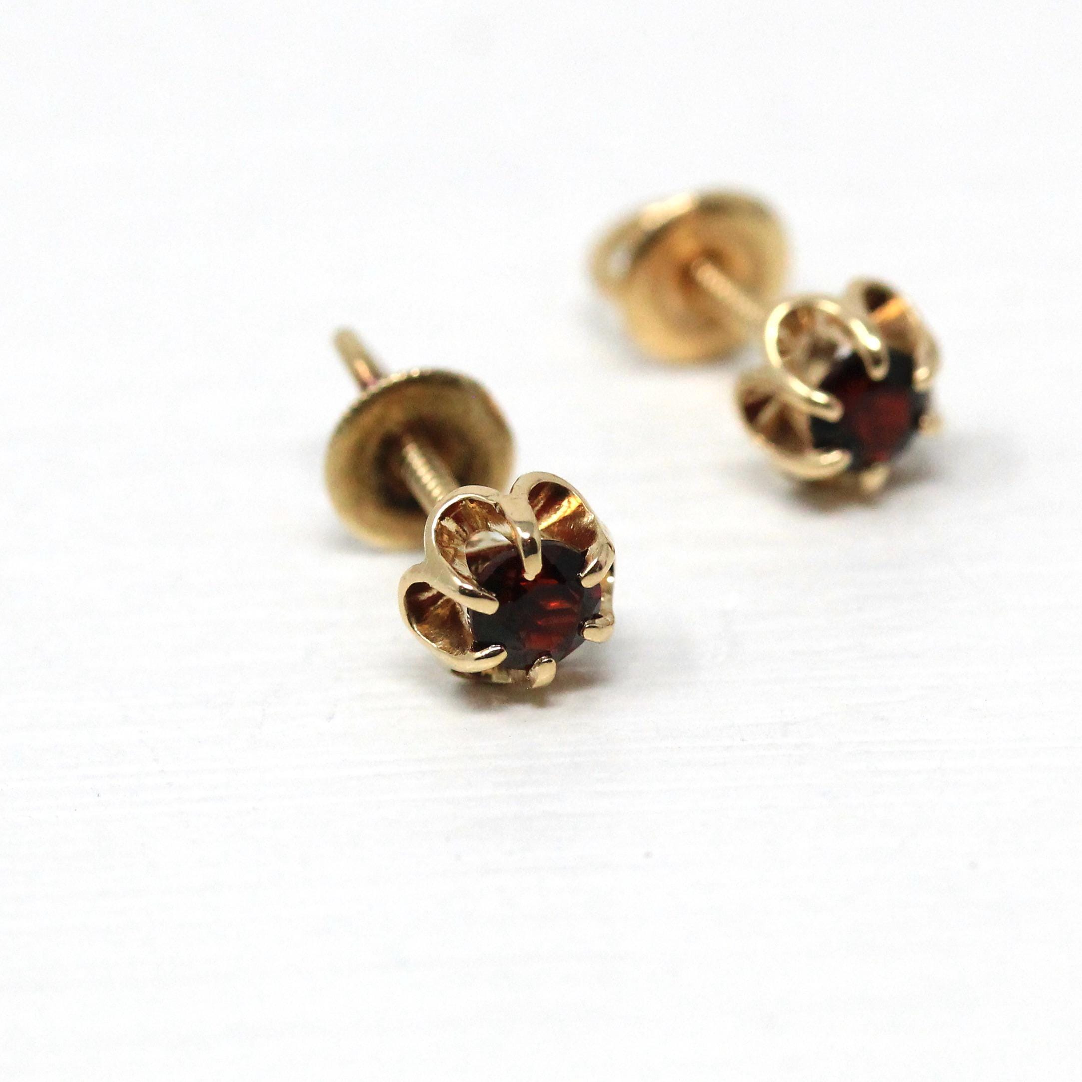 Pink Glass Earrings - Retro 10k Yellow Gold Threaded Push Backs Pair - Circa 1940s Era Round Faceted Pink Red Stones Fine 40s Jewelry