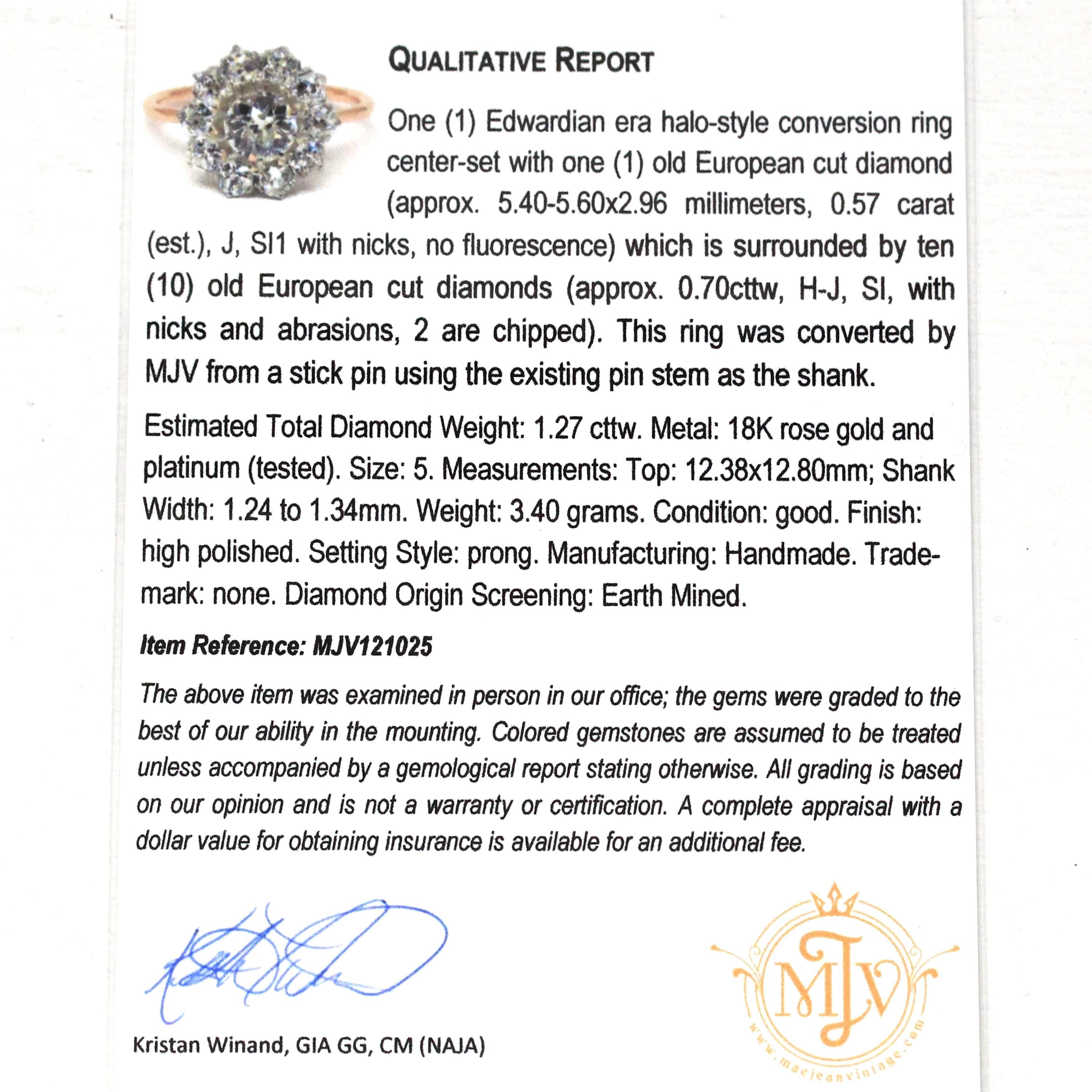 Incredible antique 18k rose gold and platinum diamond halo engagement ring from the early 1900s! This amazing sparkly handmade ring was converted from an early 1900s stick pin, with the 18k rose gold pin becoming the shank and the decorative platinum pin head becoming the ring head. The center of the halo features one old European cut .57 carat diamond that is slightly raised and surrounded by ten old European cut diamonds. The ring comes with an independent Qualitative Report by a GIA Graduate Gemologist. Phenomenal sparkly diamond ring, perfect for an engagement ring!