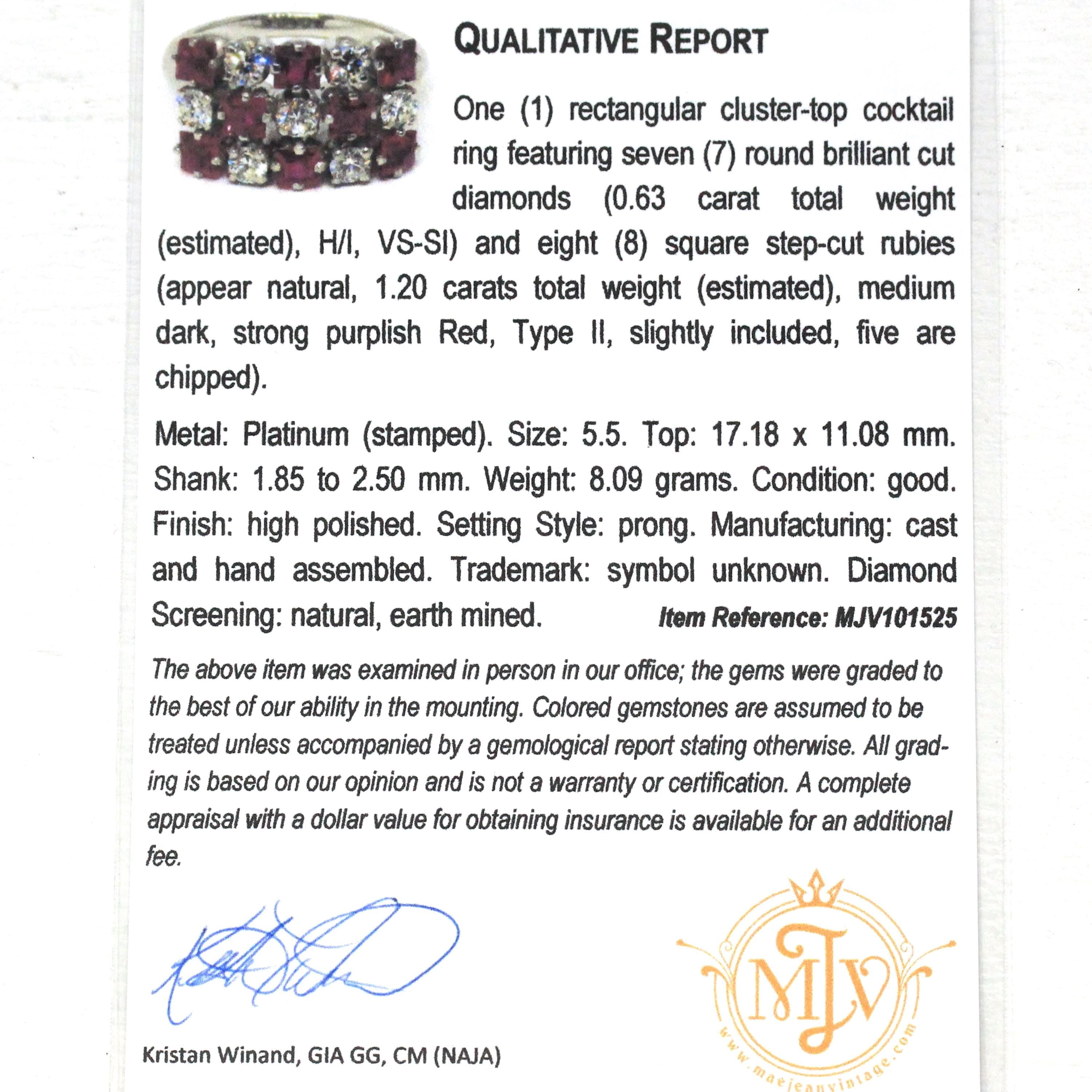 METAL / MATERIAL - Platinum, 7 round brilliant cut diamonds (approx. .63 ctw, H/I color, VS-SI clarity), 8 square step-cut rubies (appear natural, 1.20 ctw)