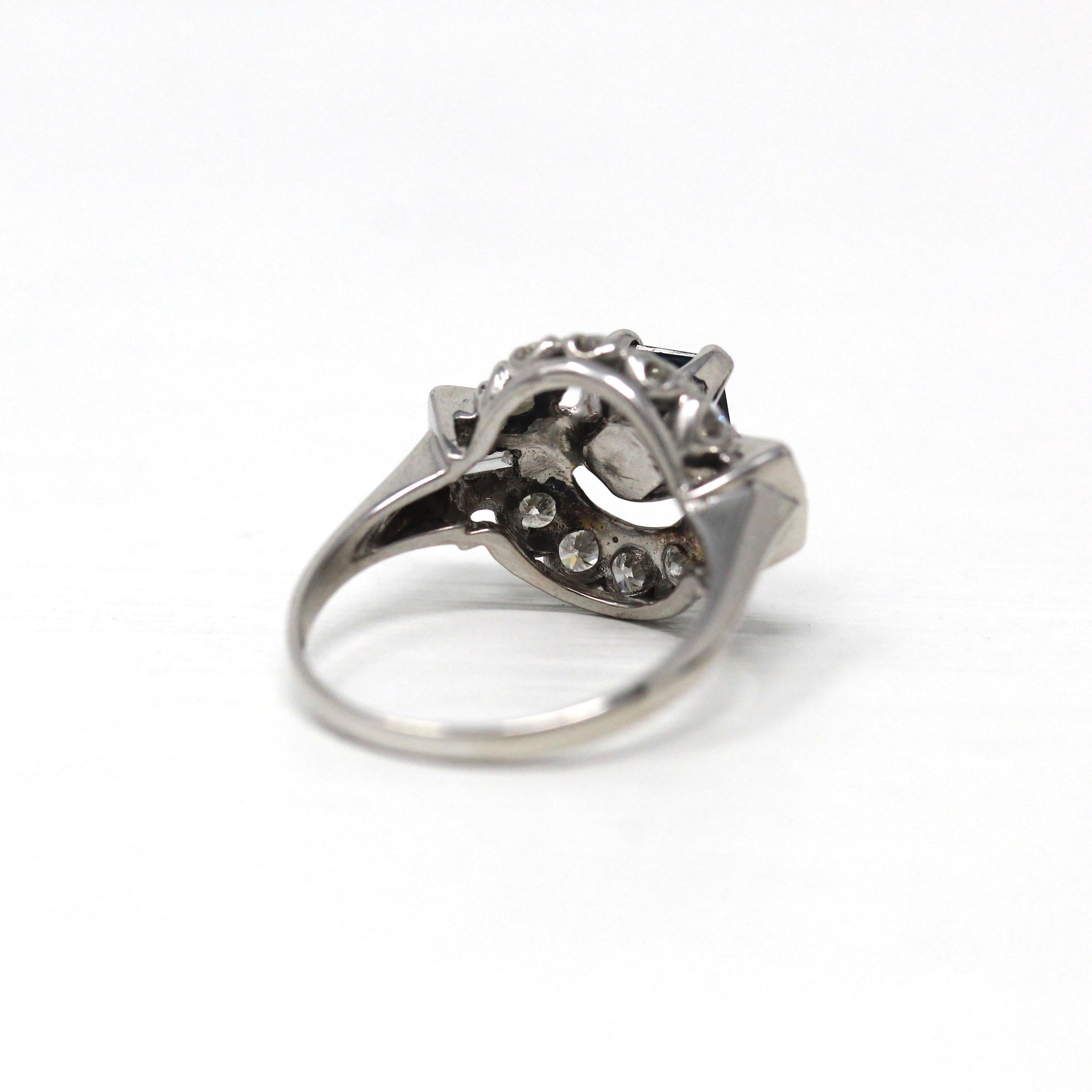 Sapphire & Diamond Halo Ring - 1980s Estate 14k White Gold .80 CT Blue Princess Round Baguette - Alternative Vintage Engagement Fine Jewelry