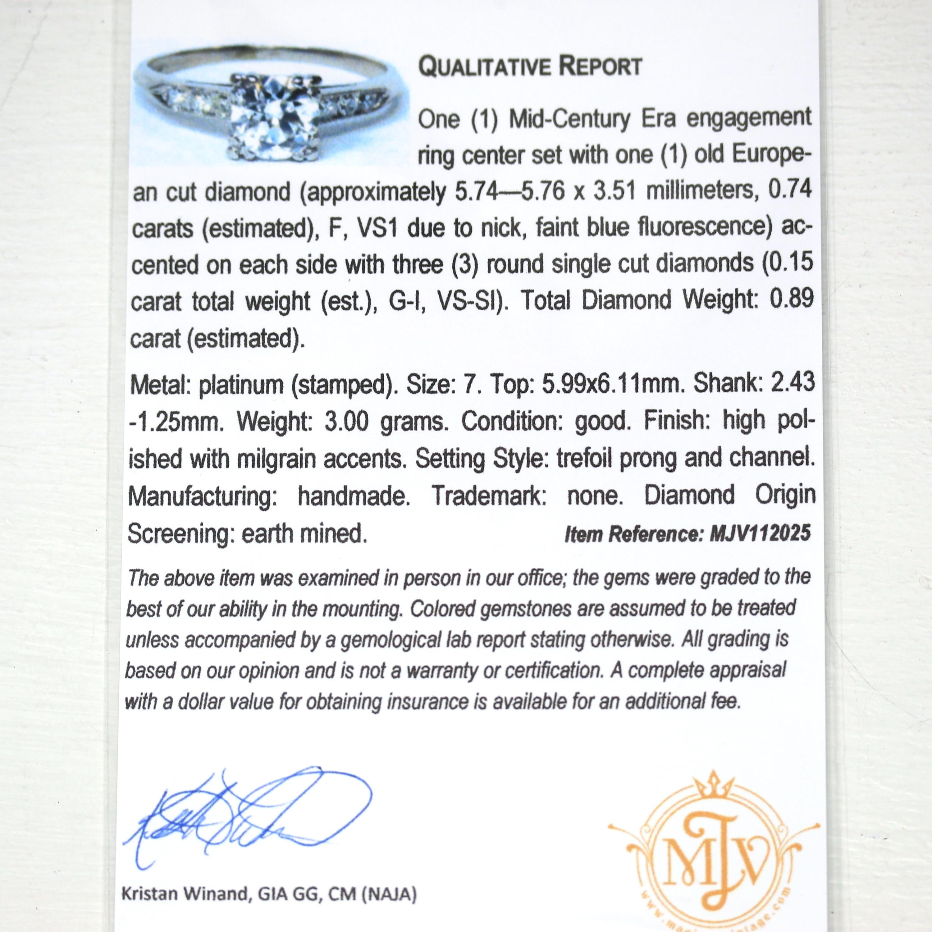Absolutely breath-taking Mid Century diamond engagement ring circa 1950s! This platinum beauty features an approx. .74 carat old European cut diamond, which is securely prong set. The ring is further accented with three sparkly round single cut diamonds on each shoulder, for a total of six. There is an estimated total diamond weight of .89 carats! An exceptional piece of fine engagement jewelry, ready to worn! The ring comes with a complimentary Qualitative Report by our in house GIA Graduate Gemologist.