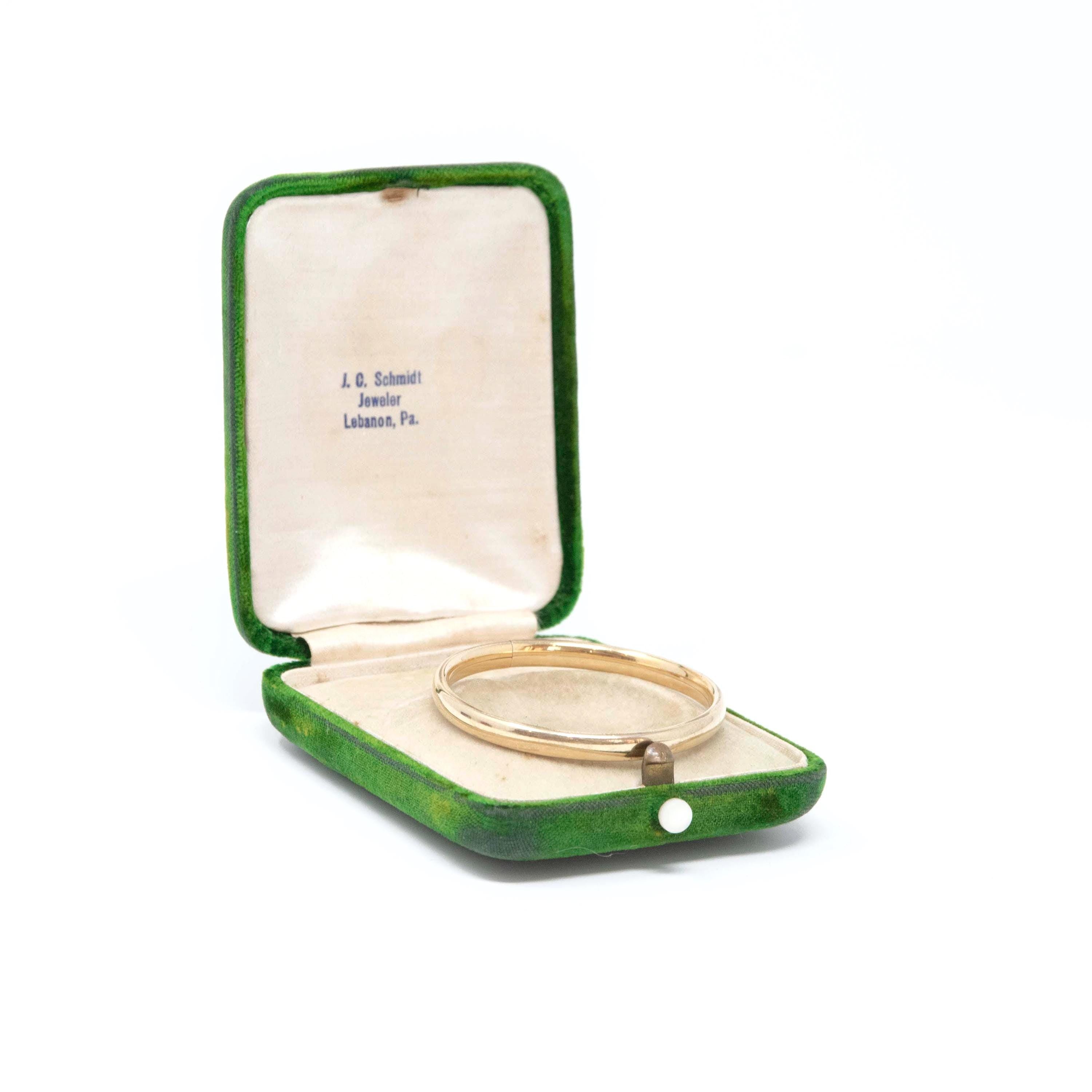 Sweet vintage circa 1960s era gold filled bangle bracelet! This classic bangle has a plain polished design with appropriate vintage wear and patina. The statement bracelet secures with a notched push tab. A beautiful piece of signed Mid Century jewelry!