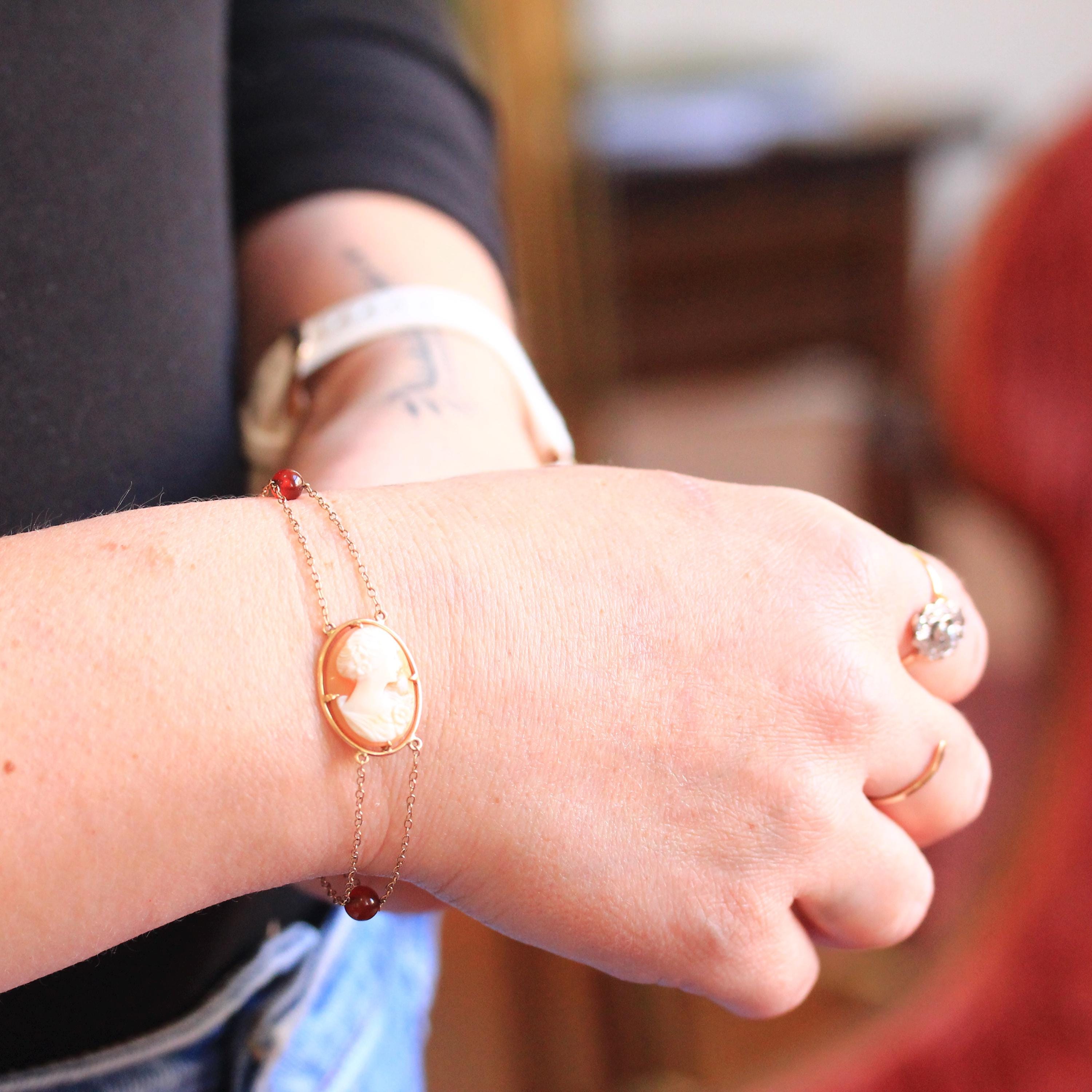 Lovely vintage circa 1940s cameo bracelet! This beautiful bracelet features double 10k yellow gold chain with a stunning carved shell cameo of a beautiful woman at it's center. The bracelet is further accented with four red carnelian beads and secures with a ring spring clasp. Sweet handmade carved cameo bracelet from the 1940s!