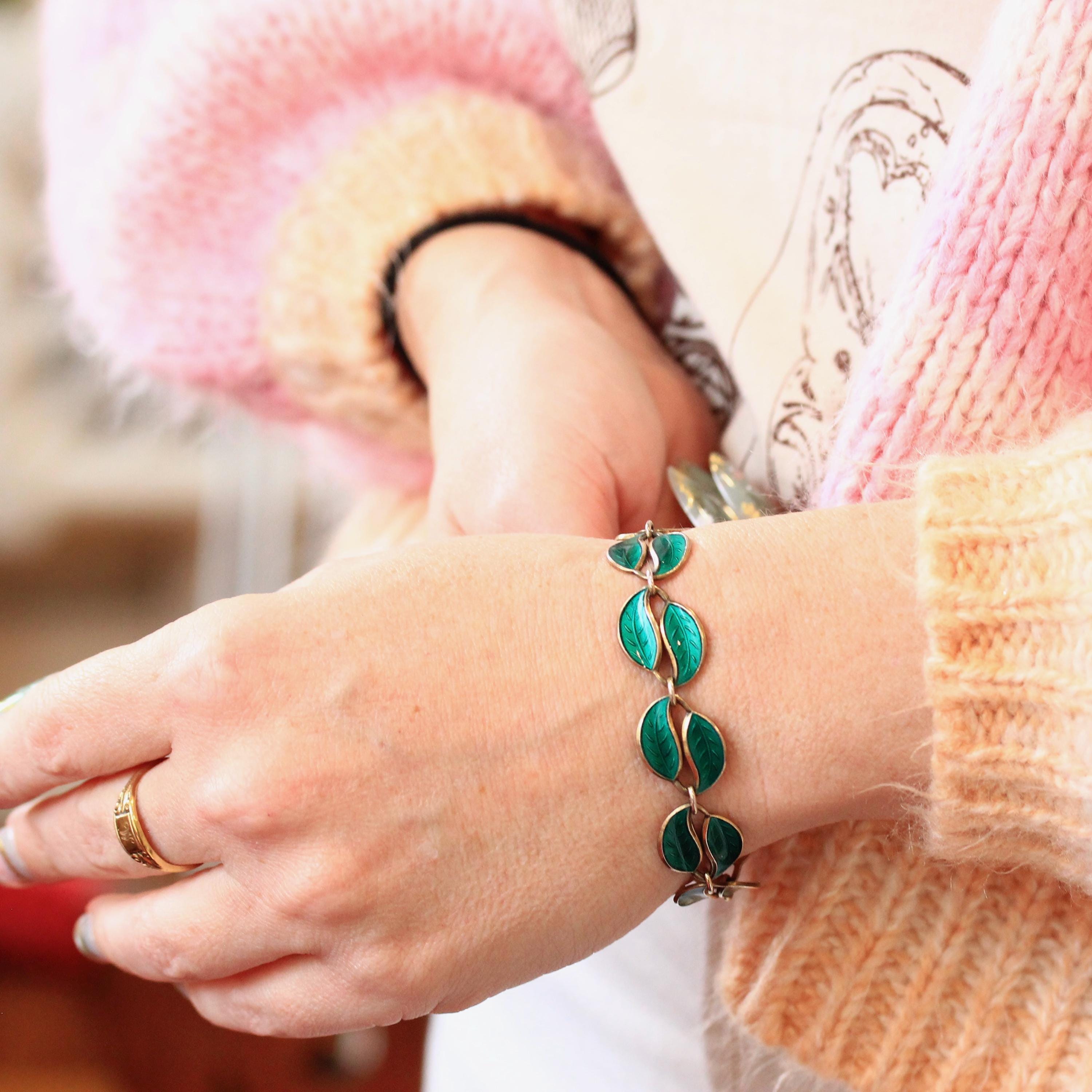 Gorgeous vintage sterling silver enamel necklace and bracelet set! This sweet jewelry set from circa 1950s has a necklace and a bracelet that are comprised of bright green enamel leaf panels connected by silver links. Each piece secures with a box clasp. A beautiful matching set of signed Mid Century era jewelry!