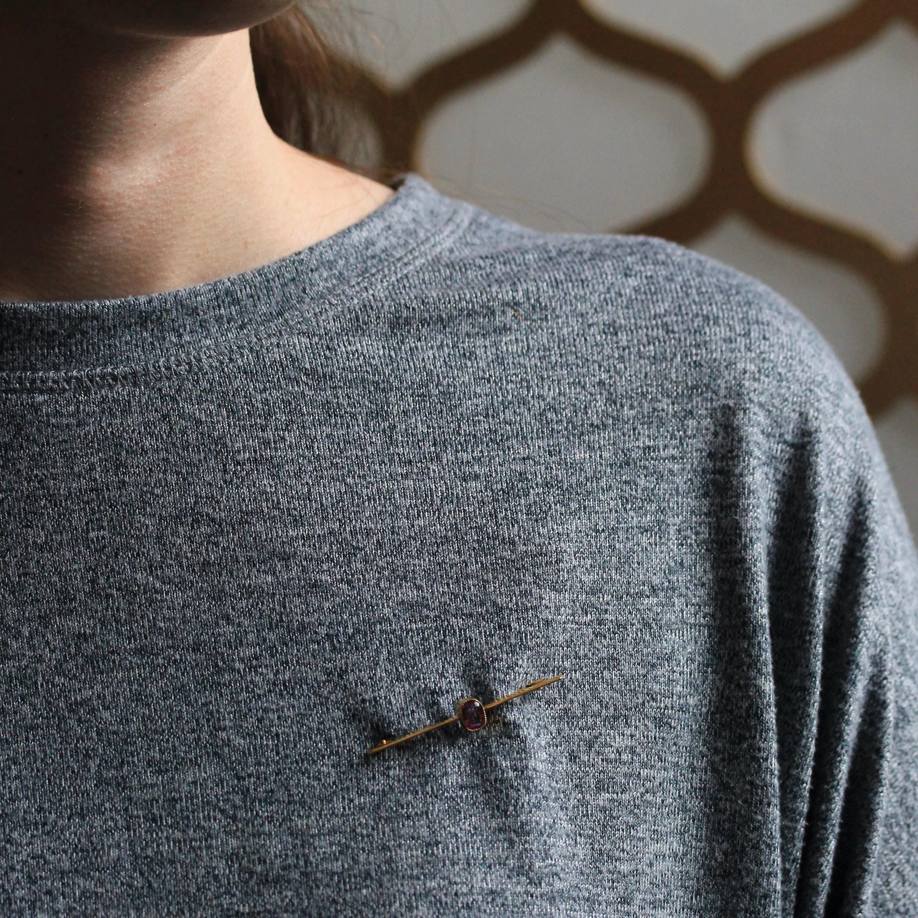 Lovely antique circa 1910s Edwardian era English 9CT yellow gold simulated pink sappgire brooch! This stylish statement pin has beautiful minimalist bar in 9CT yellow gold. There is antique cushion cut faceted simulated pink sapphire (pink glass) in the center, that is securely bezel set. A fashionable piece of fine antique jewelry, that is ready to be worn!