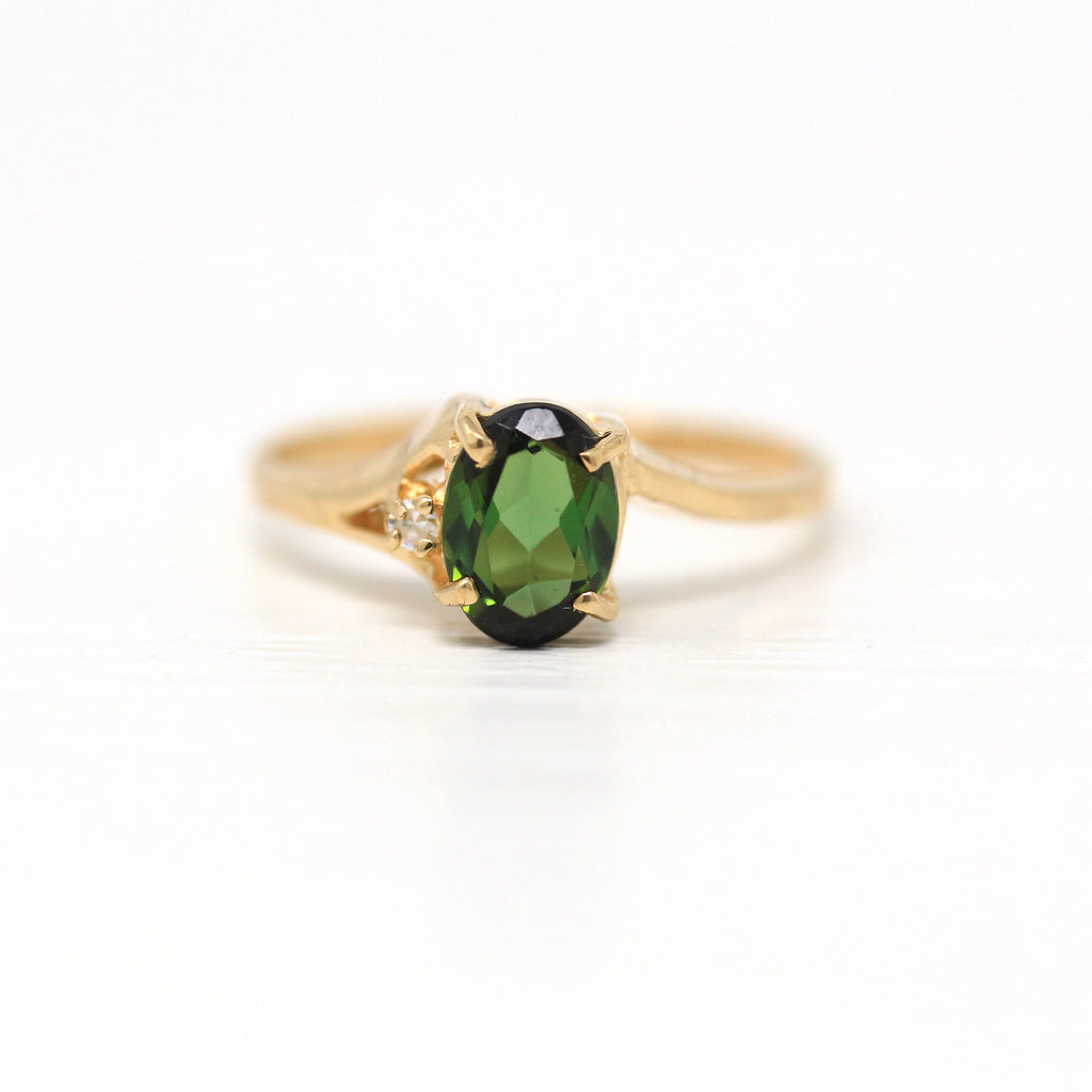 Modern Three Stone Ring - Estate 9k Yellow Gold Created Blue Sapphire & White Spinel Gemstones - Hallmarked 1989 Size 7 3/4 Fine 80s Jewelry