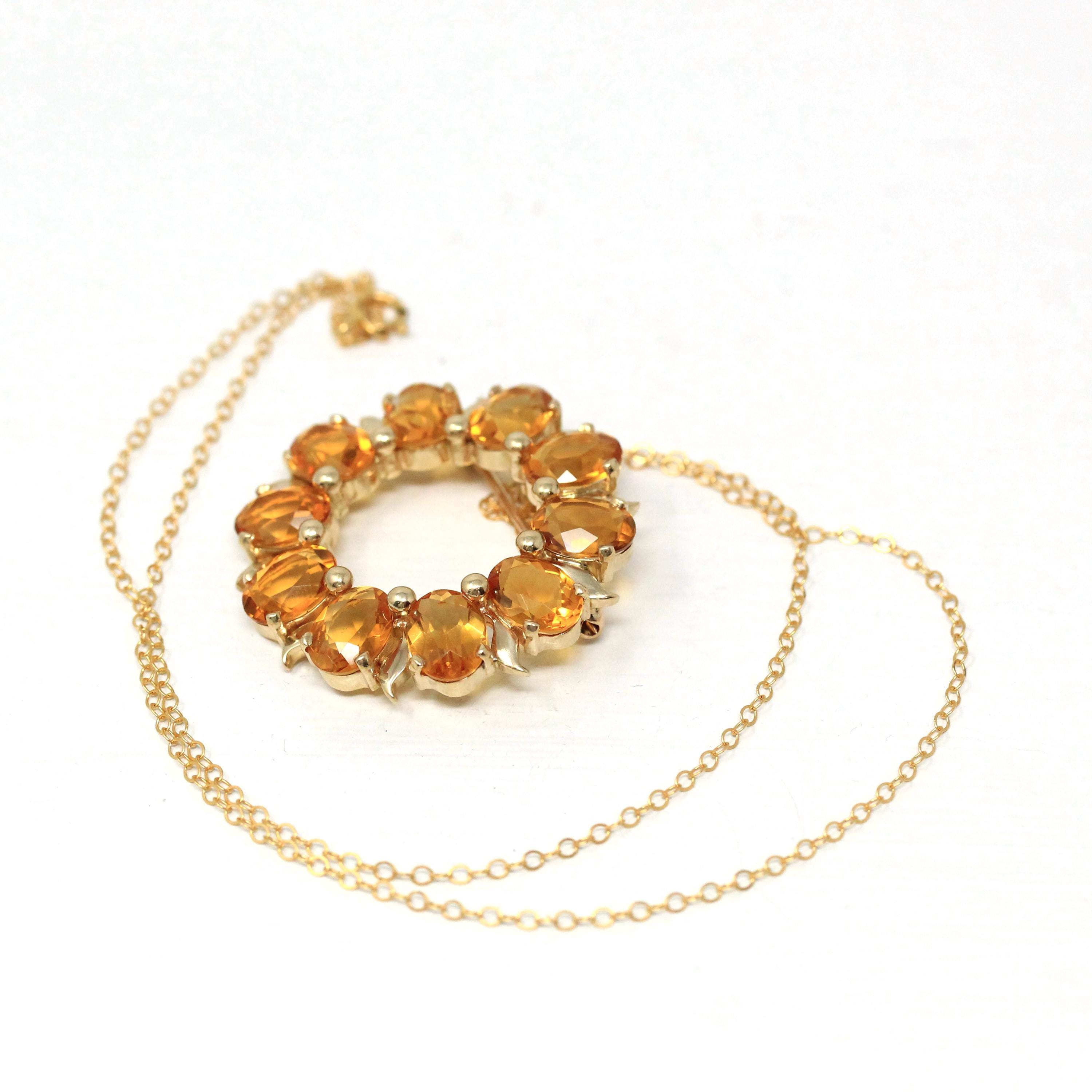 Citrine Wreath Pendant - Estate 14k Yellow White Two Tone Gold Natural Orange Gemstones - Circa 1980s Celestial Sun Brooch Necklace Jewelry