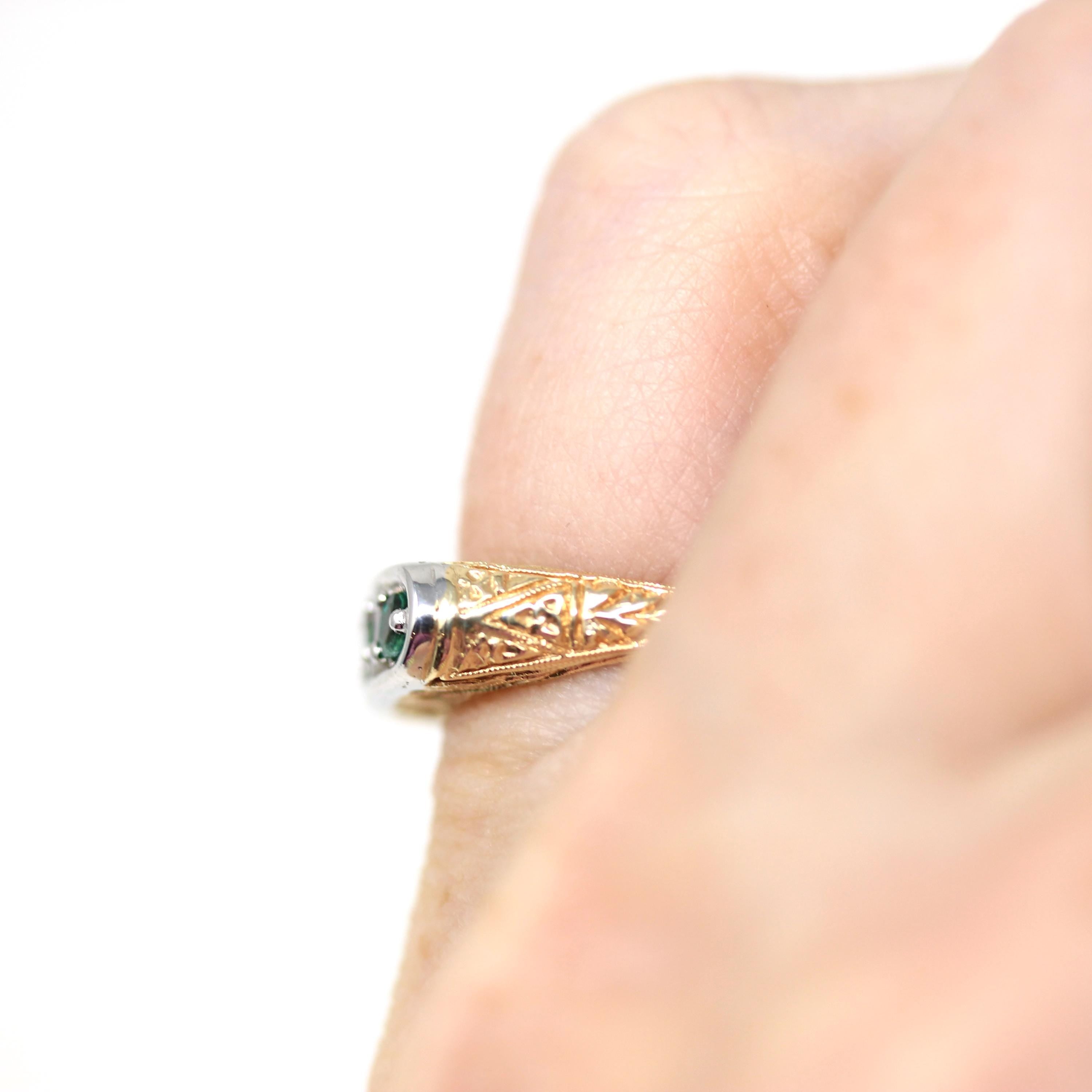 Beautiful estate 14k yellow & white gold and genuine emerald band! This vintage-style 14k two tone gold ring band features three genuine round cut emeralds set in white gold. Each sparkling gem is set securely in place by prongs, and the yellow gold shank has lovely swirl, floral, and wheat details. Absolutely stunning gold band, with lush green genuine gemstones!