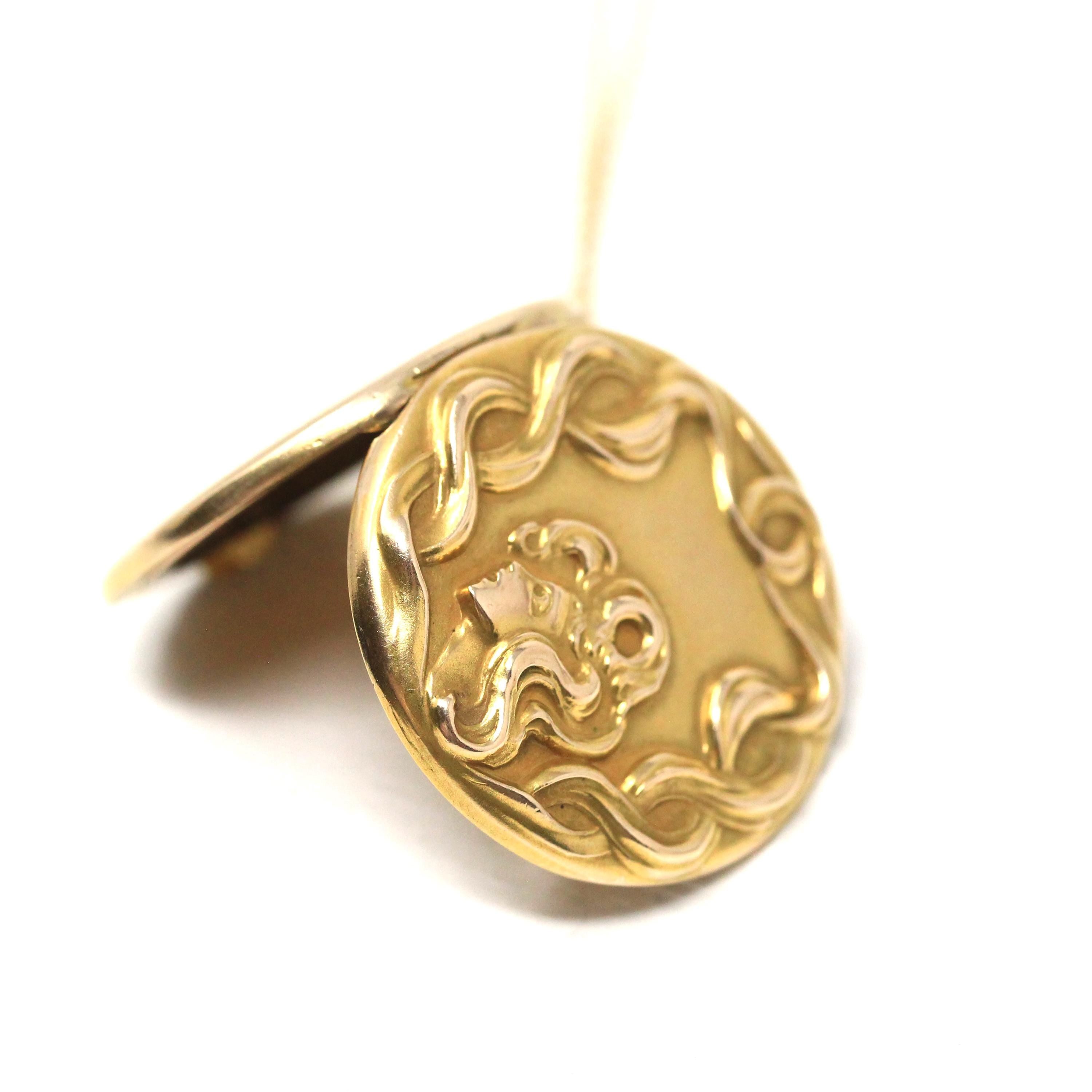 Art Nouveau Locket - Antique 10k Yellow Gold Flowing Hair Woman Pendant Necklace - Vintage 1900s Era Edwardian Letters Initials Fine Jewelry