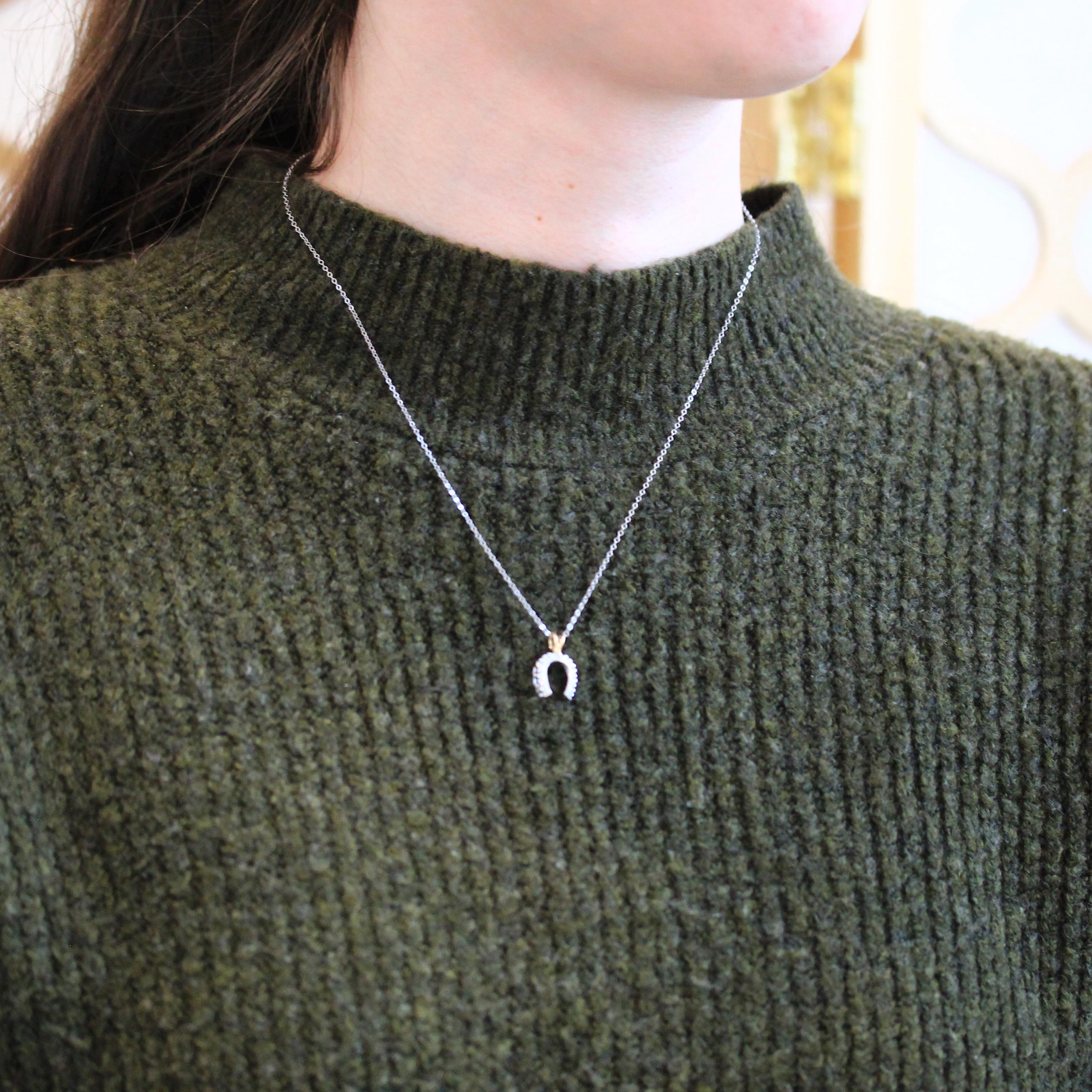 Gorgeous vintage circa 1950s era Mid Century 14k white and yellow gold diamond horseshoe pendant! This stunning charm is a 14k white gold horseshoe shape, that is prong set with natural round diamonds. A fashion forward 14k yellow gold rabbit ear bail was added to the top by our jeweler, and the lovely pendant is shown modeled on a brand new 10k white gold 18" adjustable chain. A classic piece of fine Mid Century era jewelry!