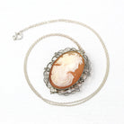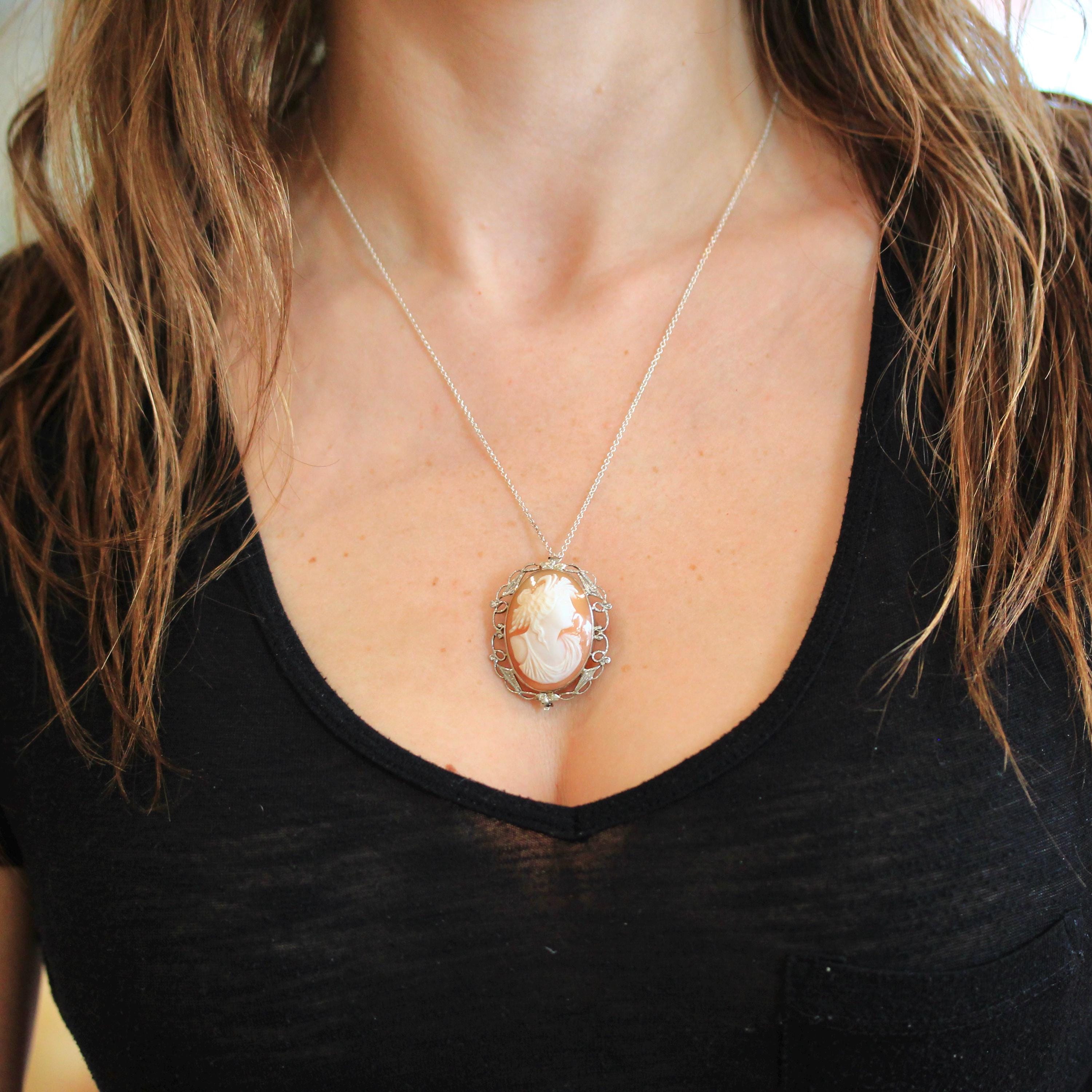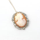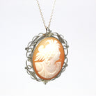 CONDITION - Good vintage condition. White gold metal has been professionally polished and cleaned. Very little age consistent patina and wear remains. Cameo is gorgeous with intricate carvings and is securely bezel set. Stunning vintage cameo shell necklace!