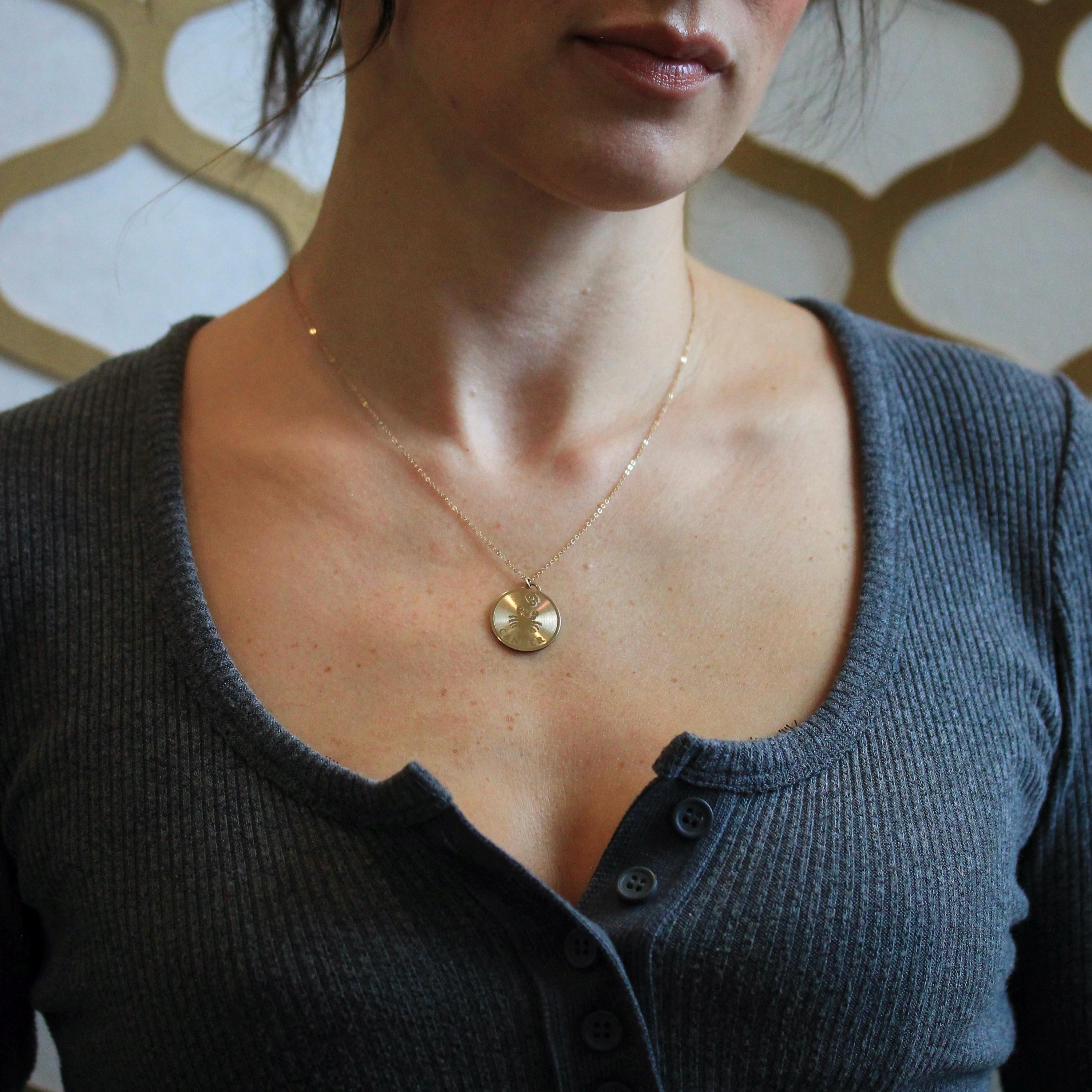 Timeless vintage circa 1970s era gold filled Cancer pendant! This classic vintage pendant has a circular shape, and displays "Cancer" at the bottom along with the corresponding stars and zodiac symbol above. The statement astrological charm is shown modeled on a brand new 14k gold filled 18" chain. An amazing piece of 1970s era zodiac jewelry, featuring the water sign Cancer!