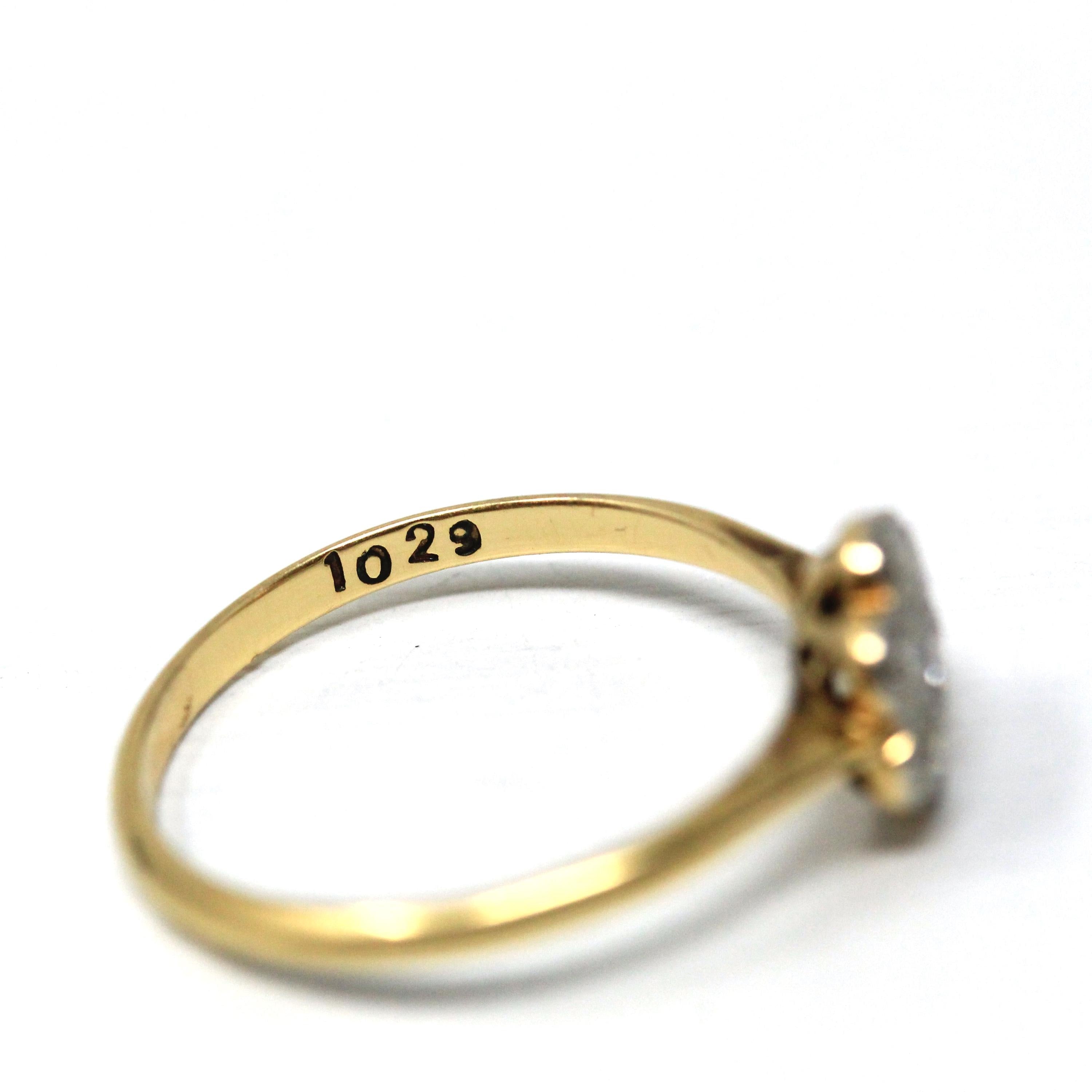 CONDITION - Good vintage condition. Yellow gold metal has been professionally polished & cleaned. Diamonds are secure in bezel settings. Minimal age consistent wear remains. Amazing vintage diamond flower ring!