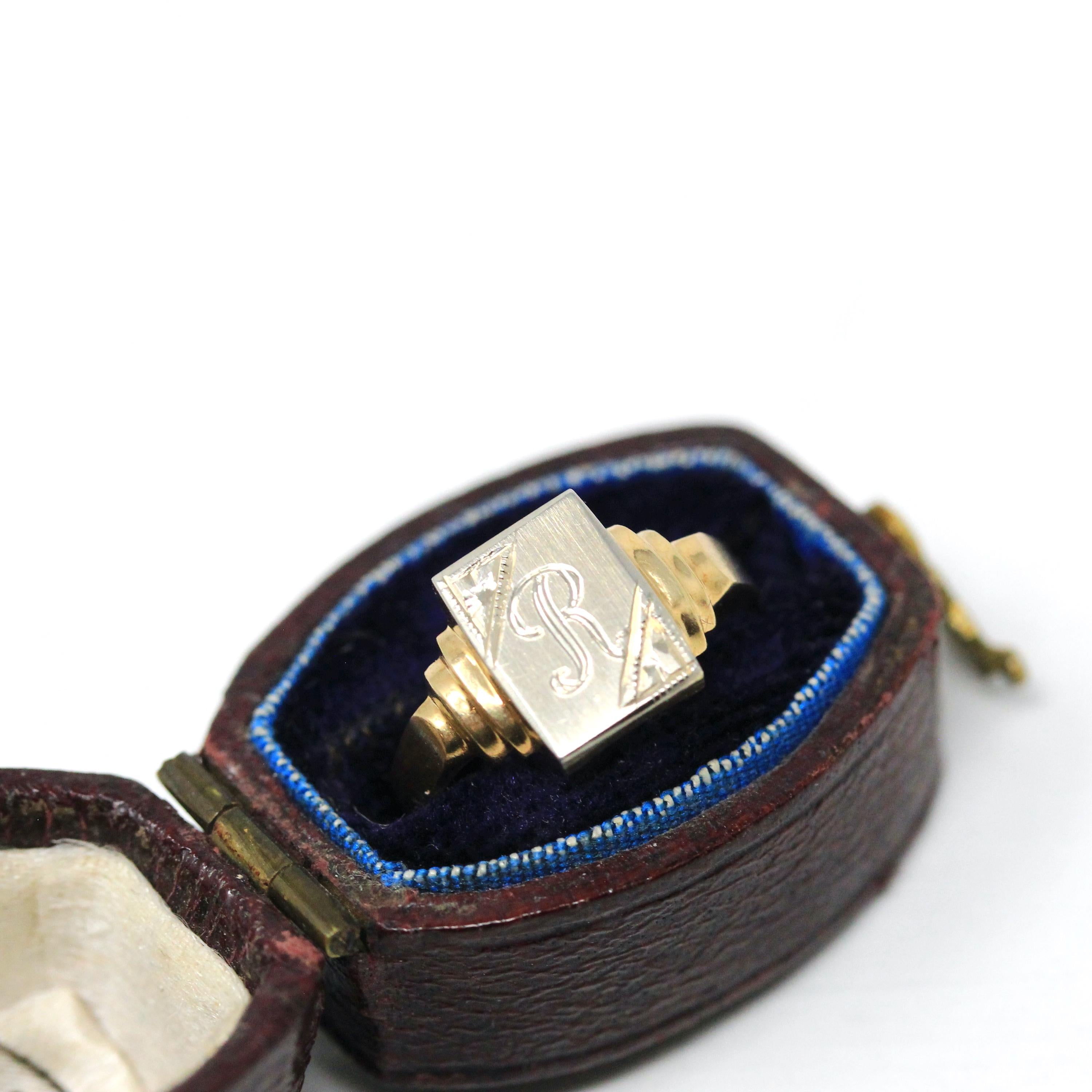 Letter "R" Ring - Retro 14k Yellow White Two Tone Gold Engraved Initial Signet - Vintage Circa 1940s Era Size 2 1/2 Pinky Midi Fine Jewelry