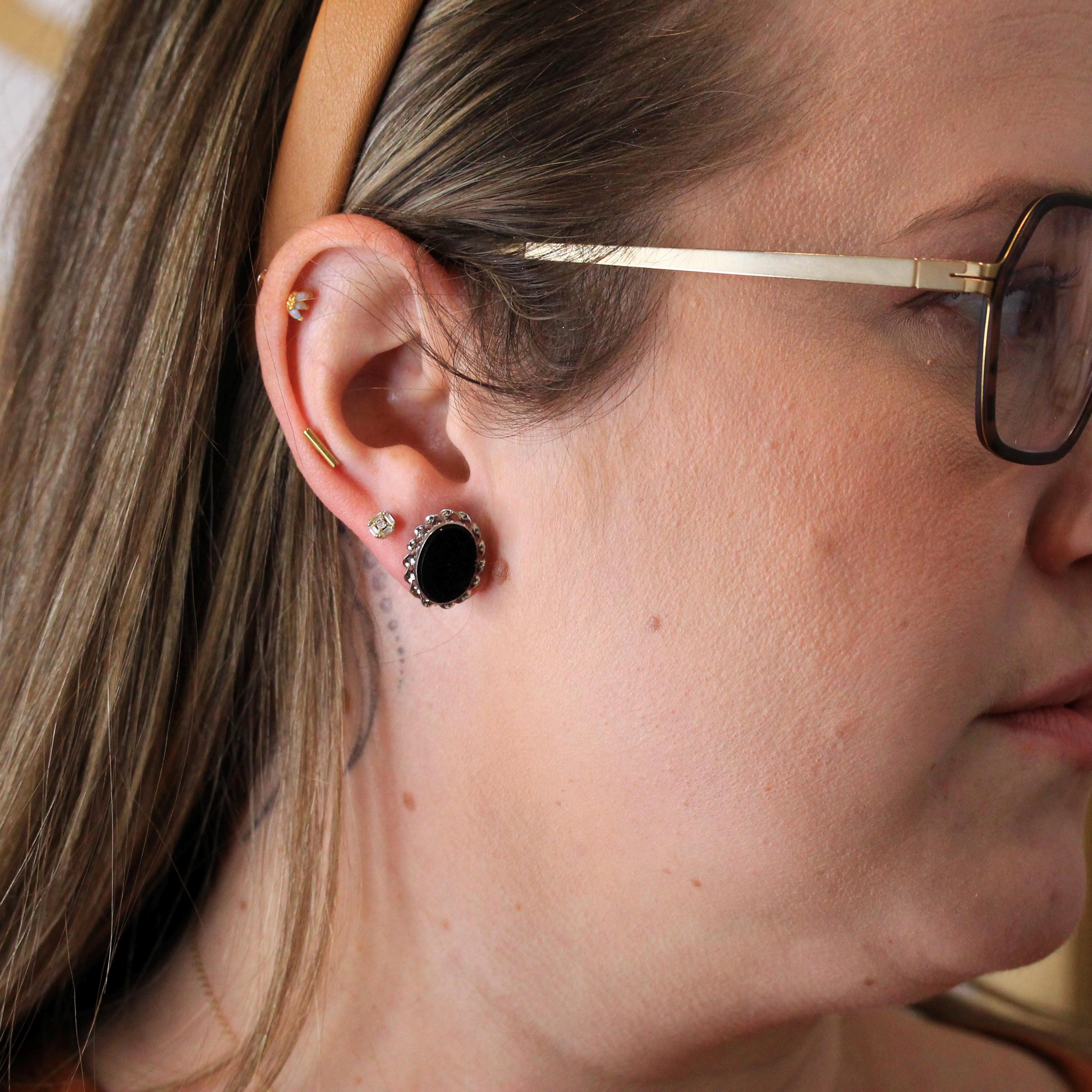 Simulated Onyx Earrings - Retro 10k White Gold & Base Metal Oval Black Glass Stones - 1960s Era Statement Fashion Accessory Fine Jewelry
