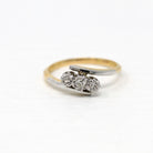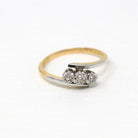Gorgeous vintage circa 1960s retro era 18k yellow gold & platinum genuine diamond ring! This classic bypass style ring features 3 diamonds set in platinum, with a total weight of approx. 1/10 ct. The ring has a two tone bypass asymmetrical setting. A beautiful piece of fine retro jewelry, featuring diamonds!