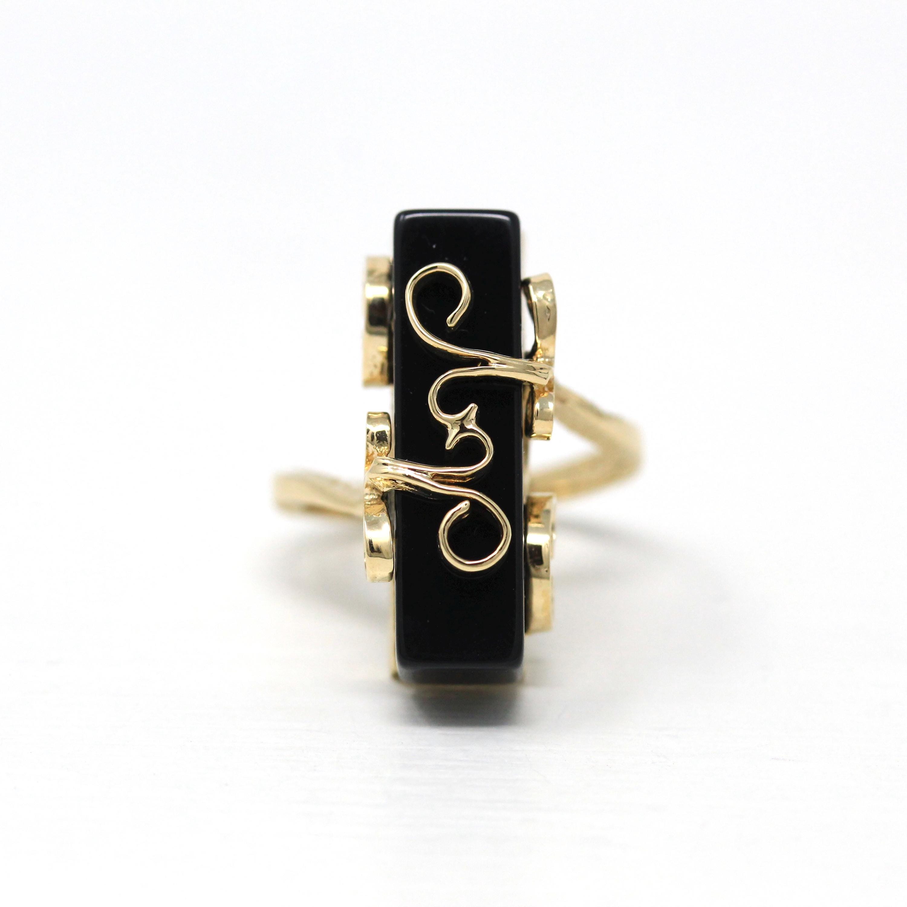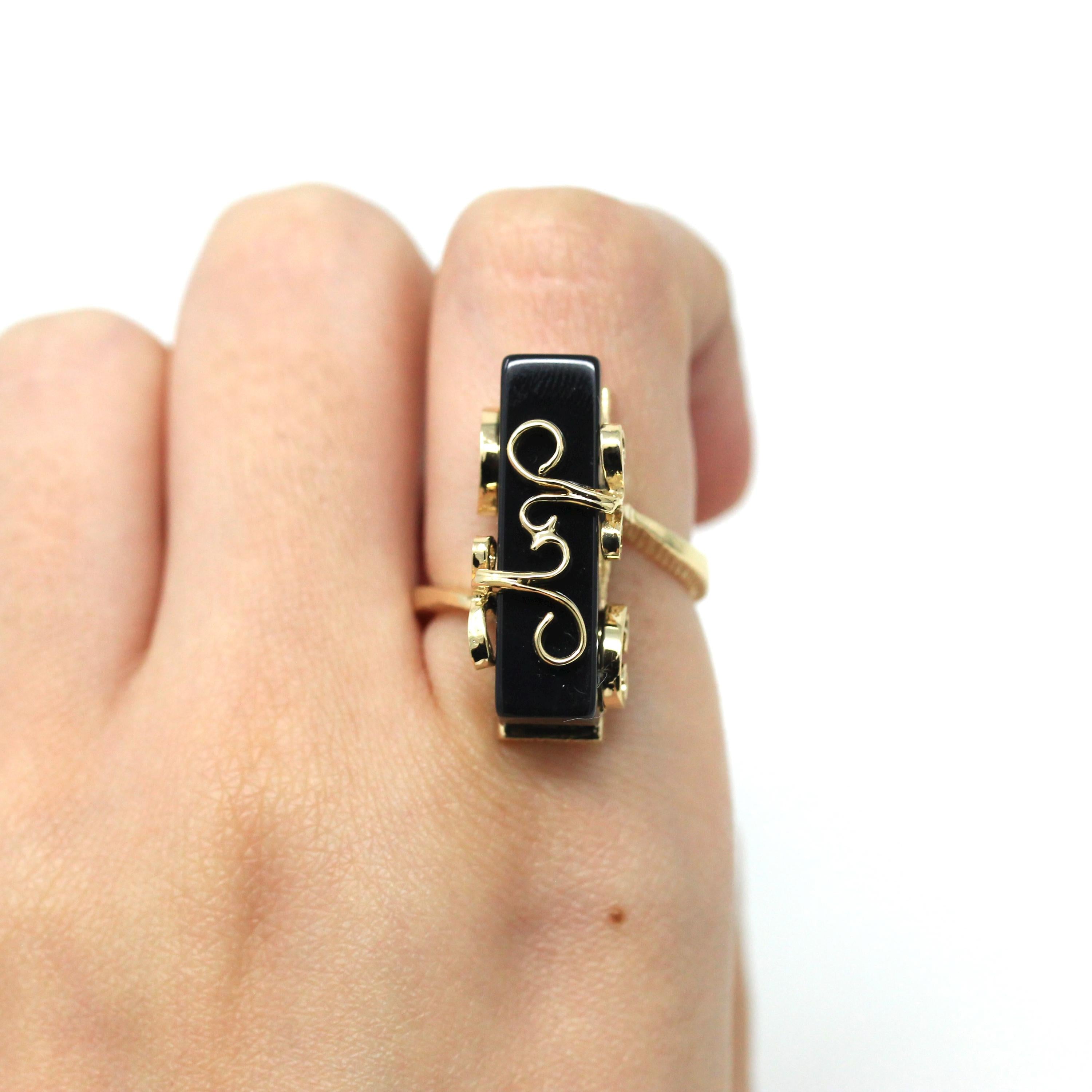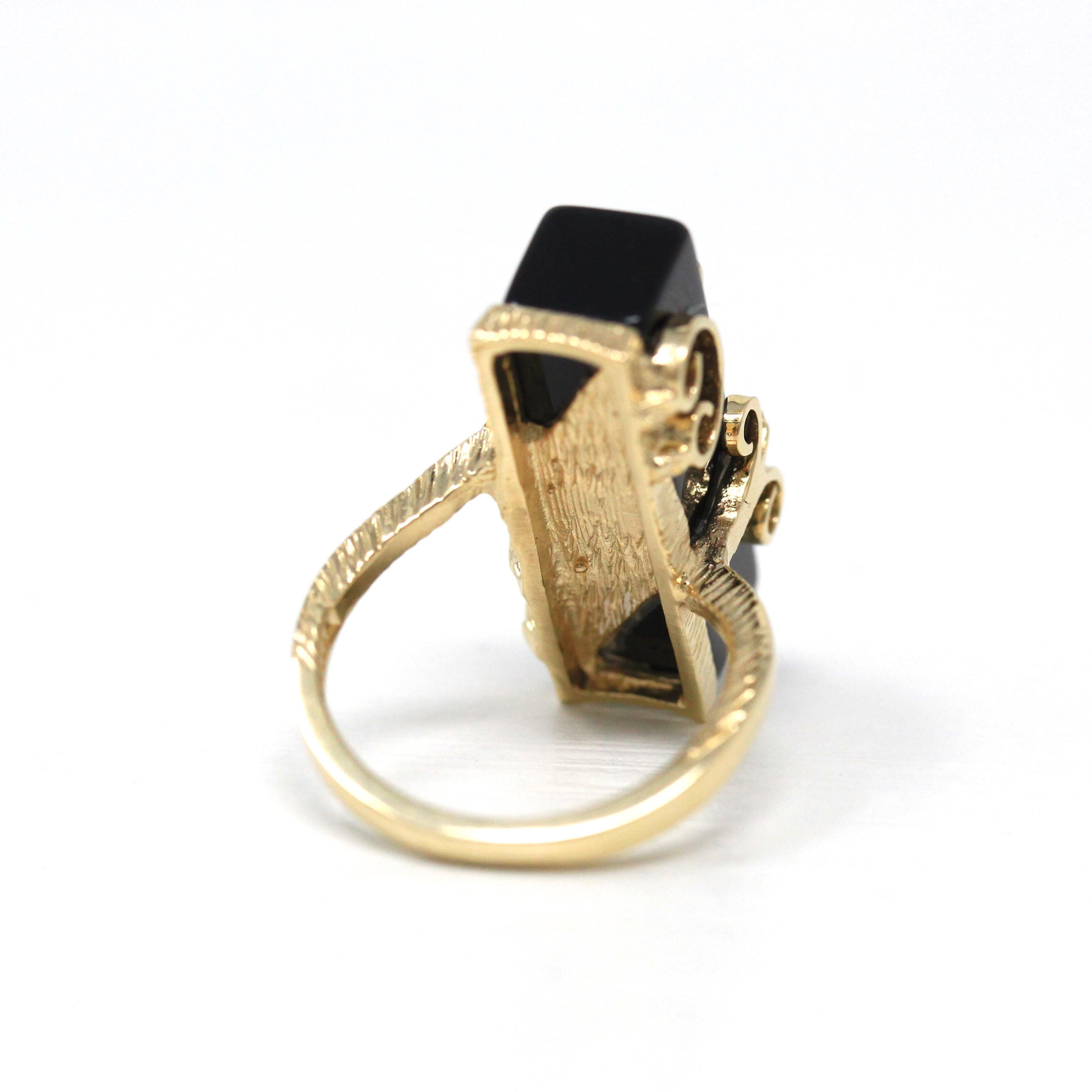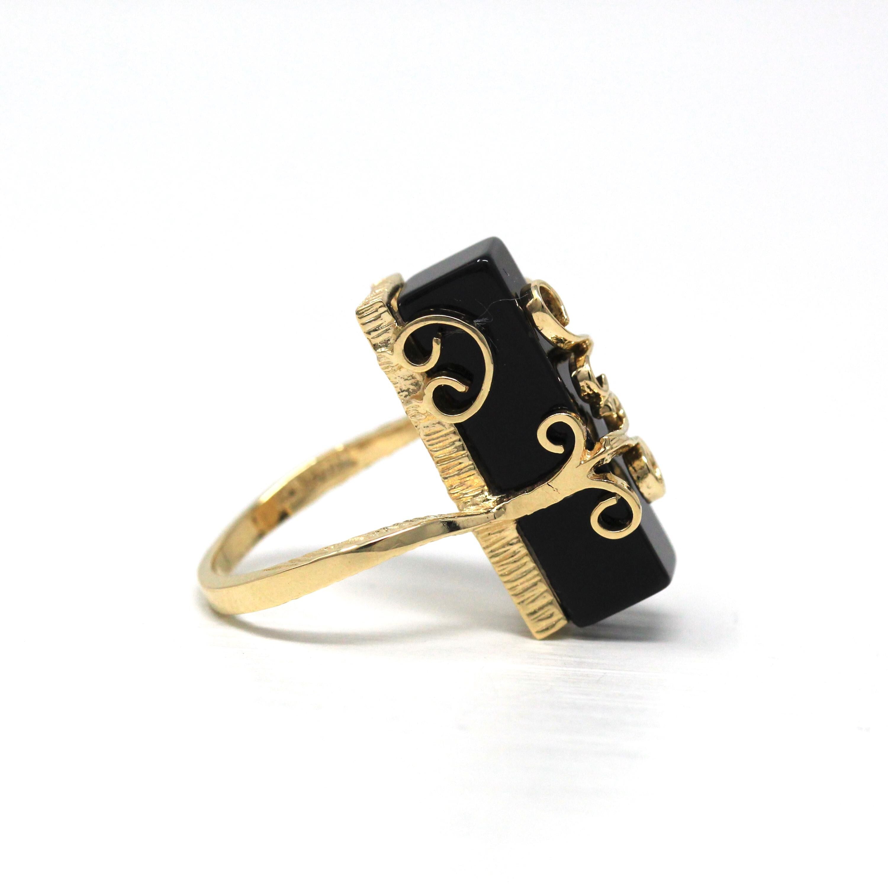 Vintage Onyx Ring - Retro 10k Yellow Gold Rectangular Cut Natural Black Chalcedony Gem - Circa 1940s Size 6 Statement Fine Diamond Jewelry