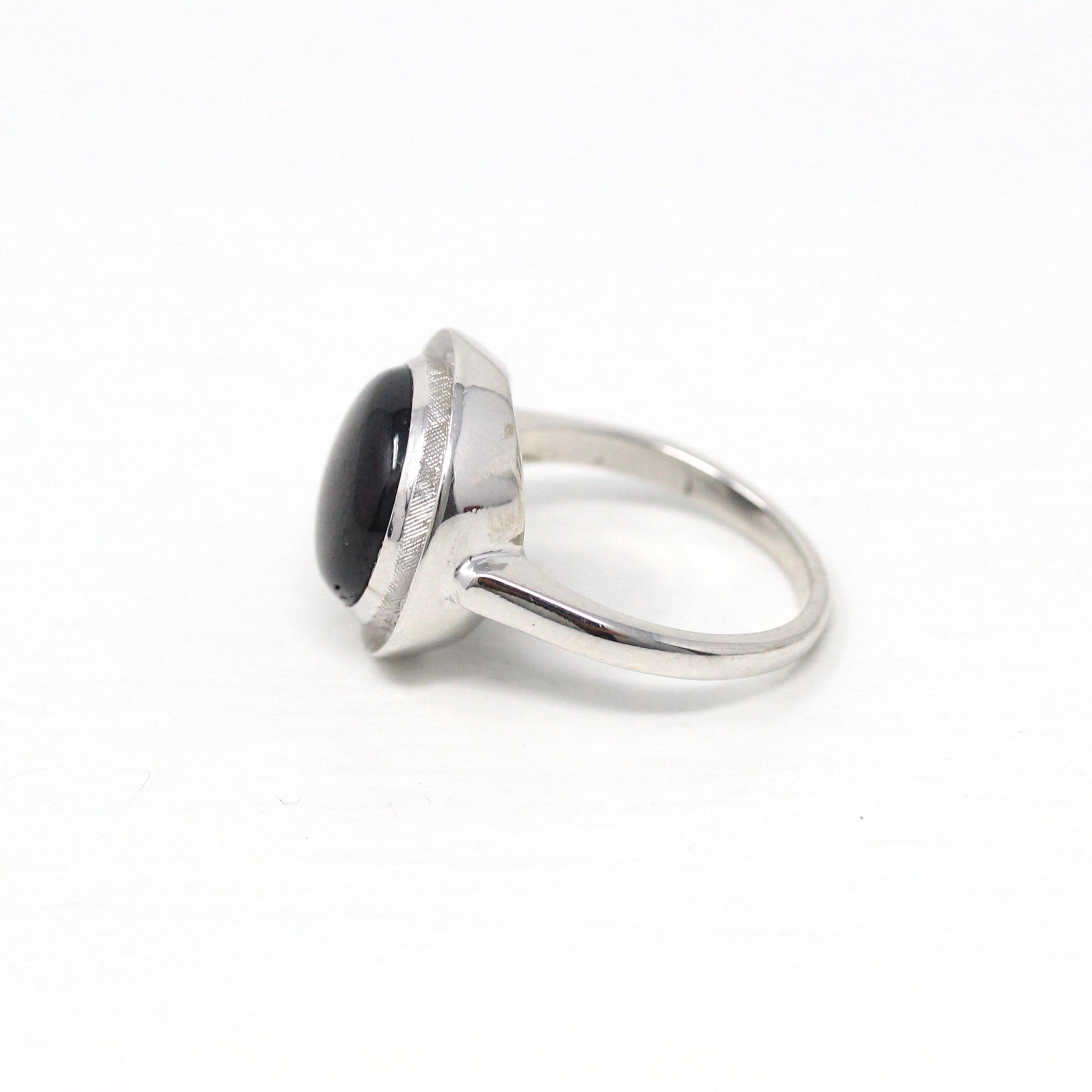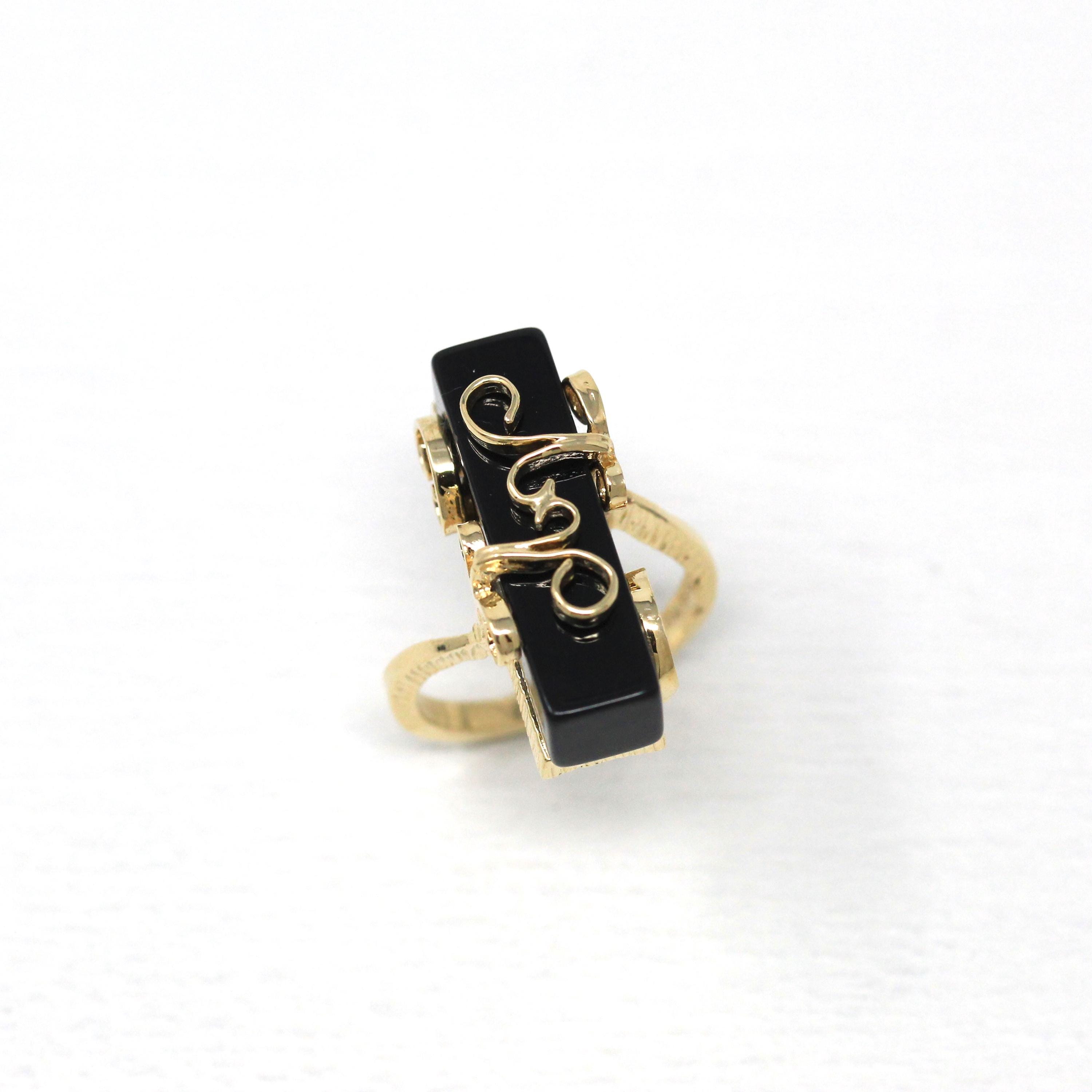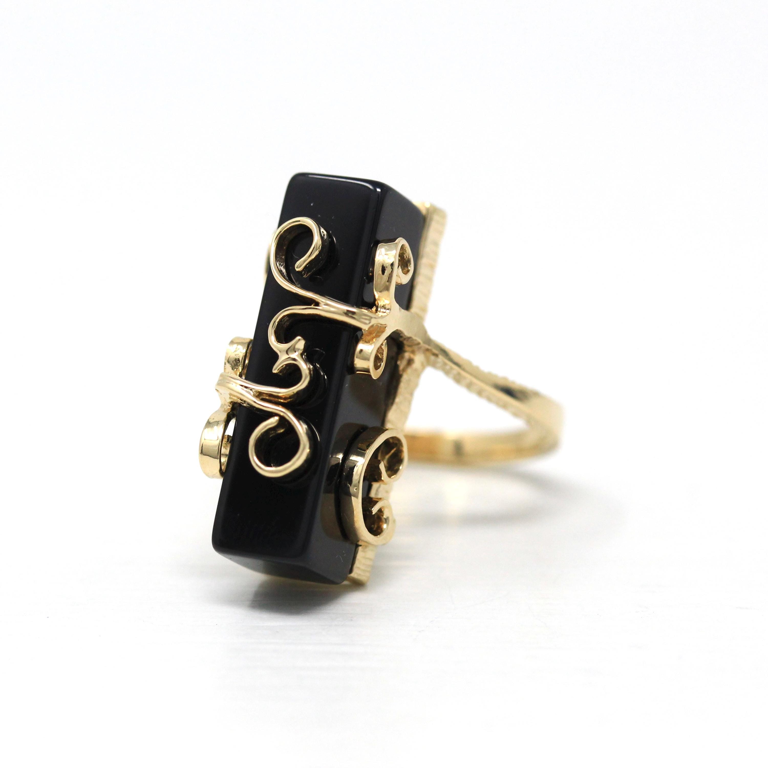 Vintage Onyx Ring - Retro 10k Yellow Gold Rectangular Cut Natural Black Chalcedony Gem - Circa 1940s Size 6 Statement Fine Diamond Jewelry