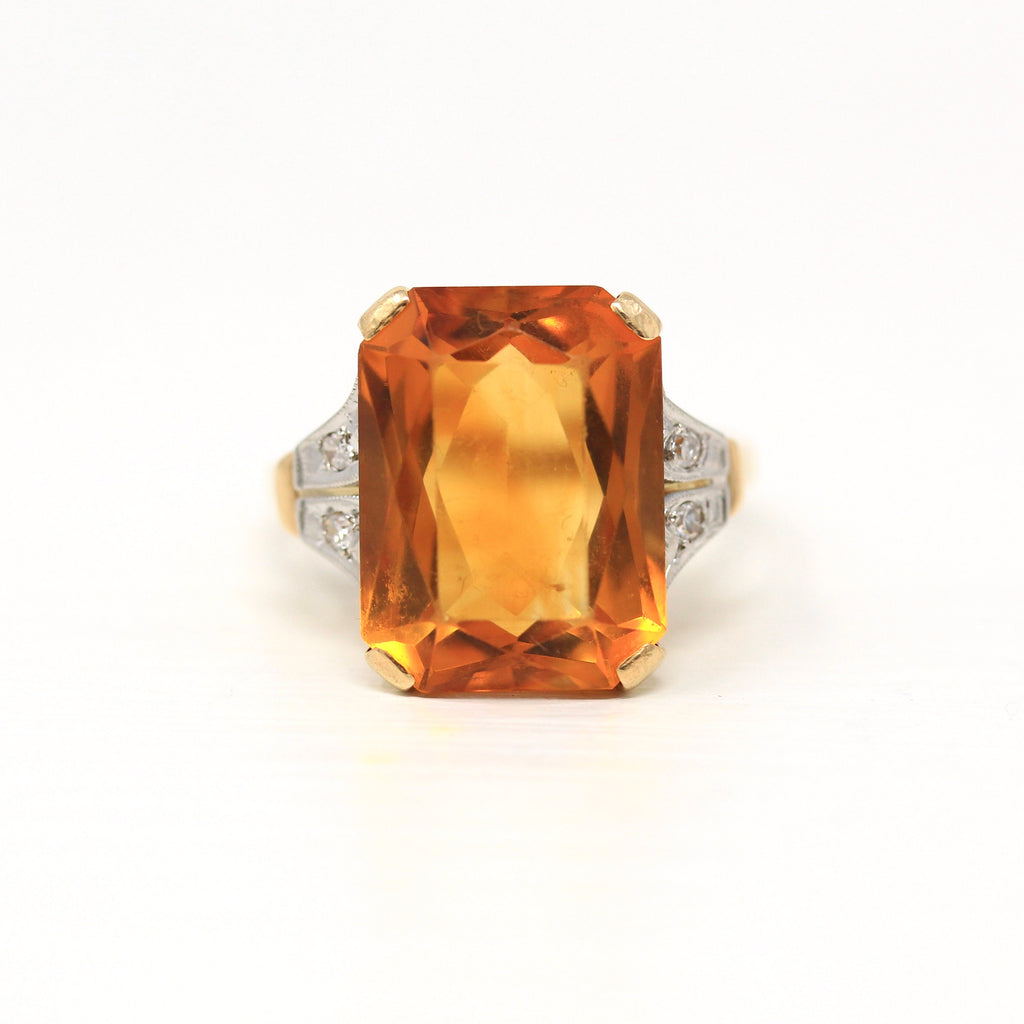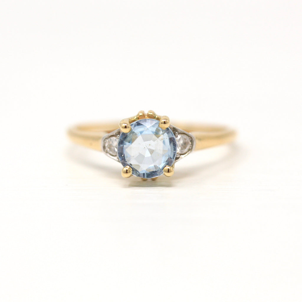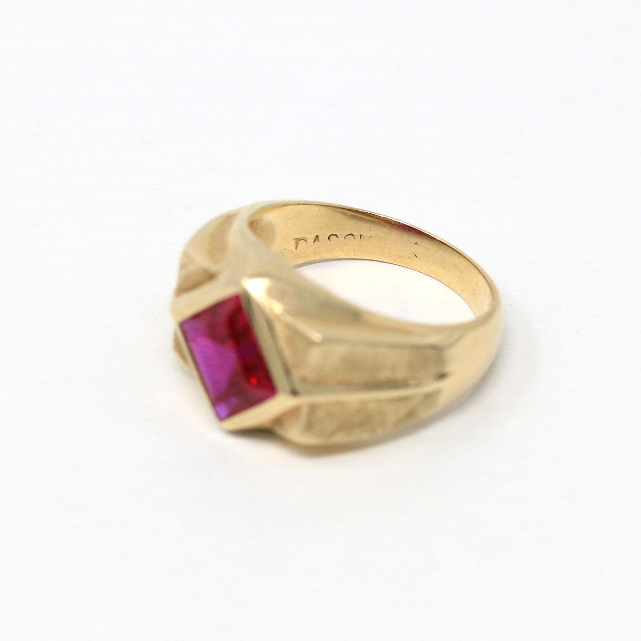 Created Spinel Ring - Retro 10k Yellow Gold Emerald Cut 4.41 CT Blue Stone - Vintage Circa 1940s Era Size 4 1/2 Statement Fine 40s Jewelry