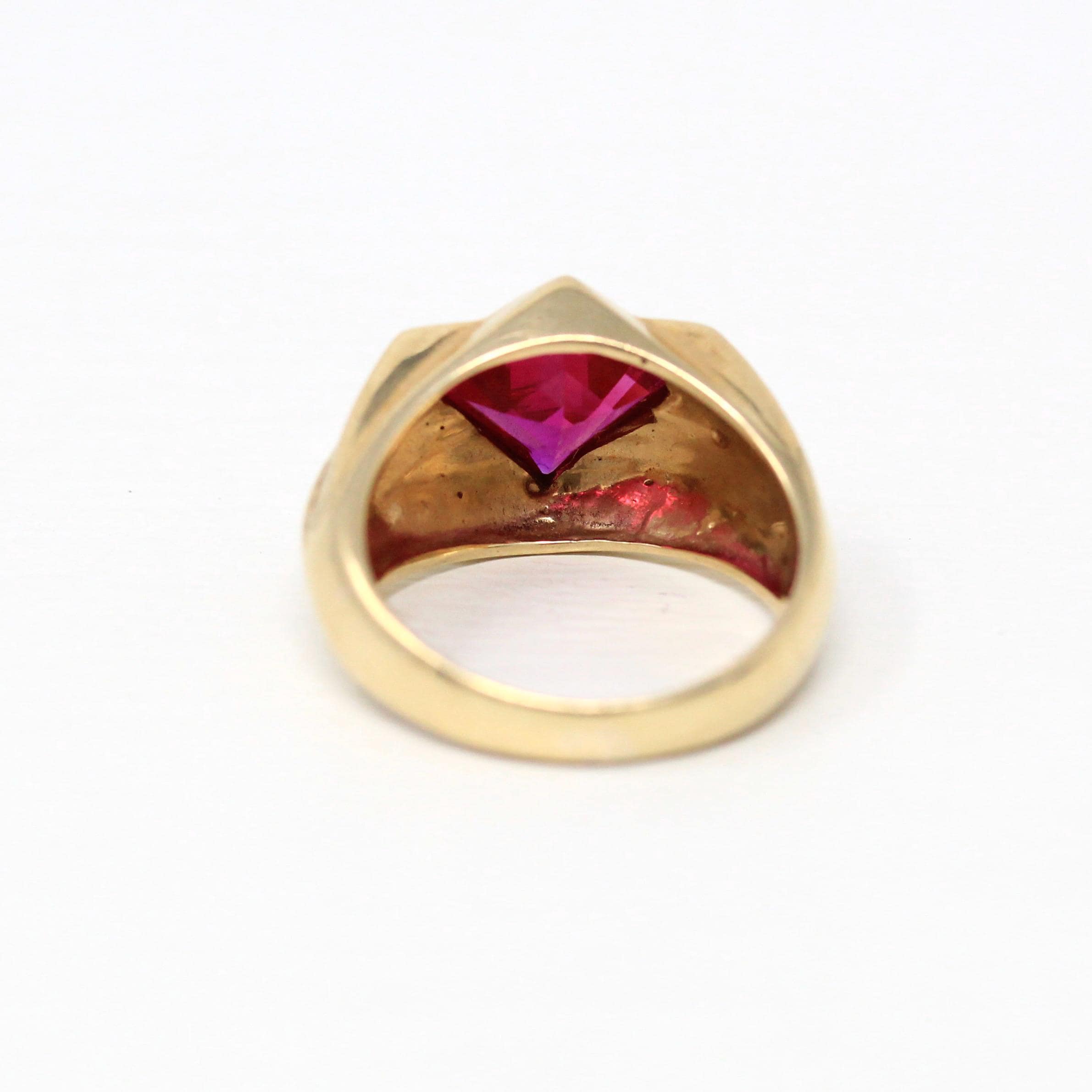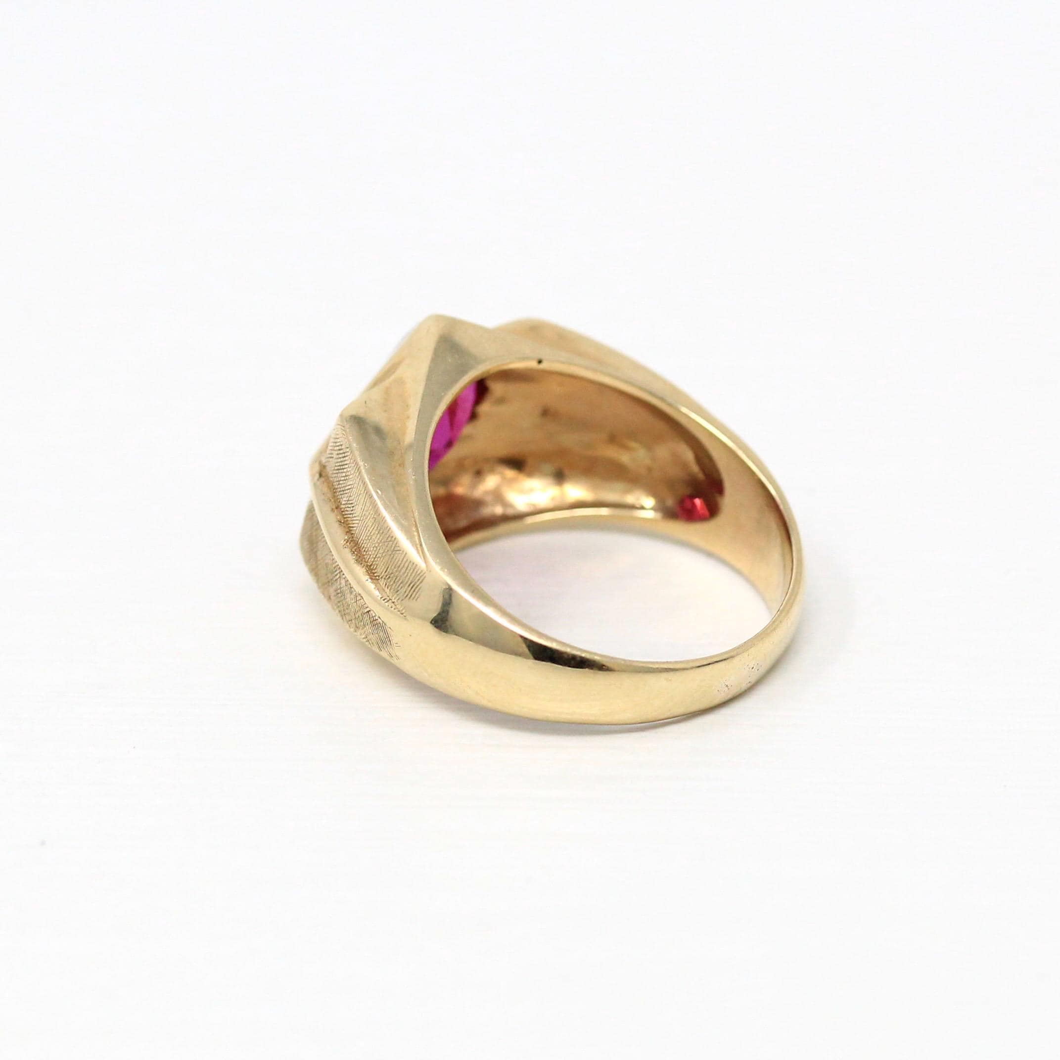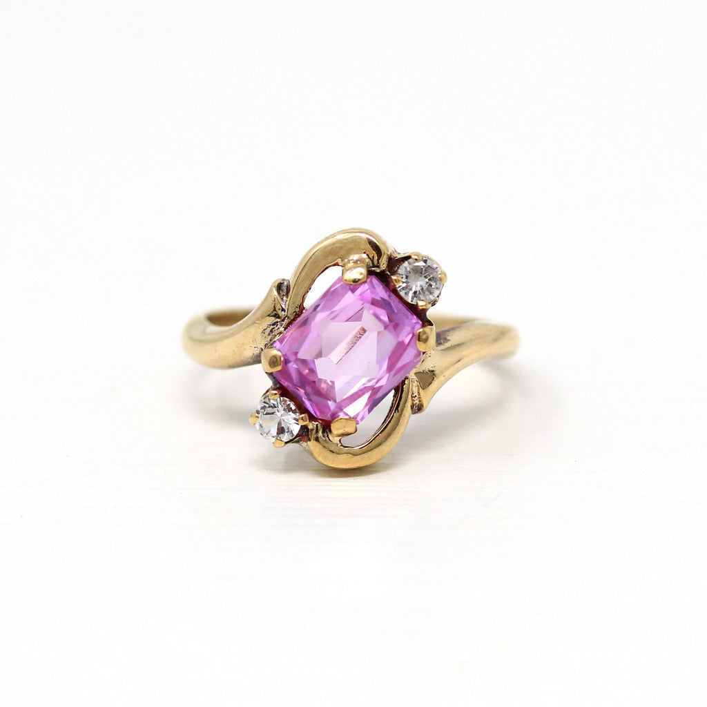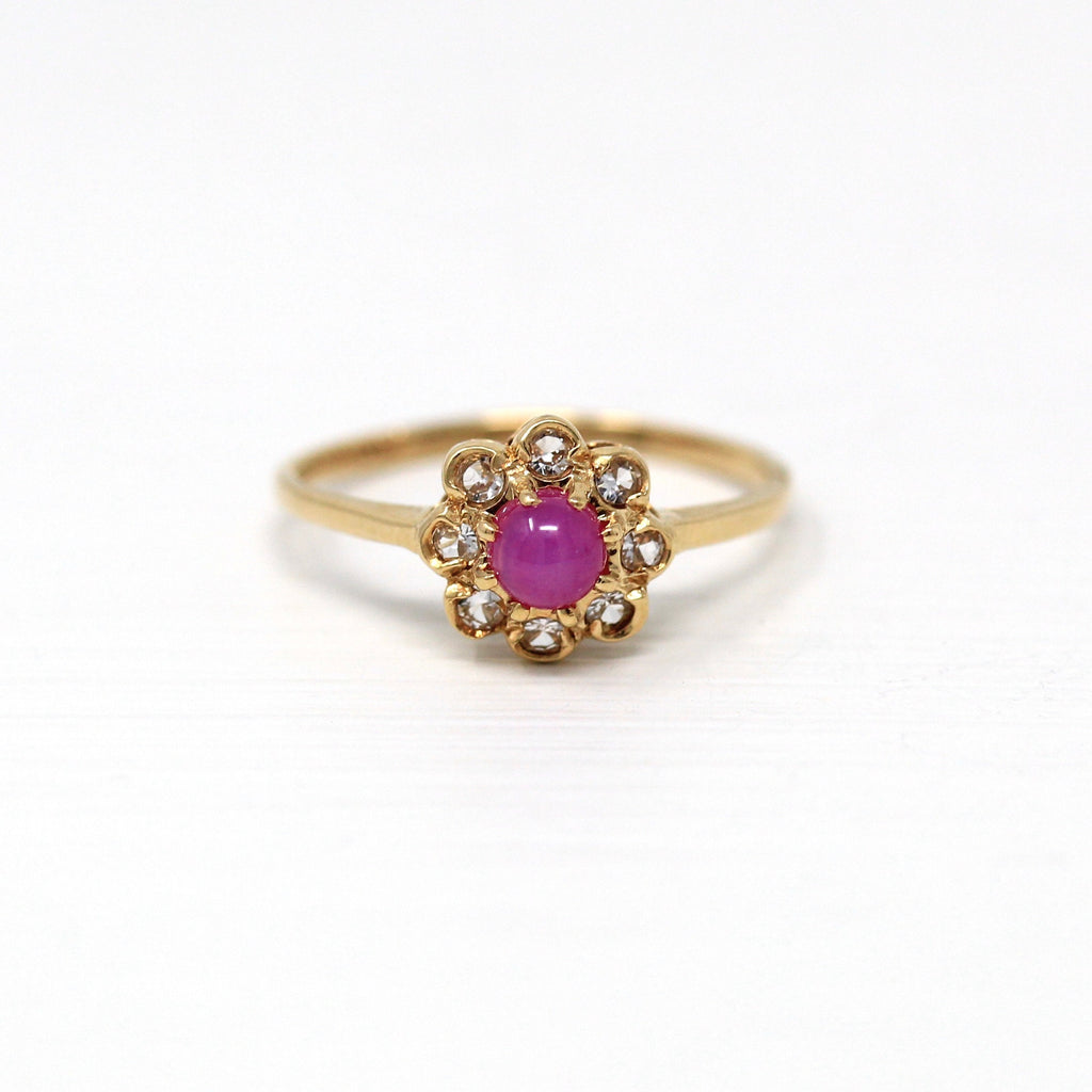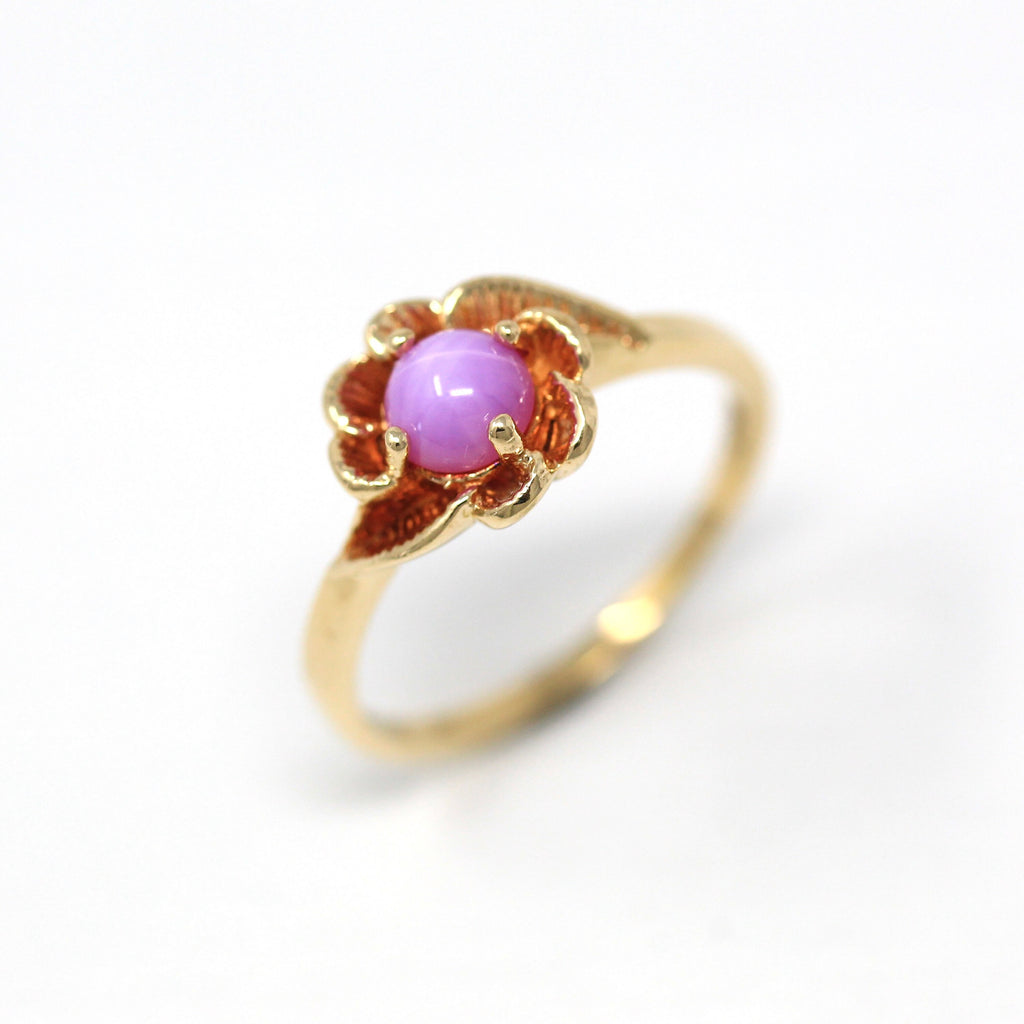Created Star Ruby Ring - Retro 14k Yellow Gold Cabochon Cut Pink Gemstone - Vintage Circa 1960s Era Size 6 1/4 Bypass Fine Statement Jewelry
