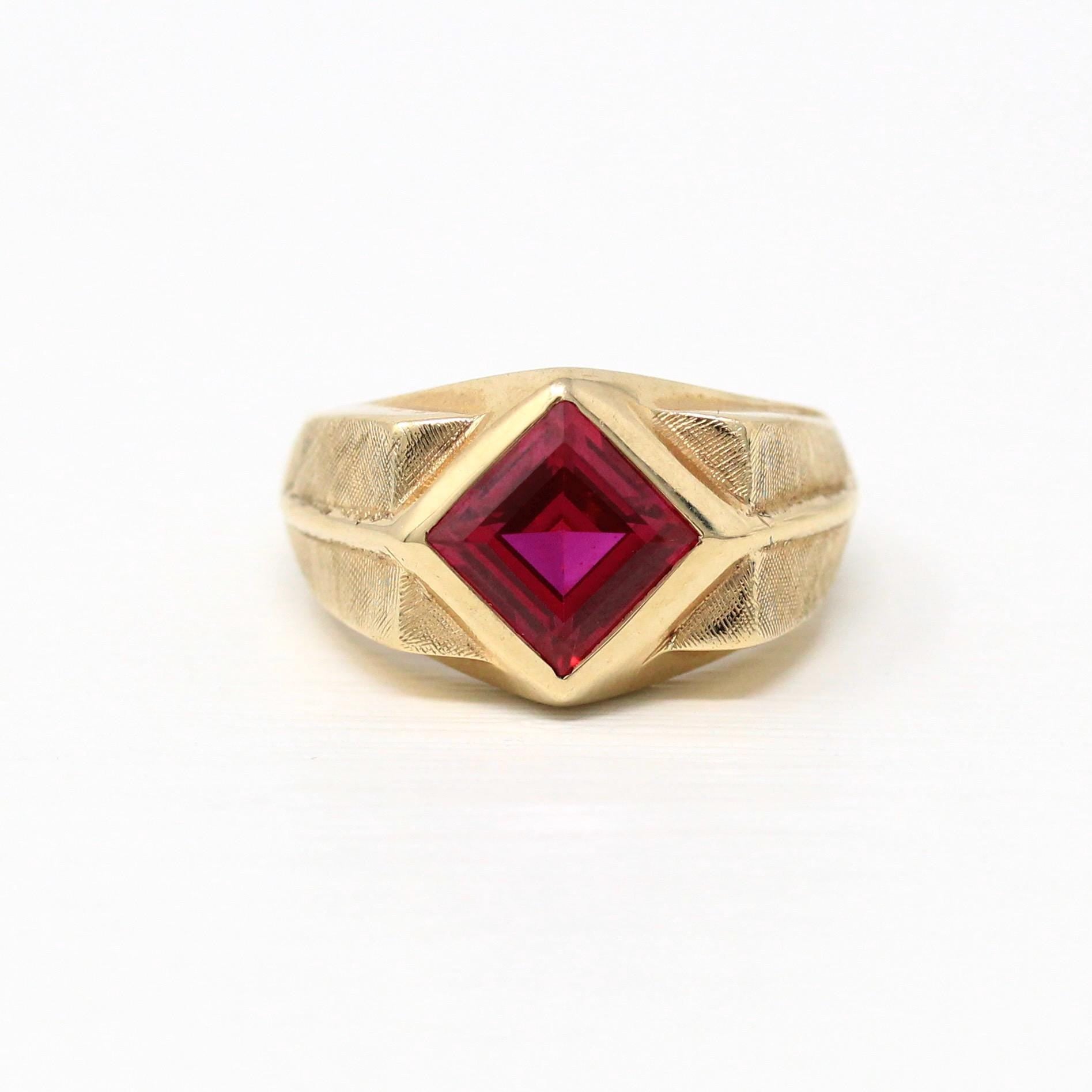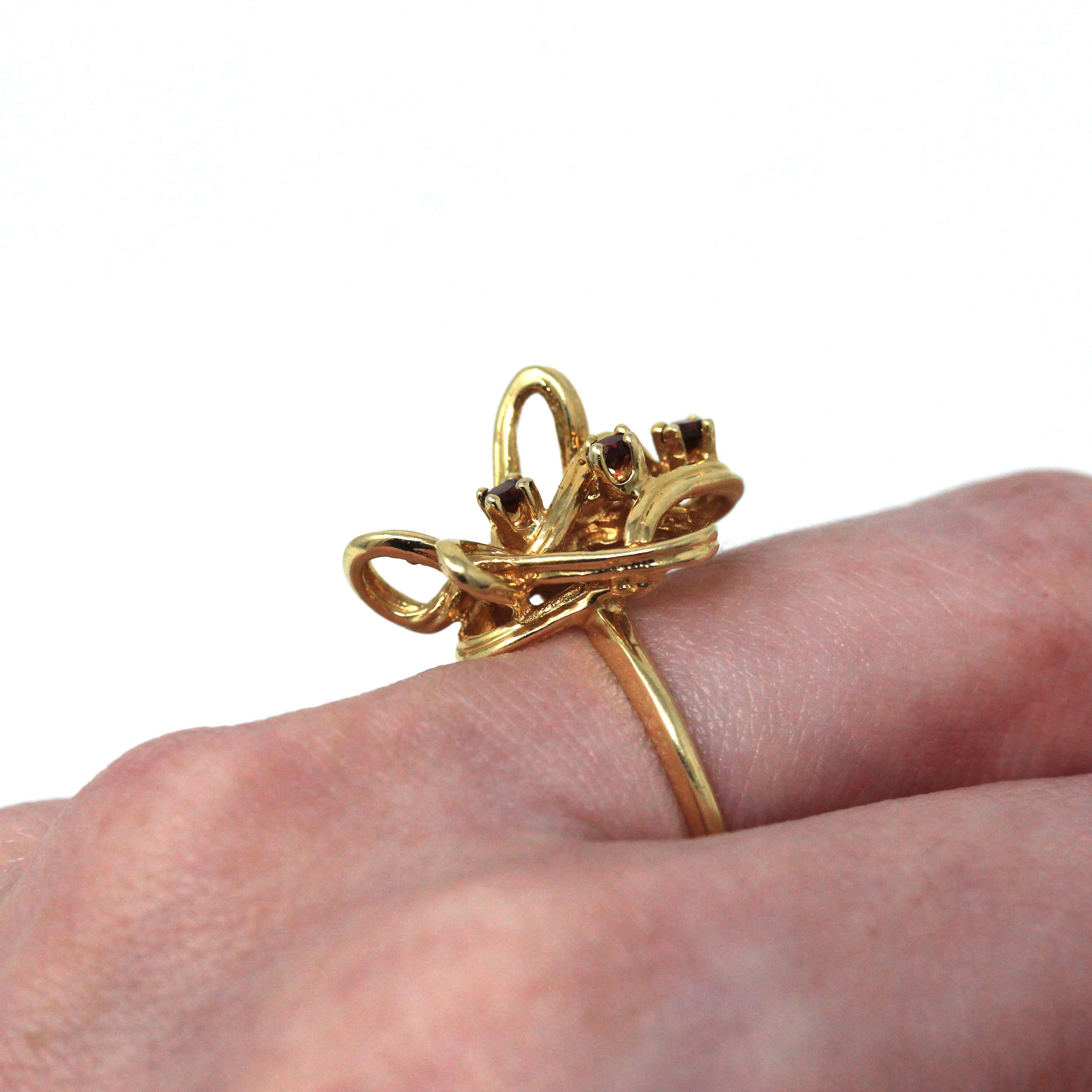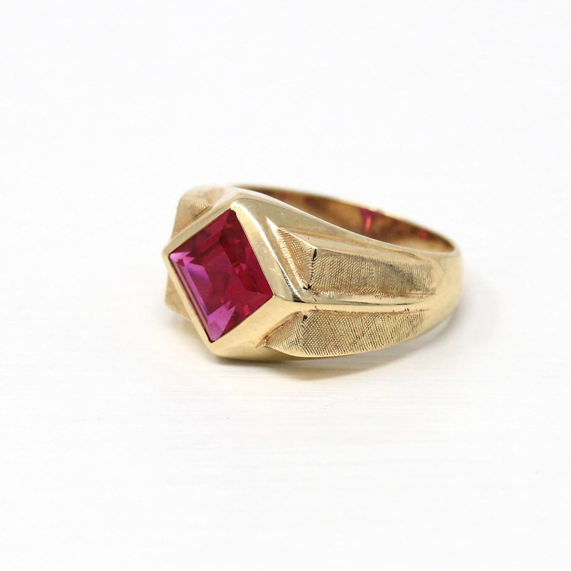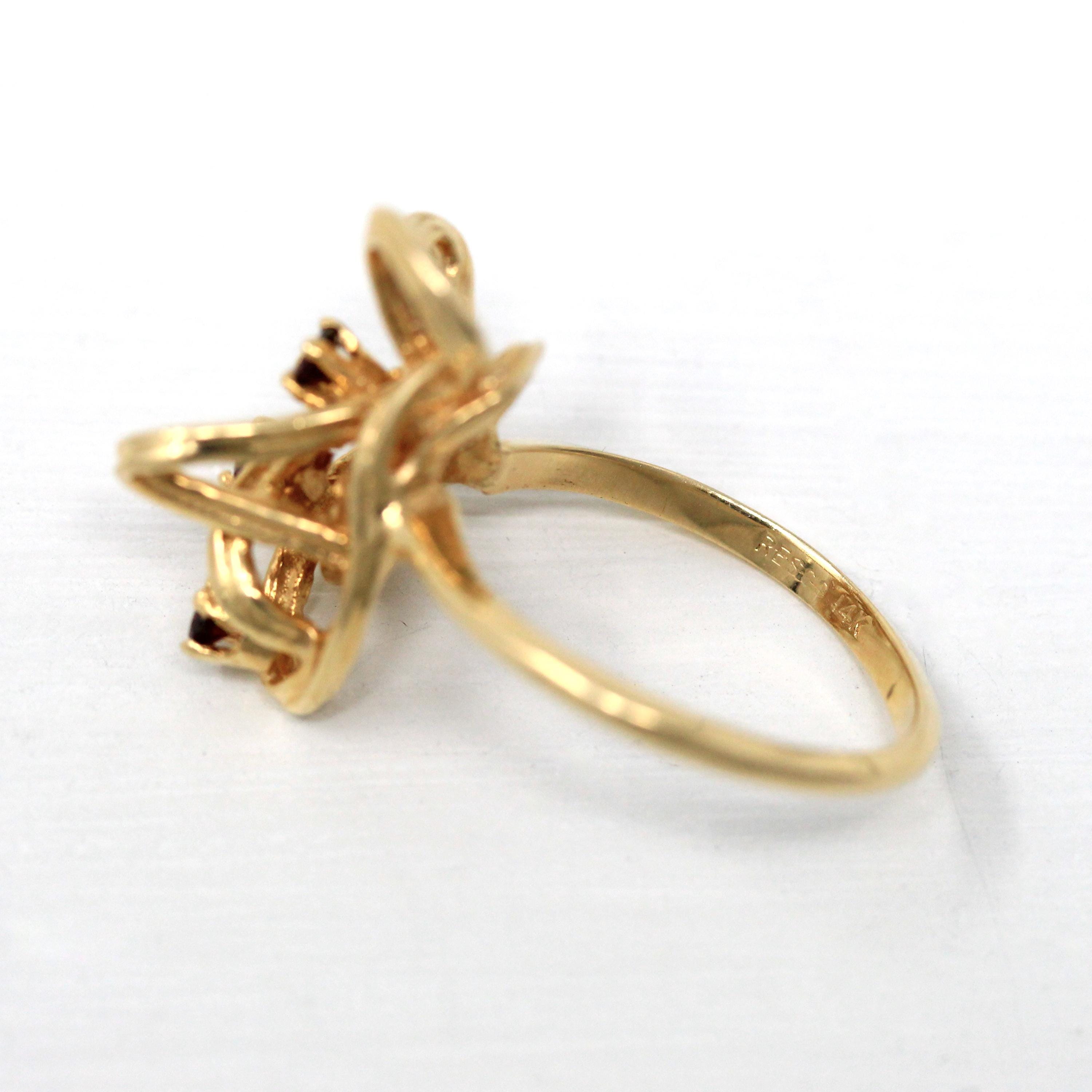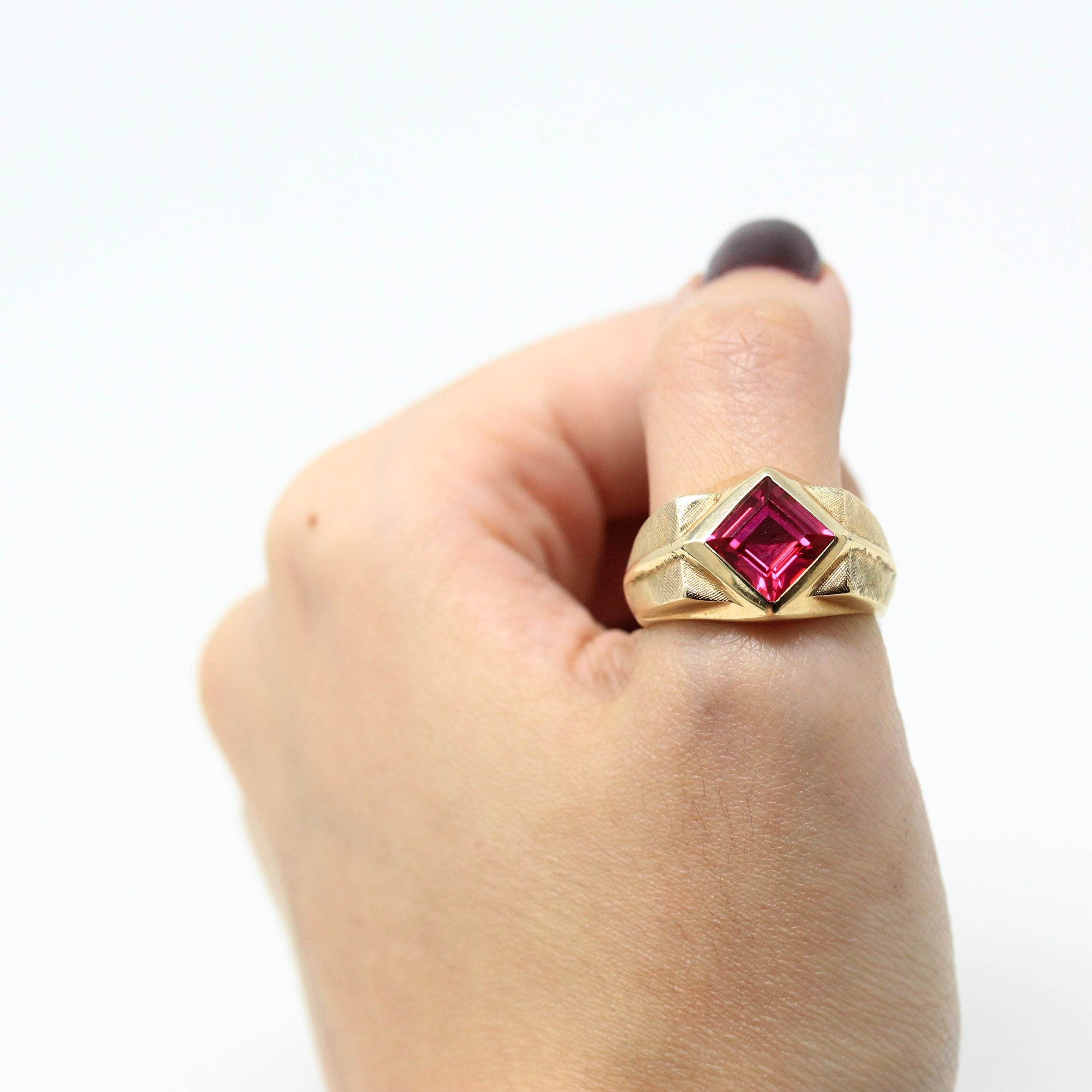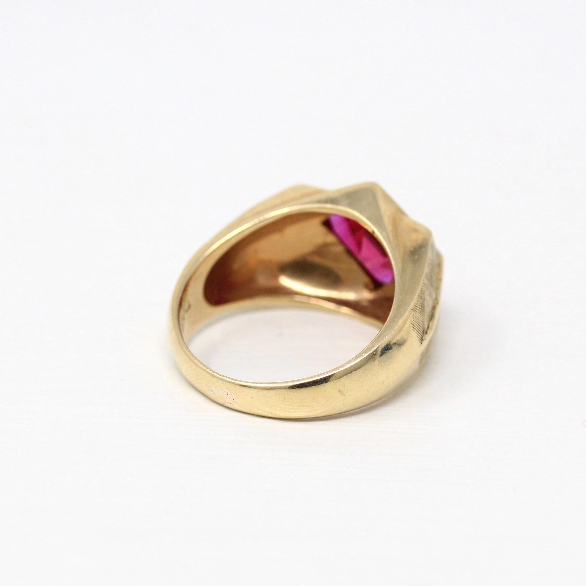 Created Star Ruby Ring - Retro 14k Yellow Gold Cabochon Cut Pink Gemstone - Vintage Circa 1960s Era Size 6 1/4 Bypass Fine Statement Jewelry