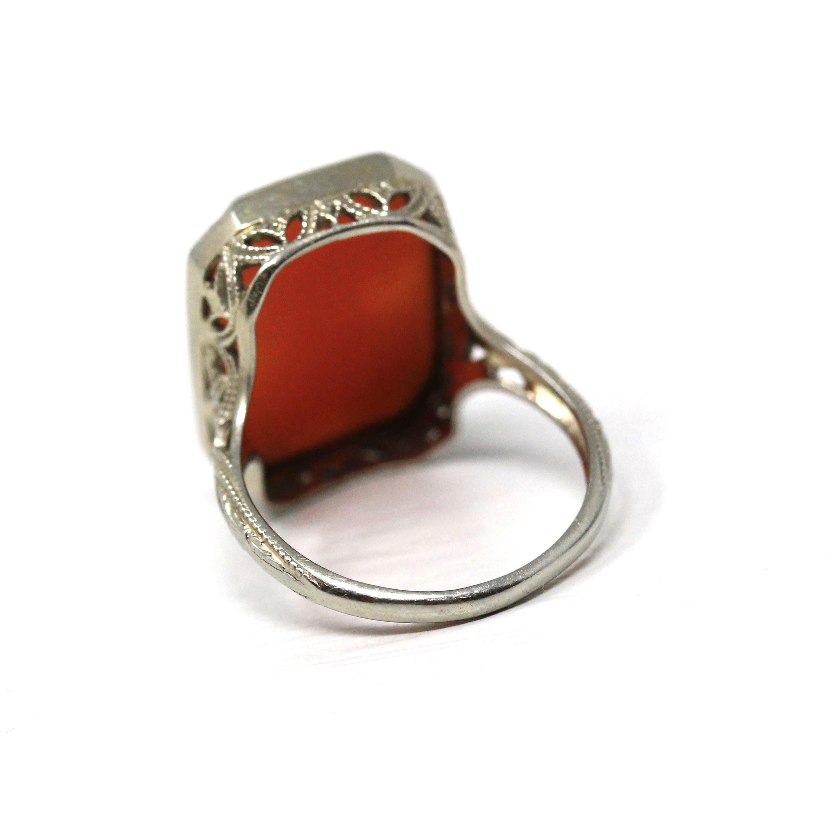 Art Deco Cameo Ring - Vintage 18k White Gold Filigree Statement Ring - Circa 1930s Era Size 5.75 Rectangular Carved Pink Shell Fine Jewelry
