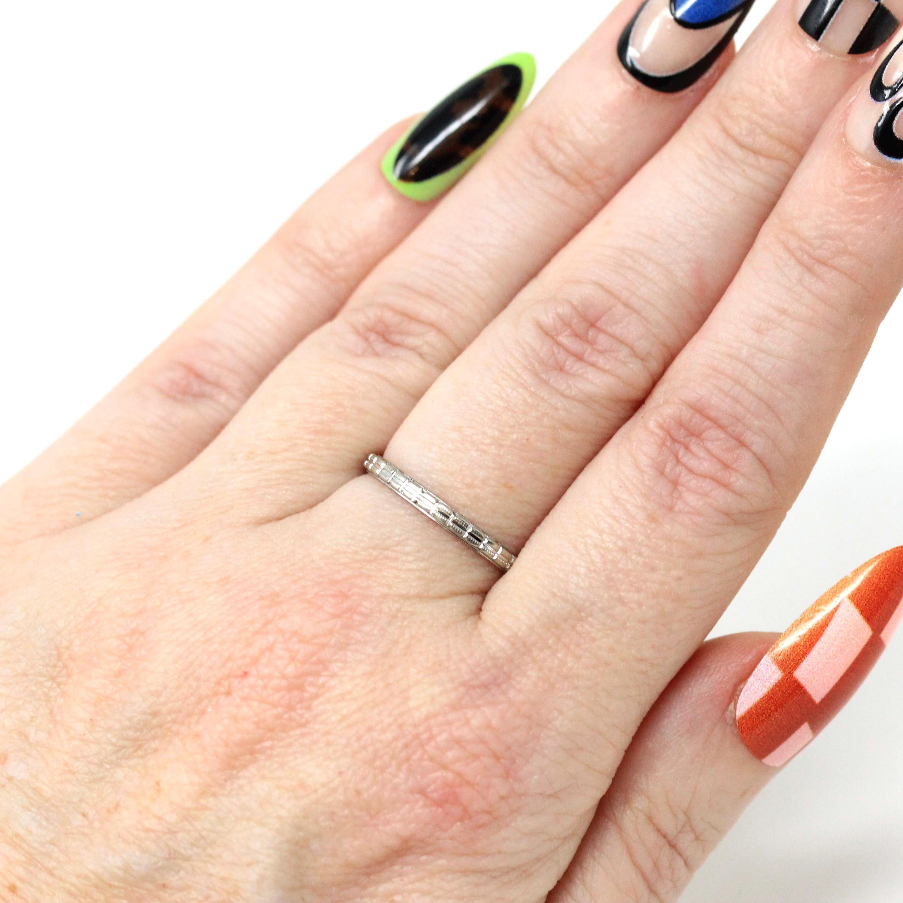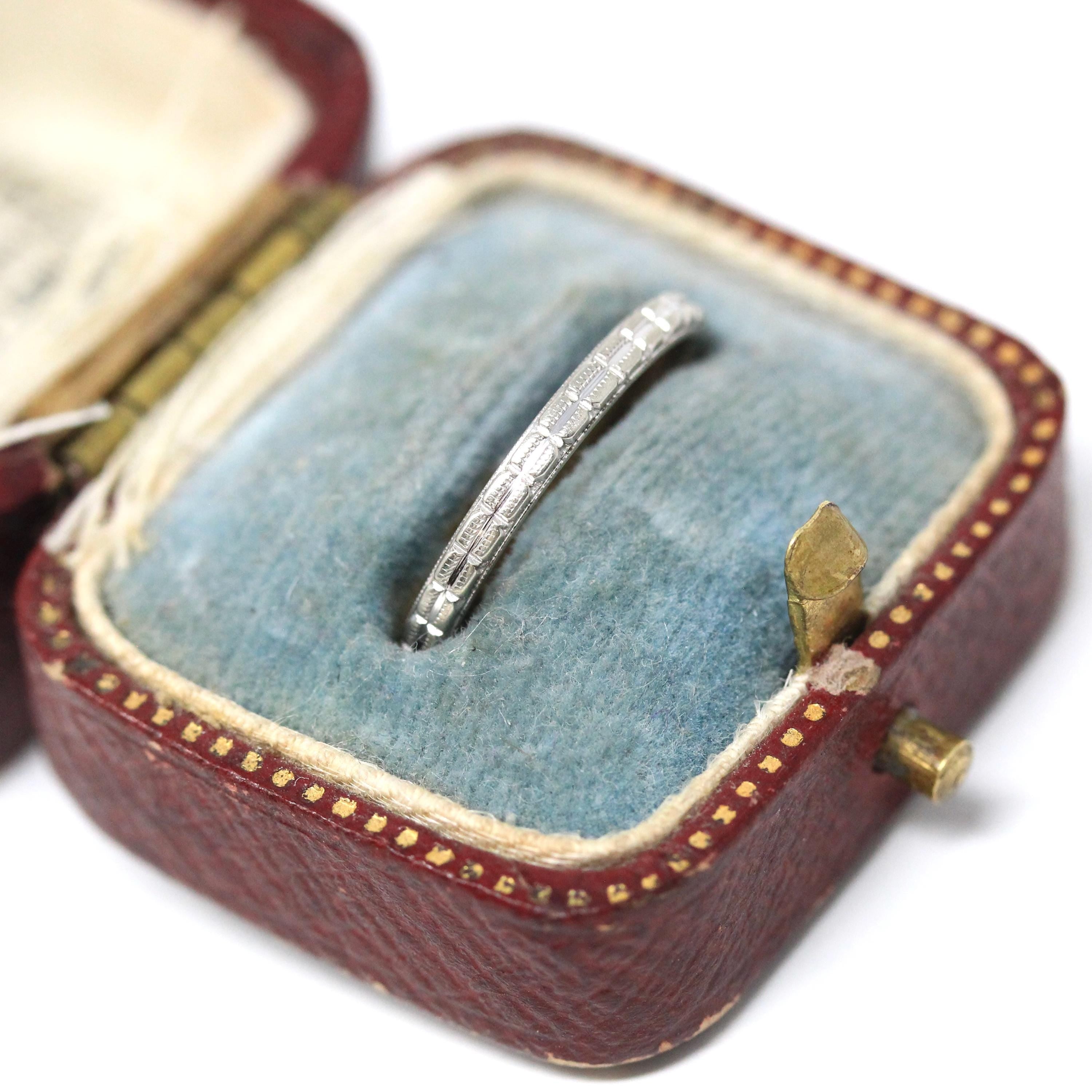 Beautiful vintage circa 1930s Art Deco Era 18k white gold wedding band! This elegant eternity ring features a pretty geometric pattern adorning the entire band. The ring band would pair very well with an Art Deco engagement ring or is a wonderful stacking band! A stunning and timeless piece of fine vintage jewelry from the '30s.