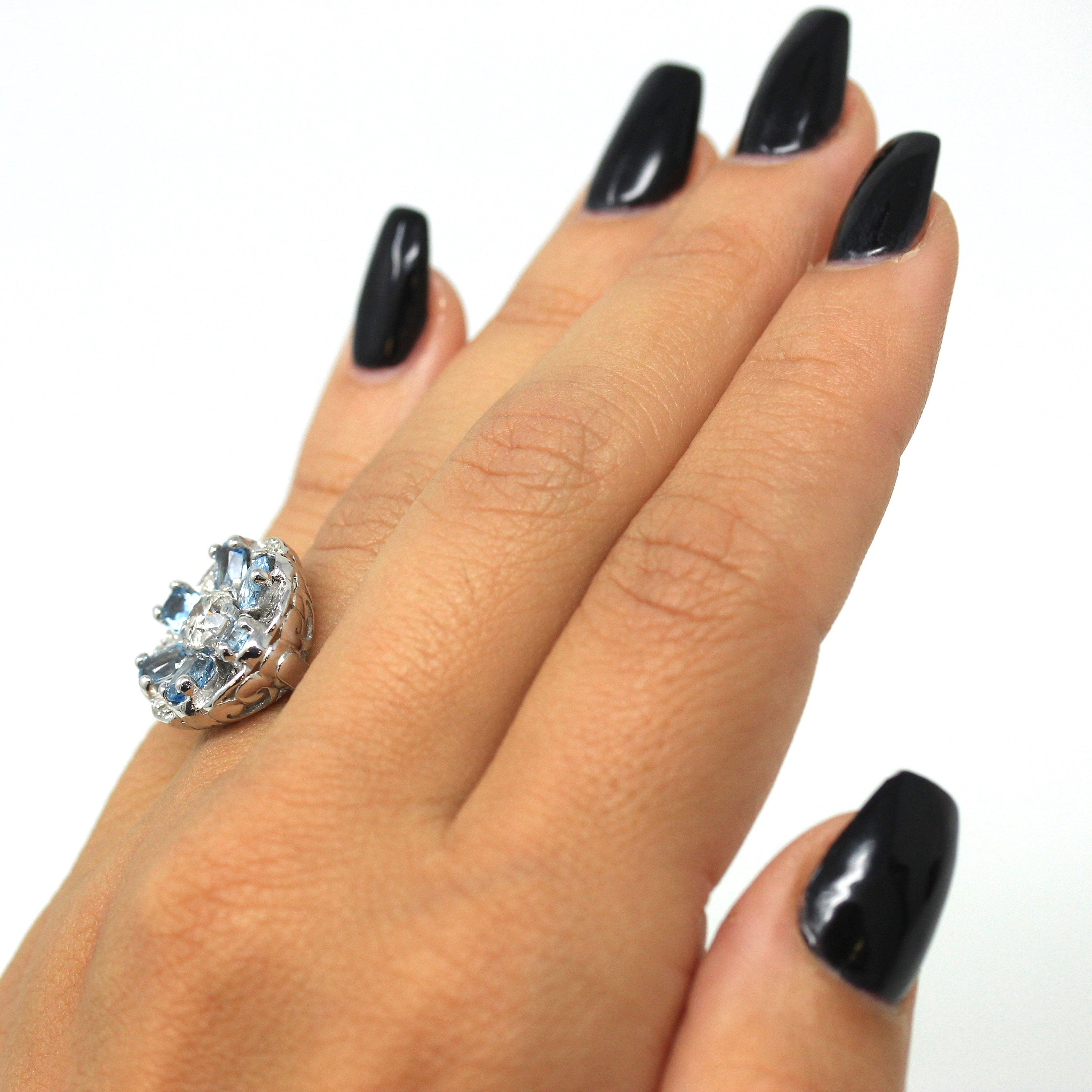 CONDITION - Good/fair vintage condition. Piece has been professionally polished and cleaned. Very little wear remains to metal. Genuine diamonds and aquamarines are secure in settings. Diamonds are all in nice shape. One aquamarine has wear to pavilion, two have small chips. Designs have been beautifully preserved. Ring has been previously sized. Incredible Mid Century era cocktail ring!