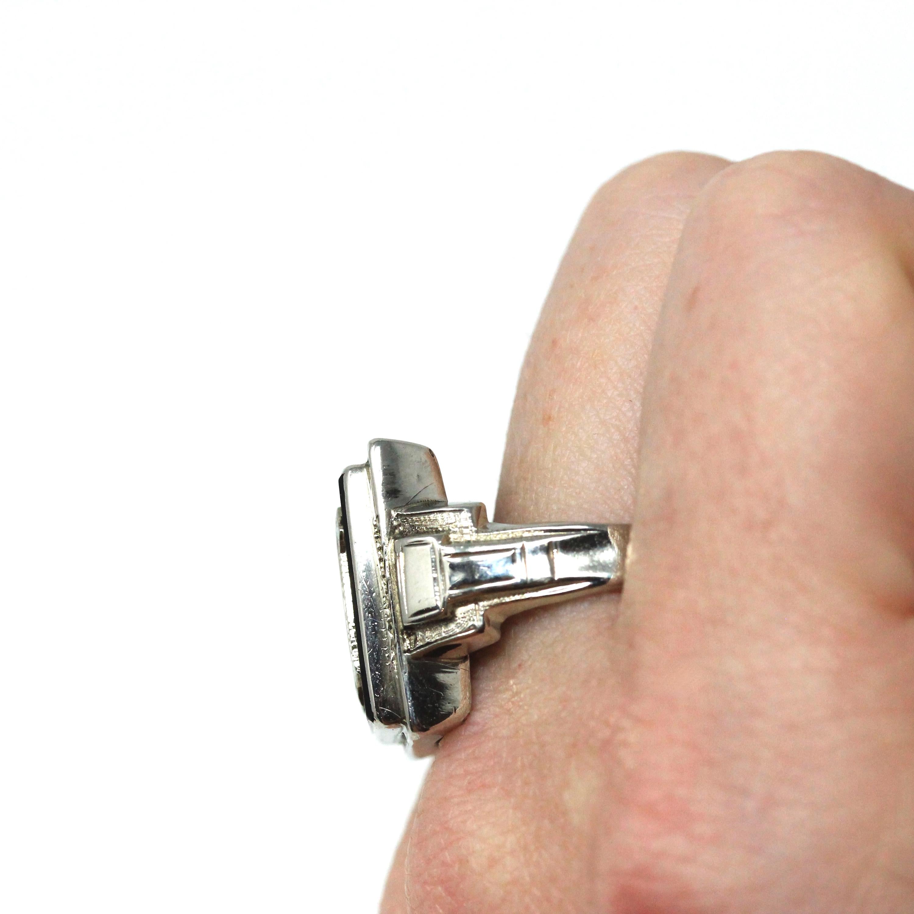 Letter W Ring - Art Deco Era 10k White Gold Black Chalcedony Onyx Signet - Vintage 1930s Size 11 Black Gem Initial Old English Fine Jewelry