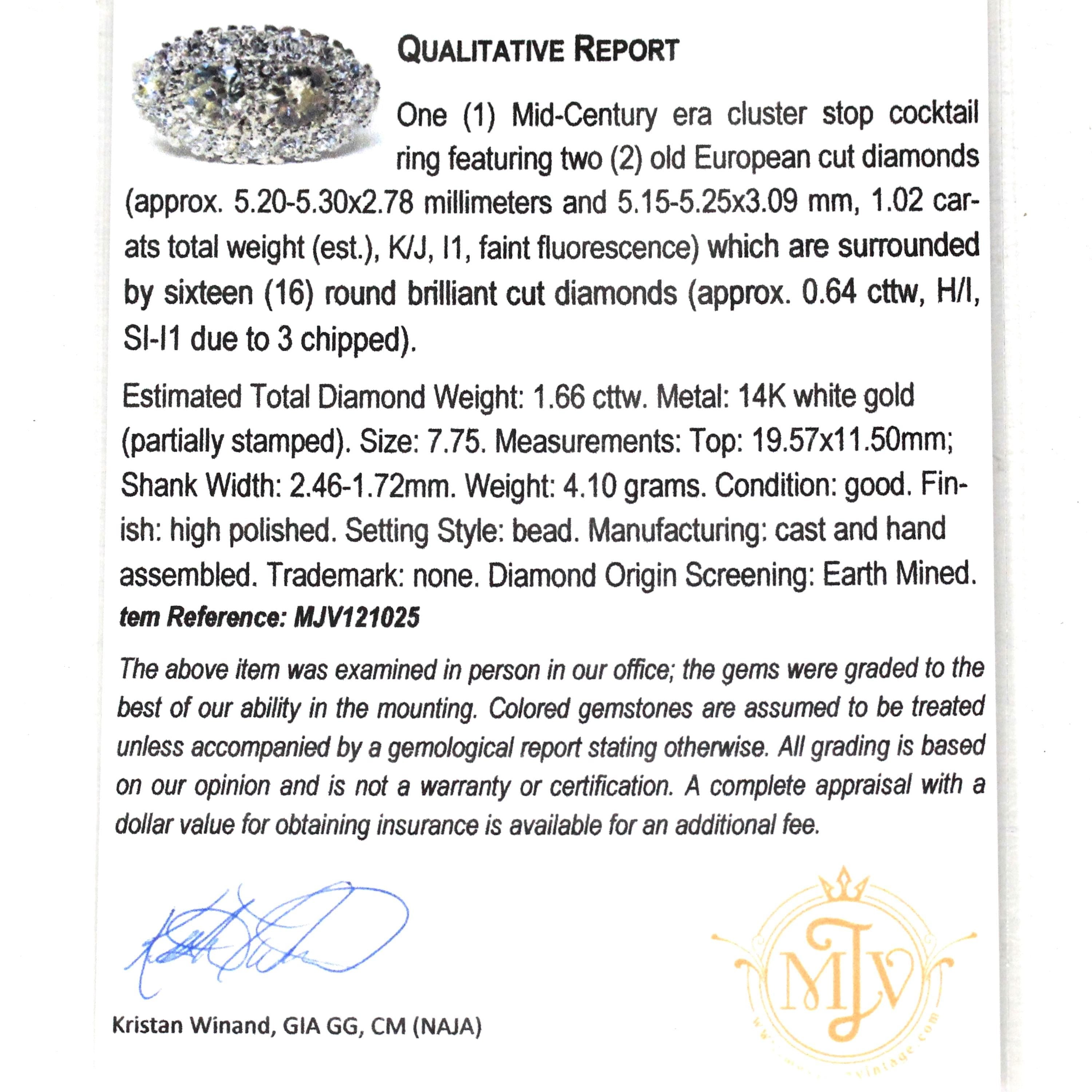 Beautiful vintage circa 1950s Mid Century era 14k white gold cluster diamond ring! This lovely 14k white gold ring princess style ring design features two center natural diamonds surrounded by an eye-shaped halo of 16 more natural diamonds. This sparkly cluster ring has an open metal design in the gallery and a cathedral style shank. This rings comes with a qualitative report prepared by one of our in house GIA Graduate Gemologists! Beautiful 1950s era diamond cluster ring!