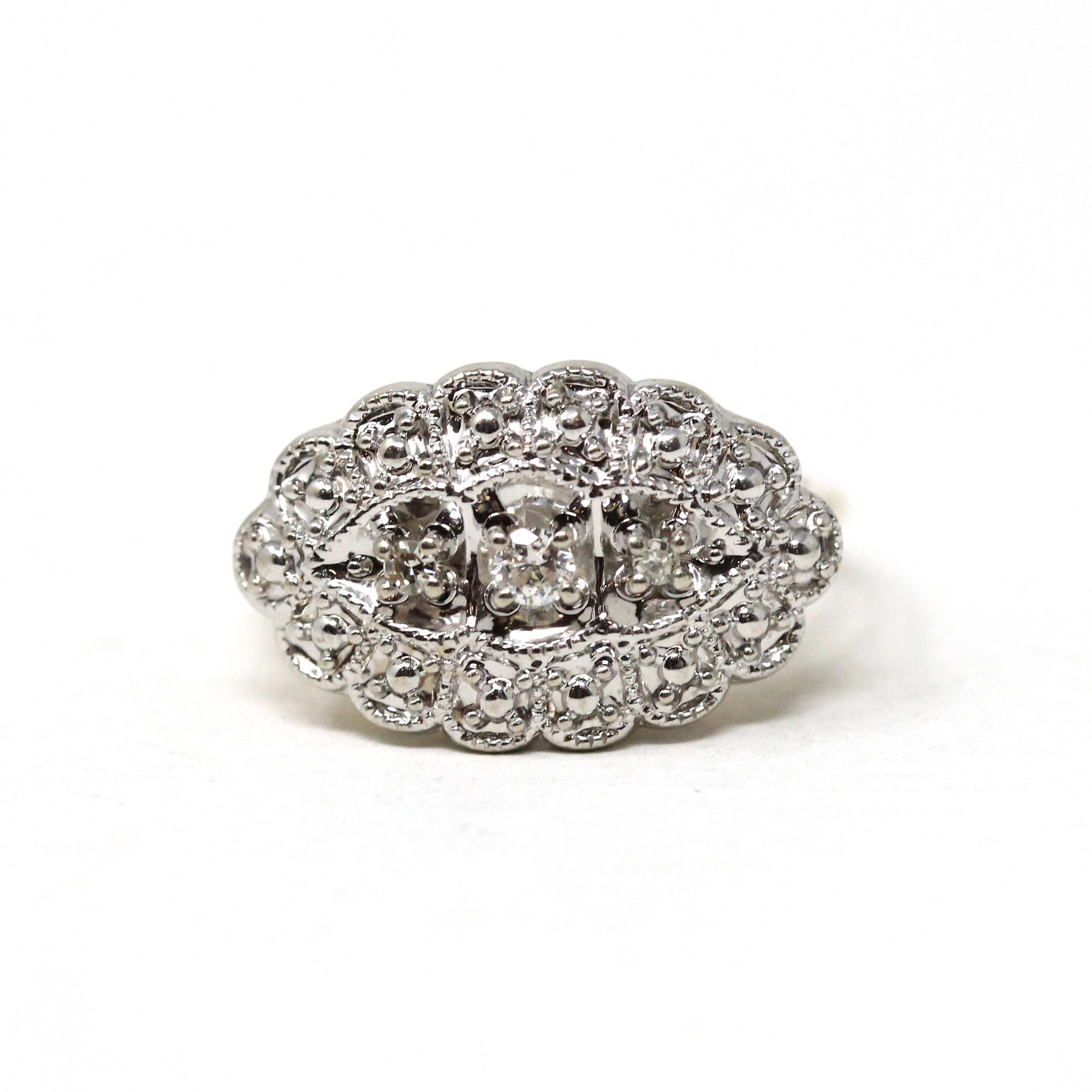Beautiful vintage circa 1950s Mid Century era 14k two tone gold diamond princess ring! This lovely princess-style ring features a round brilliant cut diamond flanked by two single cut diamonds in an eye-shaped setting with studded illusion diamond designs. This sparkly cluster ring has an open metal design in the gallery and a cathedral style shank. Beautiful 1950s era diamond princess ring!