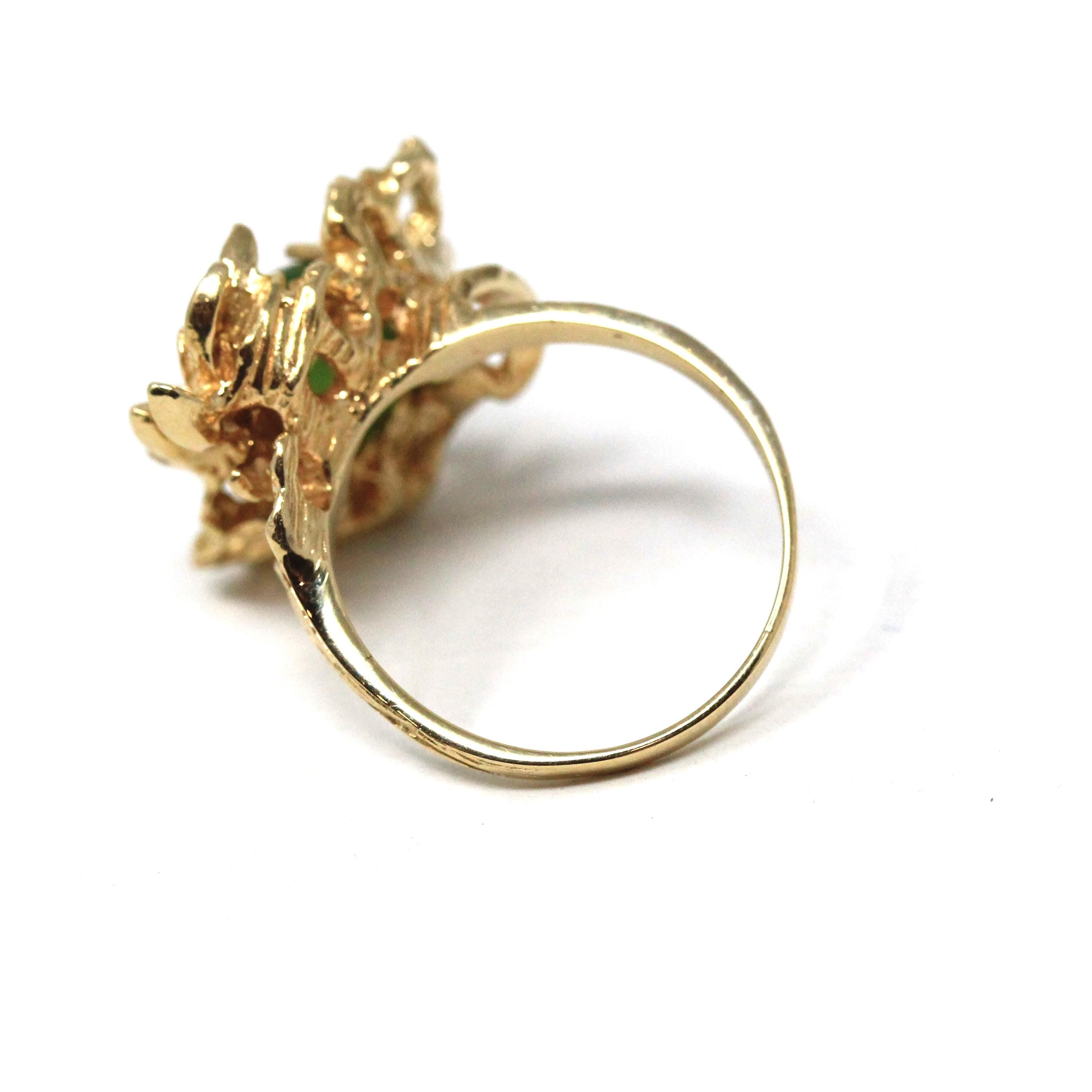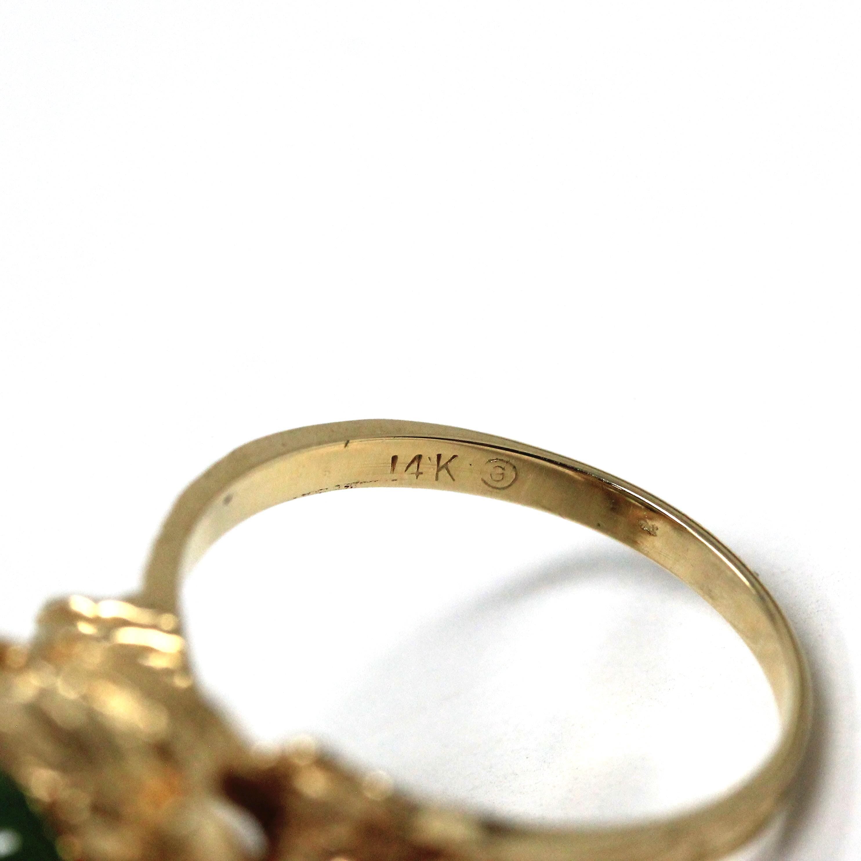 Nephrite Jade Ring - Retro 14k Yellow Gold Oval Cabochon Cut Natural Green Gemstone - Vintage Circa 1970s Era Size 7 Textured Fine Jewelry