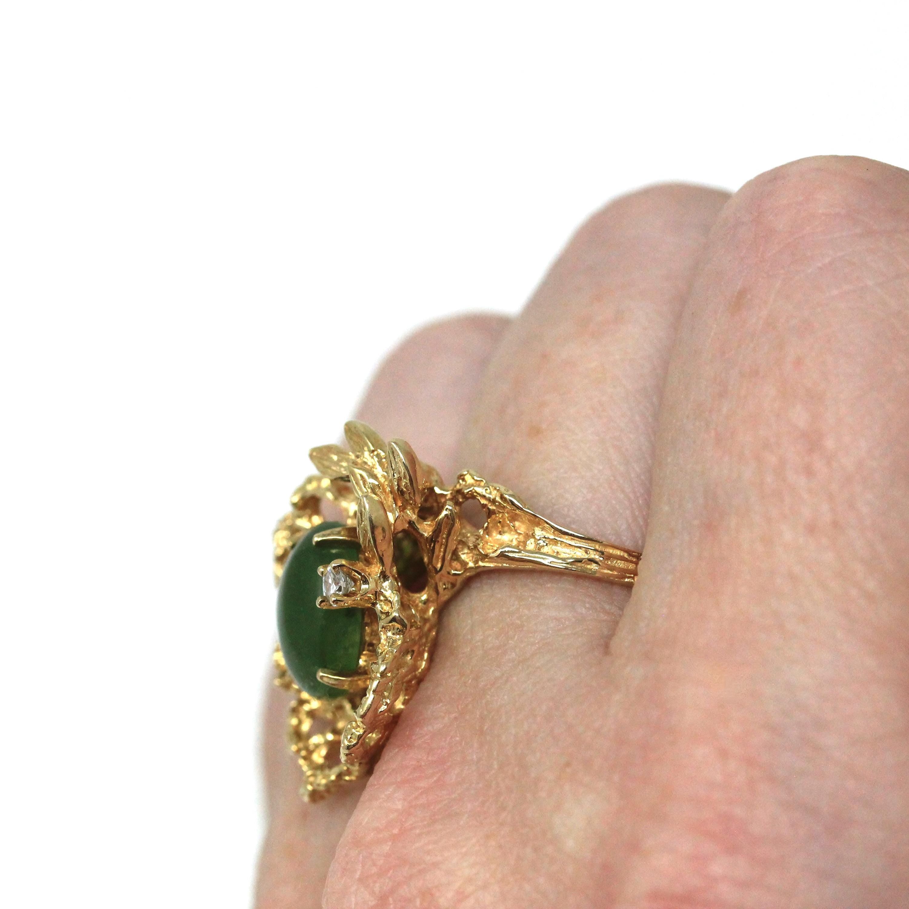 Unique vintage circa 1970s era 14k yellow gold natural nephrite jade ring! This stunning statement ring features an oval cabochon cut natural nephrite jade gemstone. The pretty green gem is securely prong set in a brutalist style setting, and is further accented with a natural .06 carat diamond. A gorgeous vintage statement ring!