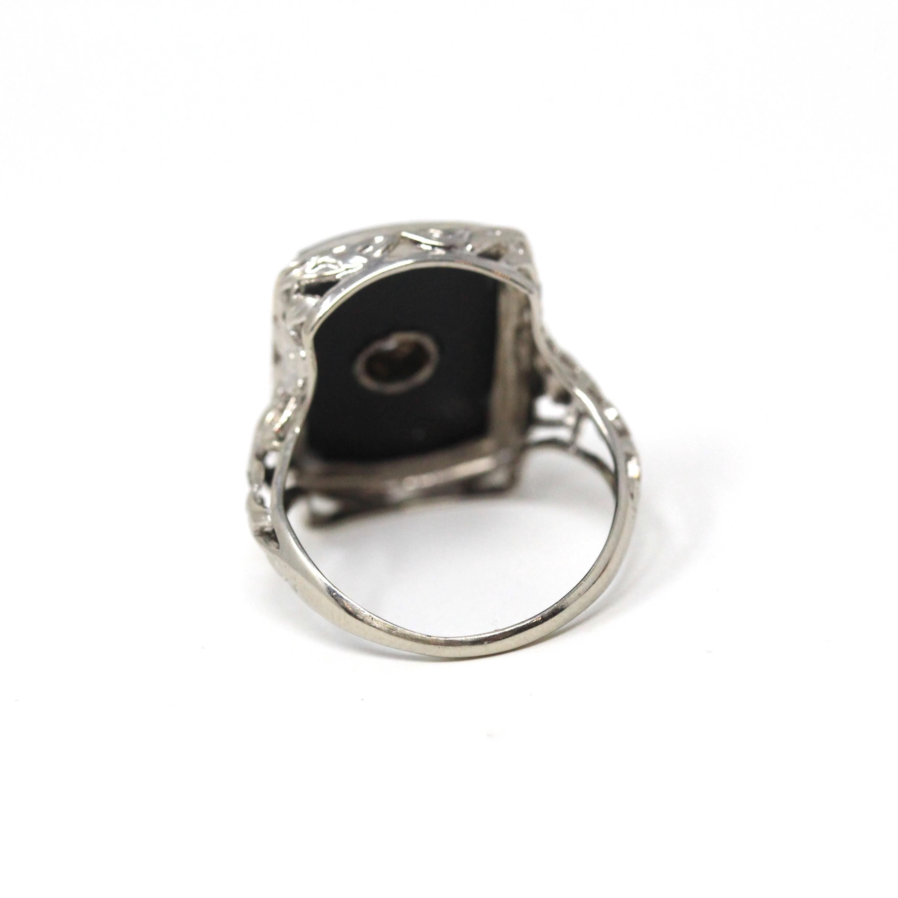 Onyx Filigree Ring - Art Deco Era 14k White Gold Natural .08 CT Diamond Accent - Vintage Circa 1930s Size 5 1/2 Black Chalcedony Jewelry