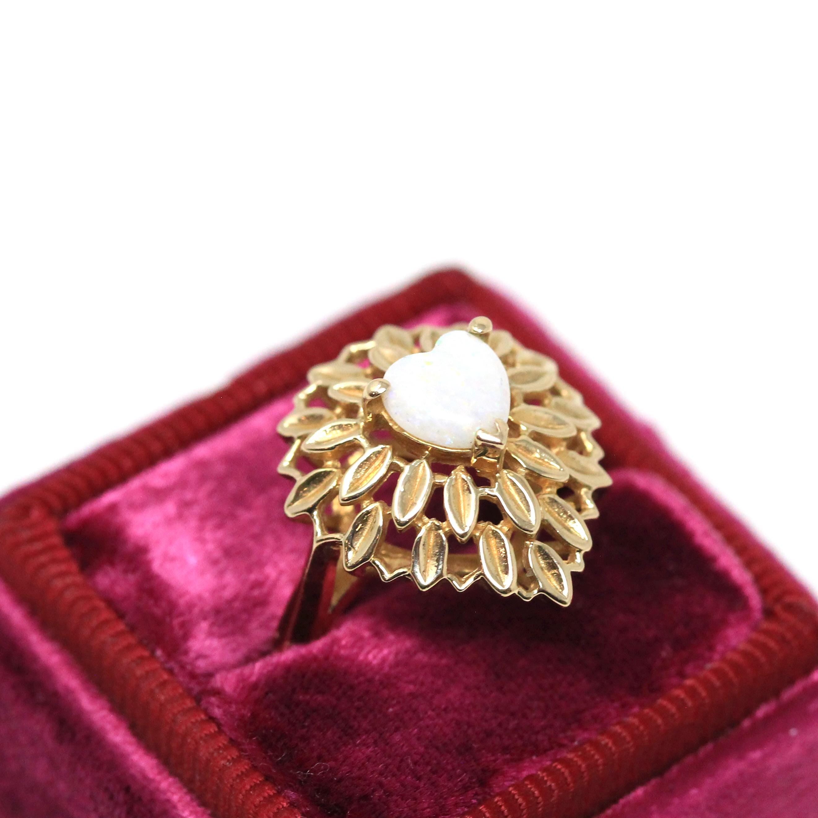 Opal Heart Ring - Modern 14k Yellow Gold Natural Gemstone Leaf Double Halo - Estate Circa 1990s Size 6 1/4 October Birthstone Fine Jewelry