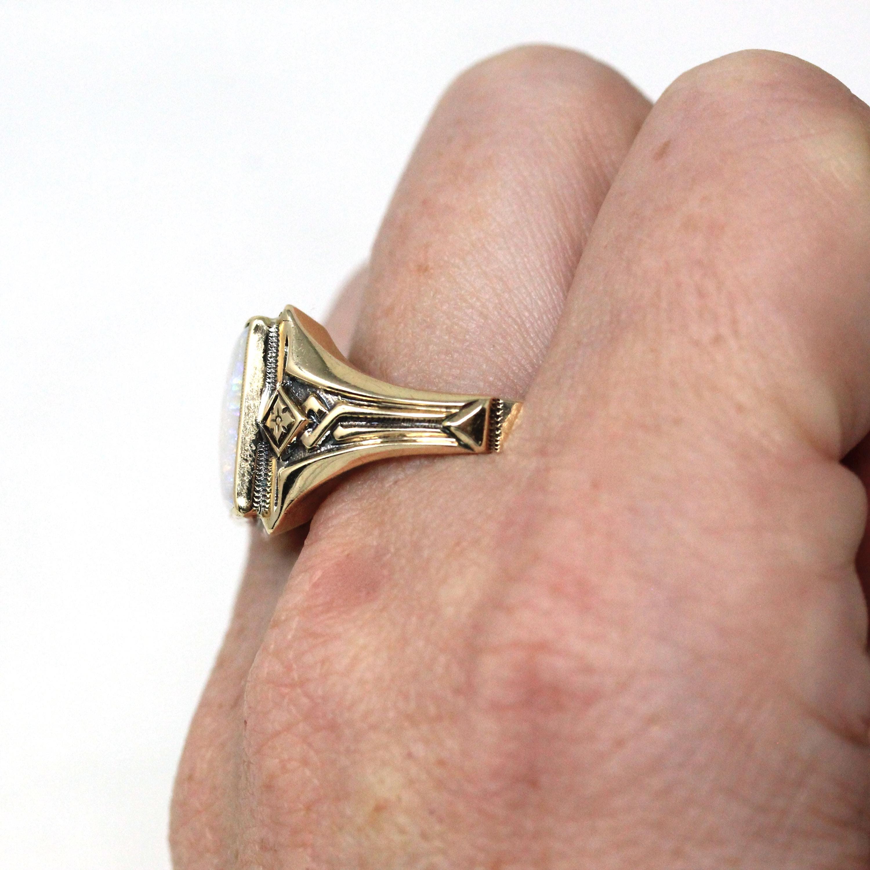 Retro Opal Ring - Vintage 10k Yellow Gold Natural Rectangular Cabochon Gemstone - Circa 1940s Size 12 Fine Unisex October Birthstone Jewelry