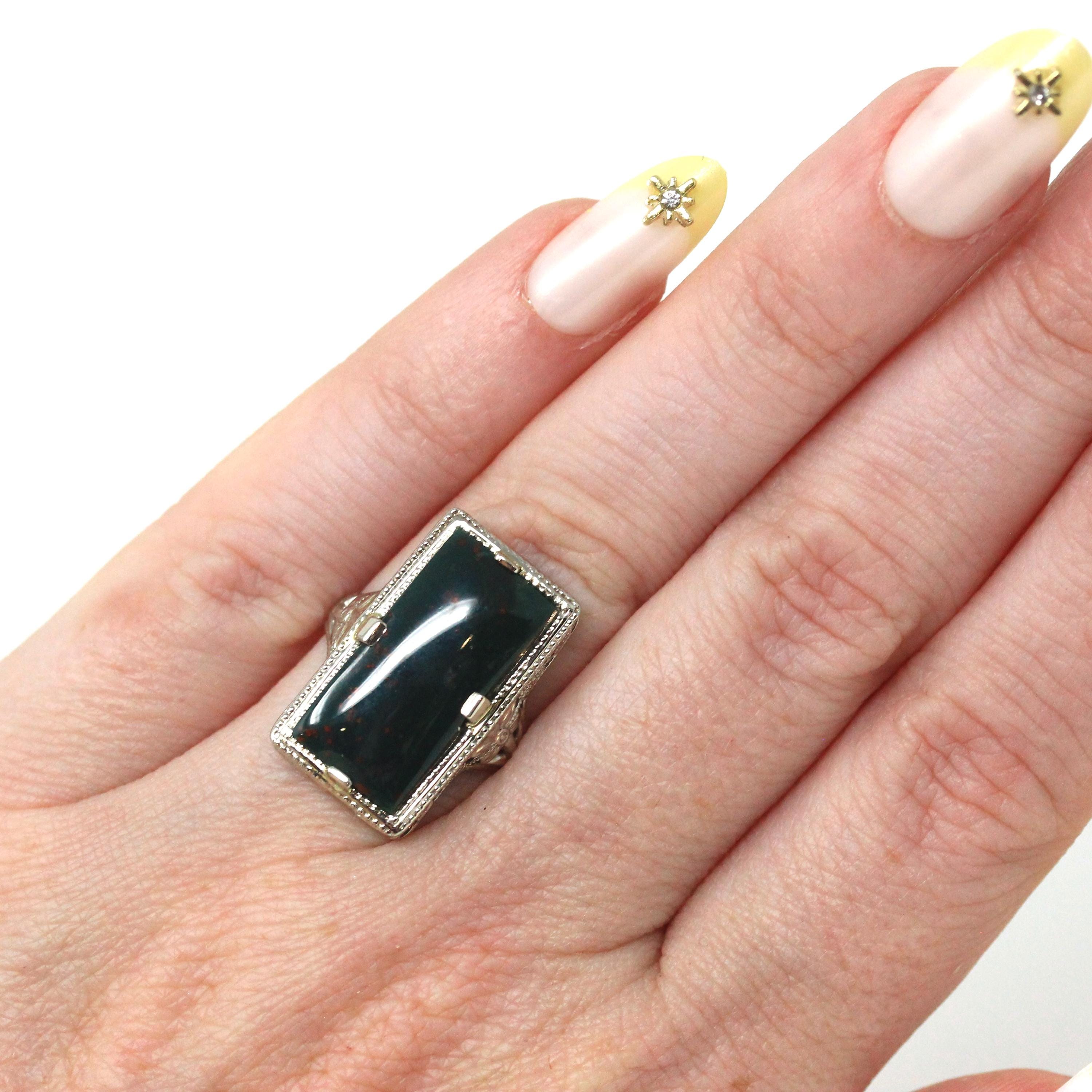 Vintage Bloodstone Ring - Art Deco 14k White Gold Dark Green Oxblood Red Gem - Circa 1930s Era Size 4 1/2 Heliotrope Fine Filigree Jewelry