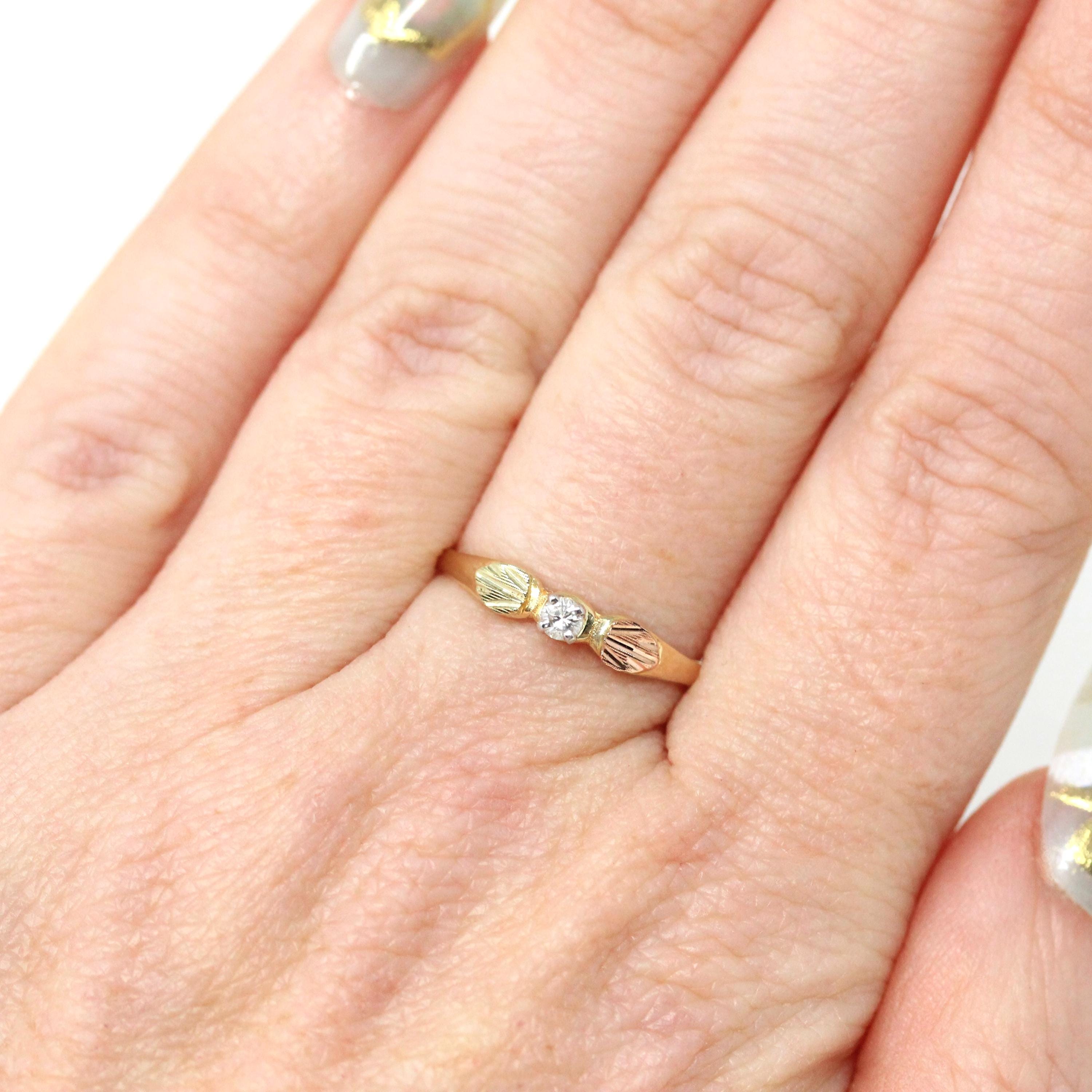 Vintage Diamond Ring - Mid Century 10k Tri Color Gold Natural Round Solitaire Gemstone Engagement - Circa 1960s Size 5 3/4 Leaf Fine Jewelry