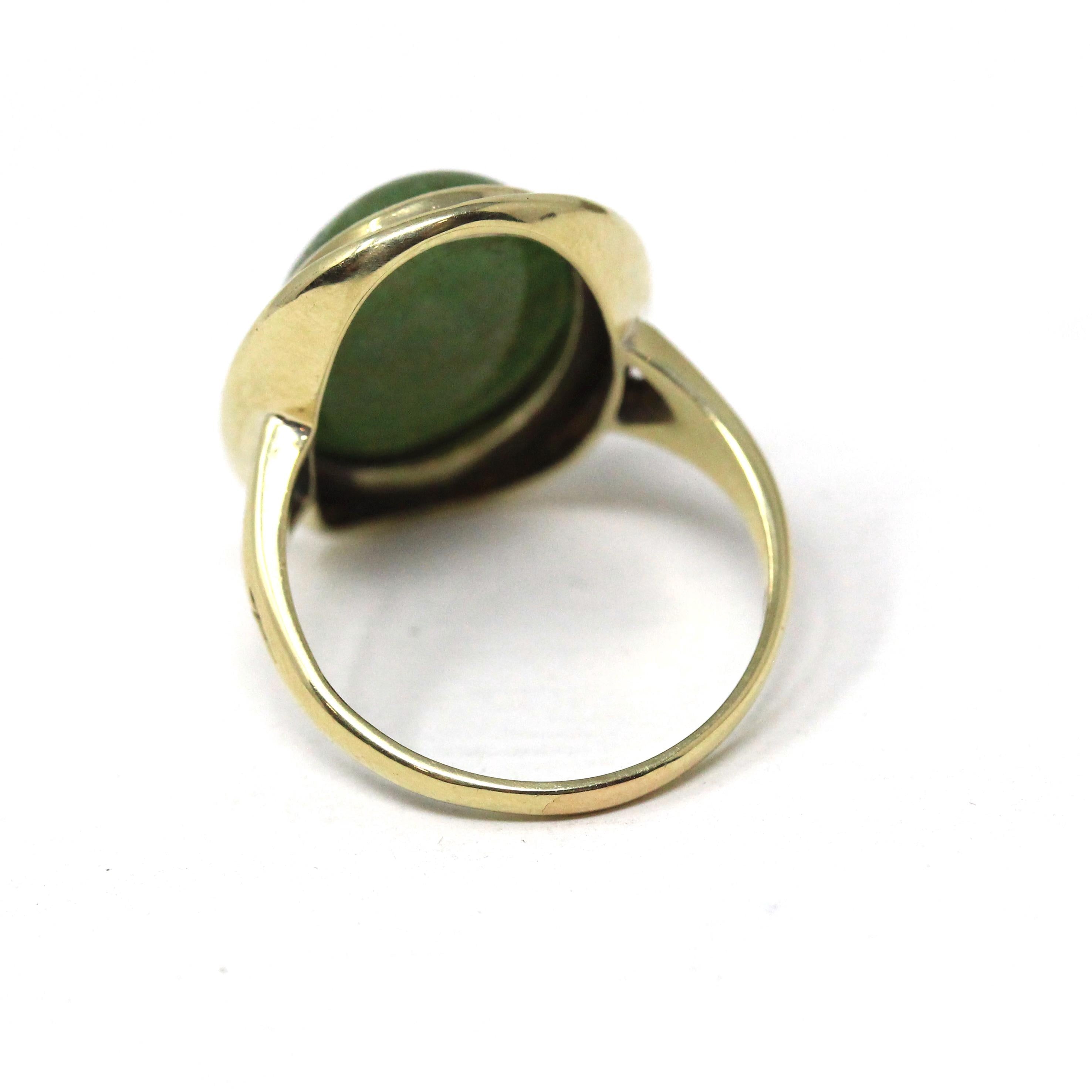 Vintage Jadeite Ring - Mid Century 14k Yellow Gold Natural Green Cabochon Cut Gemstone - Circa 1940s Era Statement Size 6 Fine 40s Jewelry