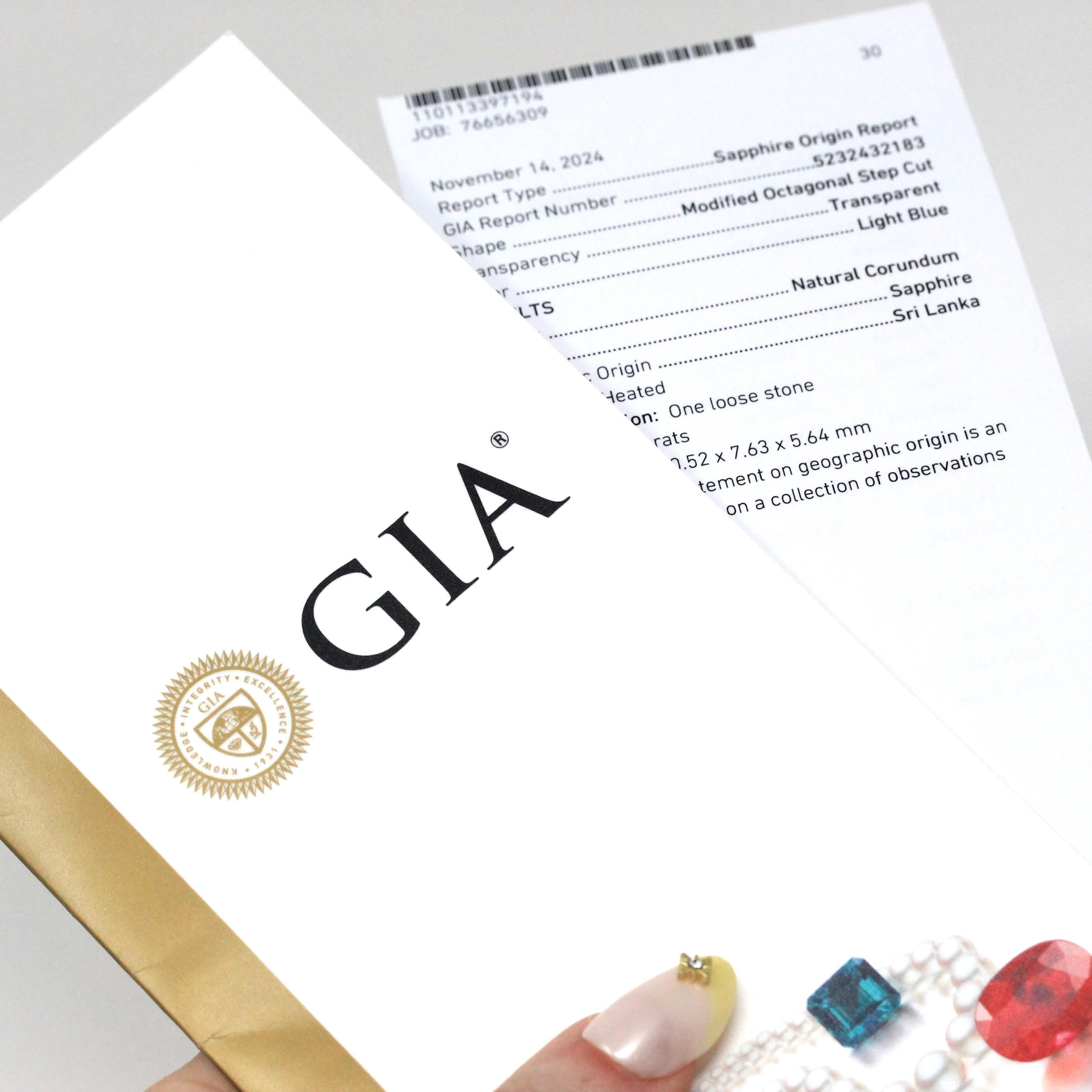 Breath-taking 14k white gold sapphire and diamond ring! This Mid Century era 14k white gold setting has been set with a new light blue fancy cut natural Sri Lankan sapphire in a prong-setting. The shoulders and gallery are accented with a combination of sparkling single cut and baguette cut diamonds. A GIA lab Sapphire Origin report for the sapphire is included. This ring would make an absolutely stunning engagement ring, anniversary ring, or just because ring!
