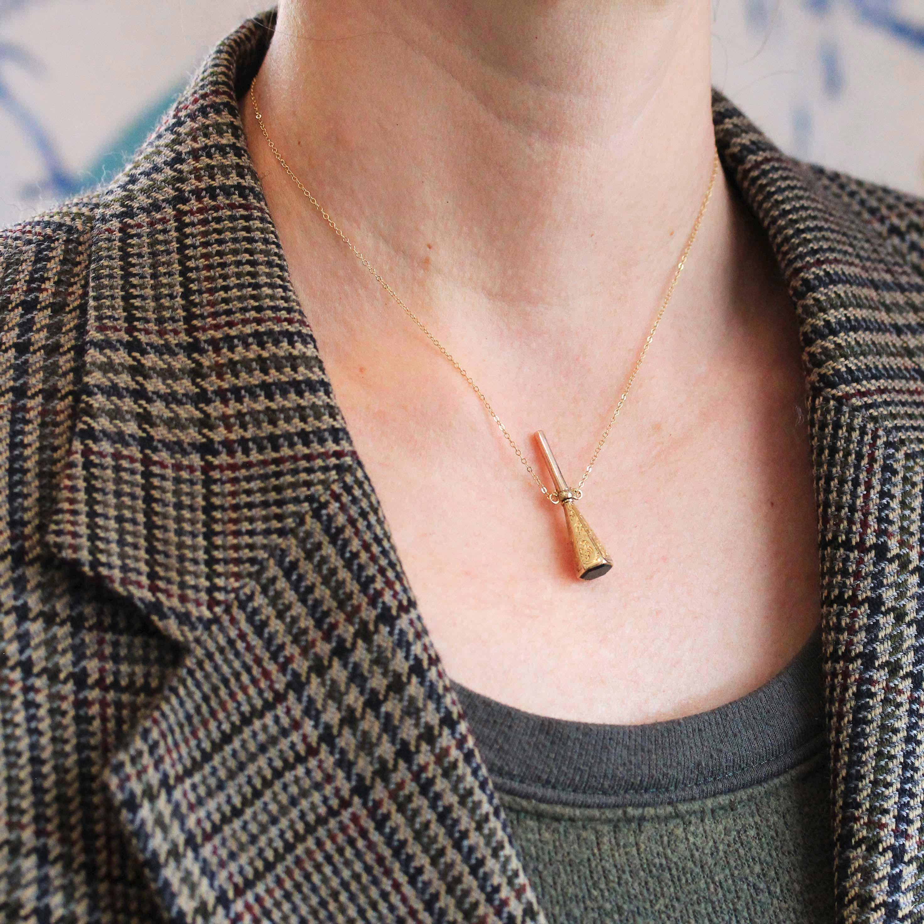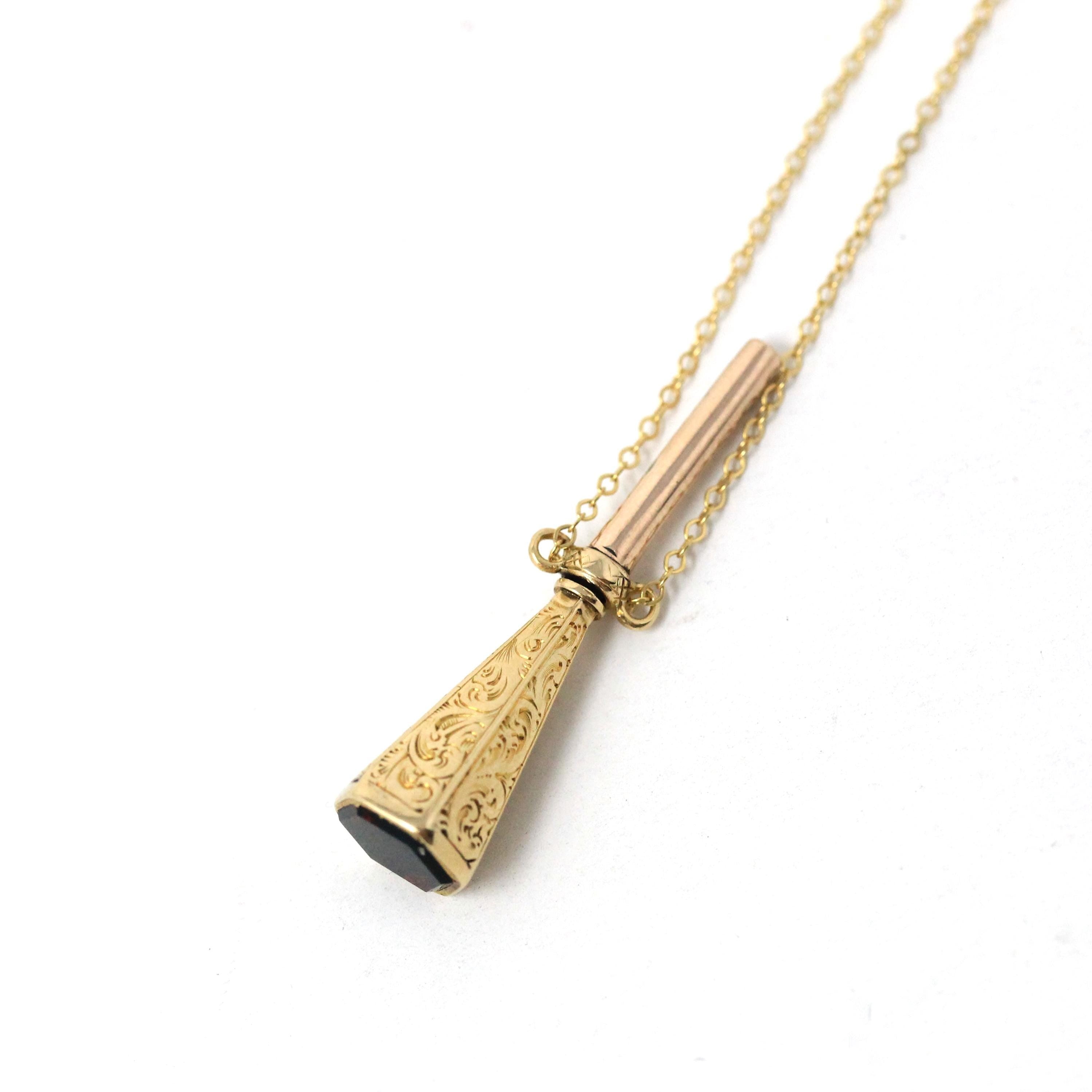 Rare and collectible antique Victorian era 14k yellow gold wax seal fob charm! This spectacular charm hangs from a brand new 10k gold adjustable chain, that was added by us. The engraved and tapered hexagonal shaped fob acts as a sleeve for 10k rosy yellow gold antique pocket watch key, that is permanently hidden. The bottom of the key contains a gorgeous red flecked hexagon shaped natural bloodstone gemstone signet. Truly one of a kind piece of historical fine jewelry!