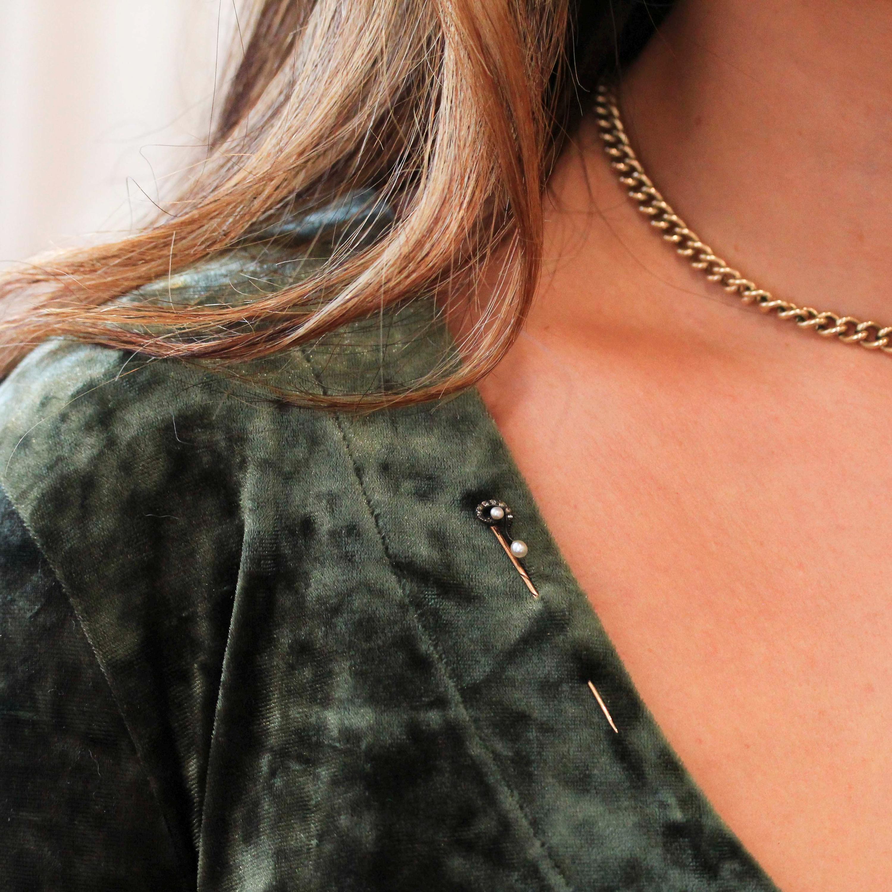 Question Mark Stick Pin - Antique Sterling Silver & 14k Yellow Gold Lapel Cravat Brooch - Victorian Era 1890s Pearl And Diamond Fine Jewelry