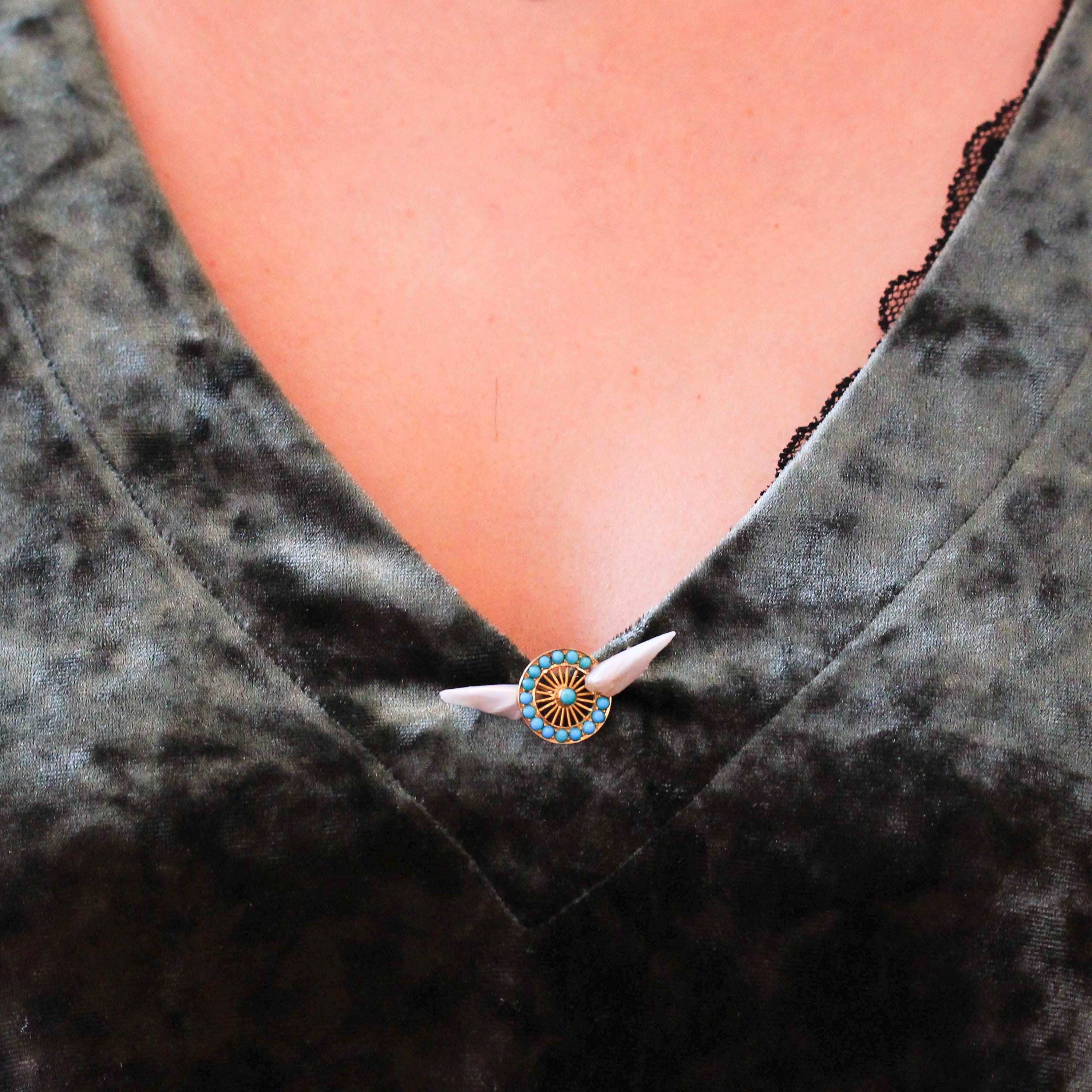 Collectible antique circa 1890s Victorian era 18k yellow gold winged wheel brooch! This symbolic antique pin is a powerful, ancient symbol representing speed, motion, progress, and freedom, often signifying safe, swift travel. Originating from the wings of the Greek god Hermes, the winged wheel symbol is frequently used to represent transportation, engineering, automotive power or specialized, high-speed, and dangerous work, such as in motorcycle police units. The Victorian era lapel brooch features natural blue turquoise cabochon gemstones and two dramatic elongated baroque pearls. The brooch secures with a handmade 10k gold pin backing. A fantastic piece of fine antique jewelry, steeped in symbolism inspired by the Greek God, Hermes!