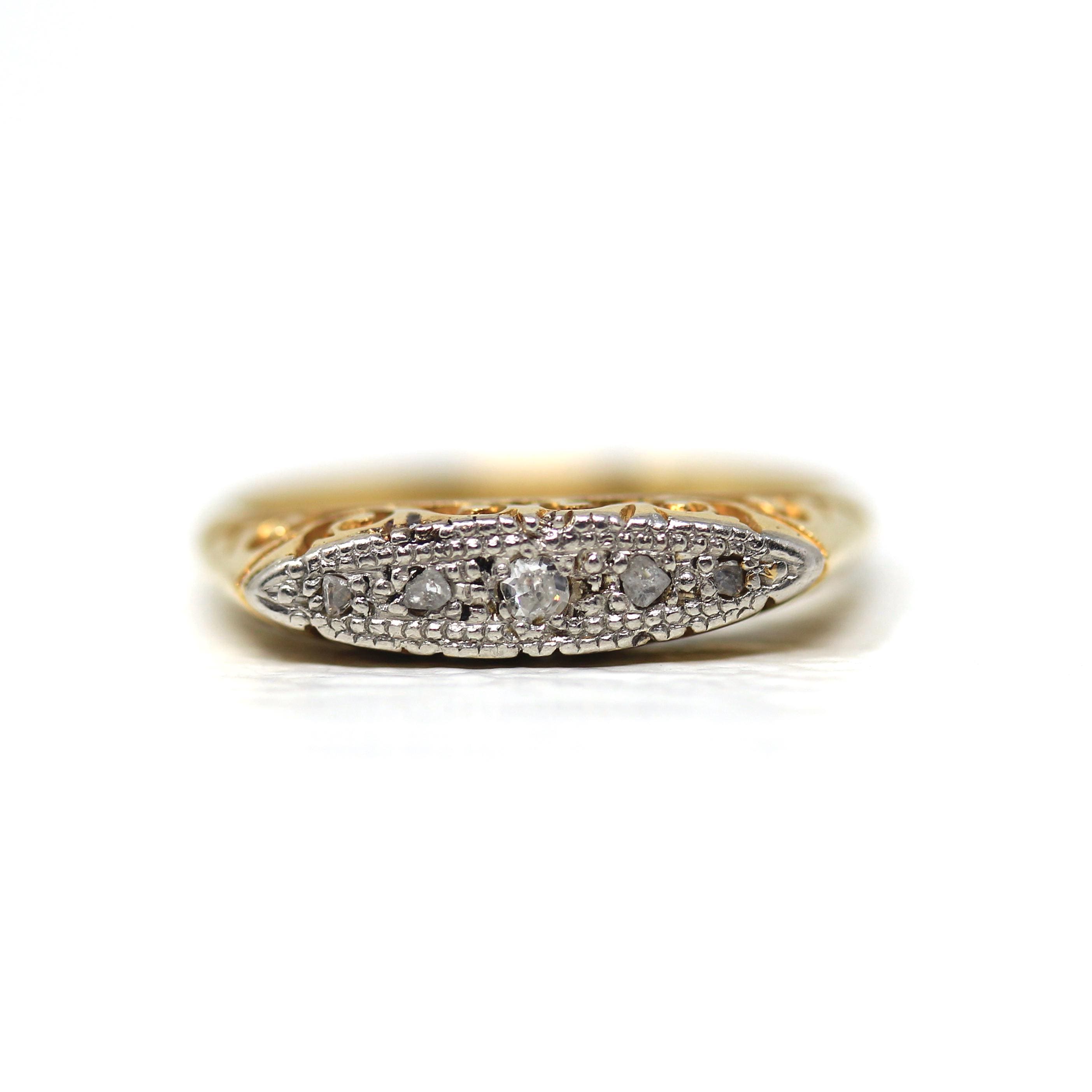 Antique Diamond Band - Edwardian 18k Yellow Gold & Platinum Genuine Natural Gemstones - Vintage 1910s Five Stone Ring Size 6 Fine Jewelry