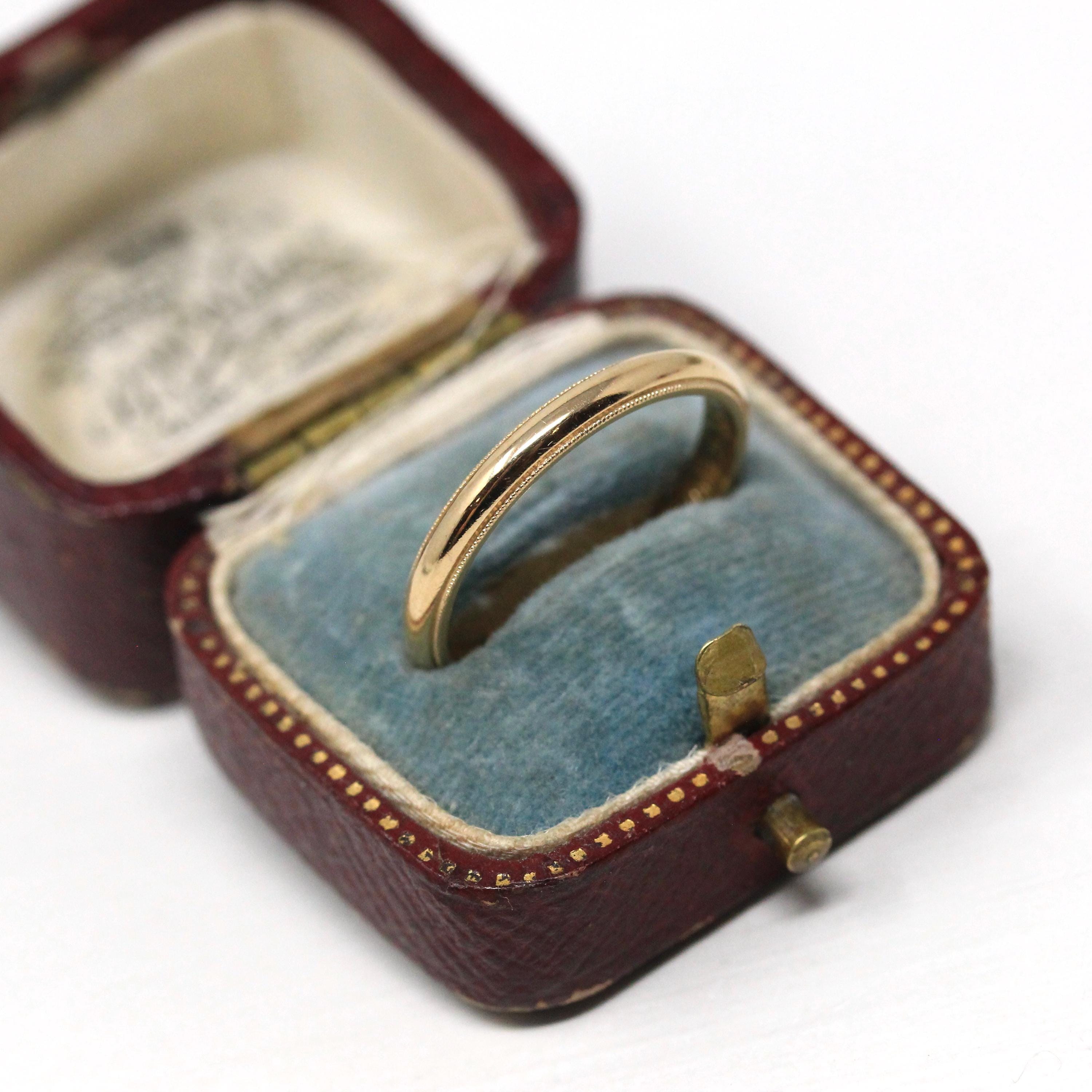 Classic dated 1988 estate 14k gold milgrain wedding ring! This classic high-polished band is plain with milgrain details on the edges. The inside of the band is lovingly engraved with "JD to RR 5-18-88." Beautiful unisex wedding band from the 1980s!