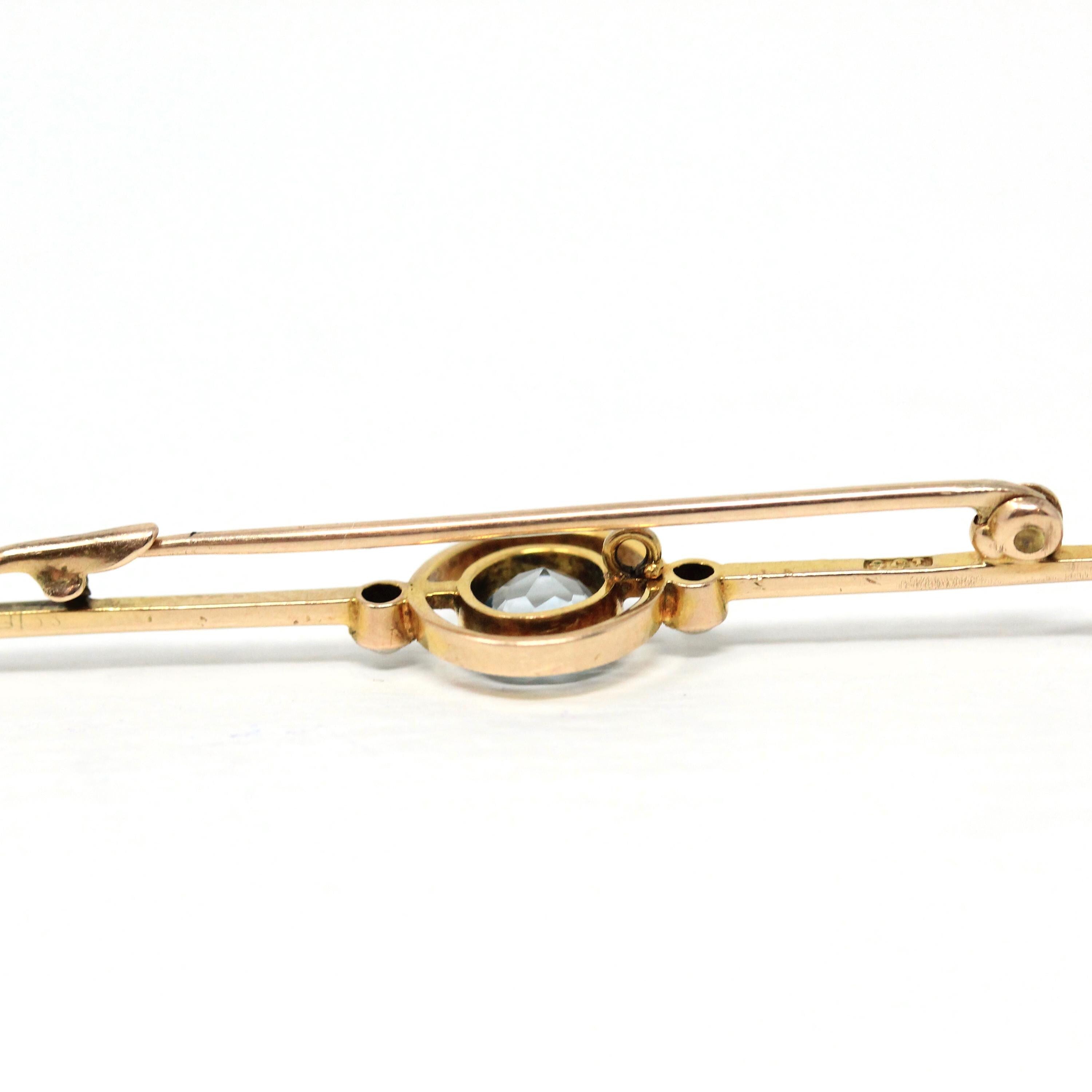 Gorgeous antique circa 1910s Edwardian era 9k yellow gold simulated aquamarine & seed pearl bar pin! This stunning brooch showcases a round faceted simulated aquamarine (light blue glass) center measuring approx. 6.0 mm in diameter. The gem is accented with a seed pearl on either side and the setting contains sleek open metal details with fine millgrain. A lovely antique piece of fine jewelry featuring March's (and June's!) birthstone!