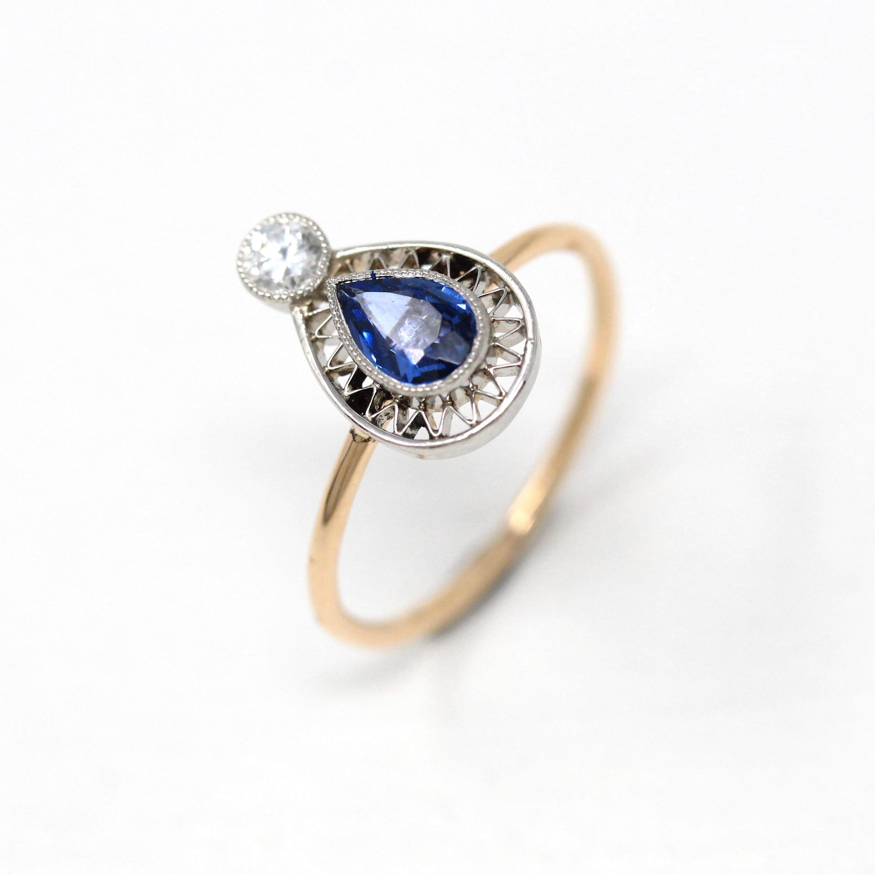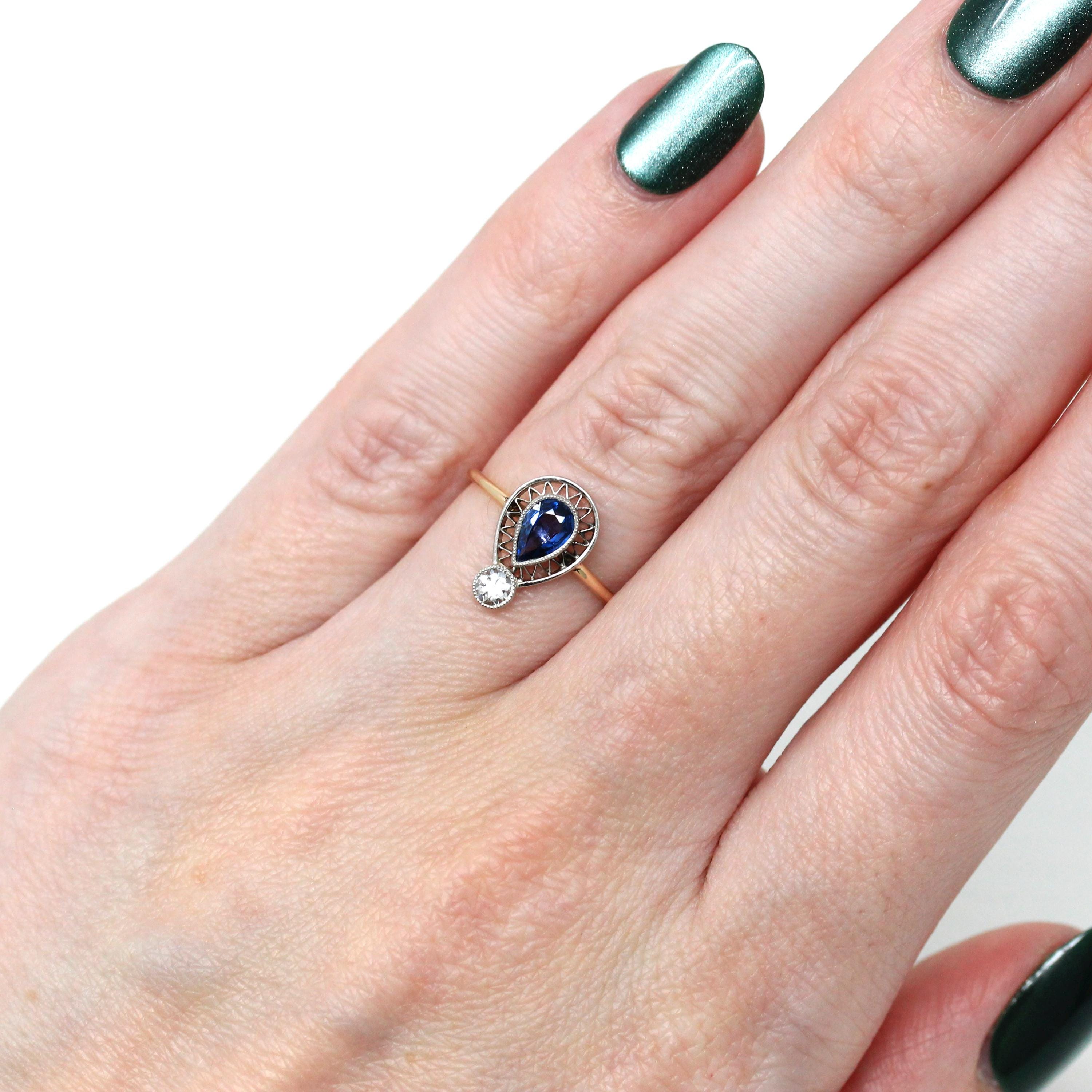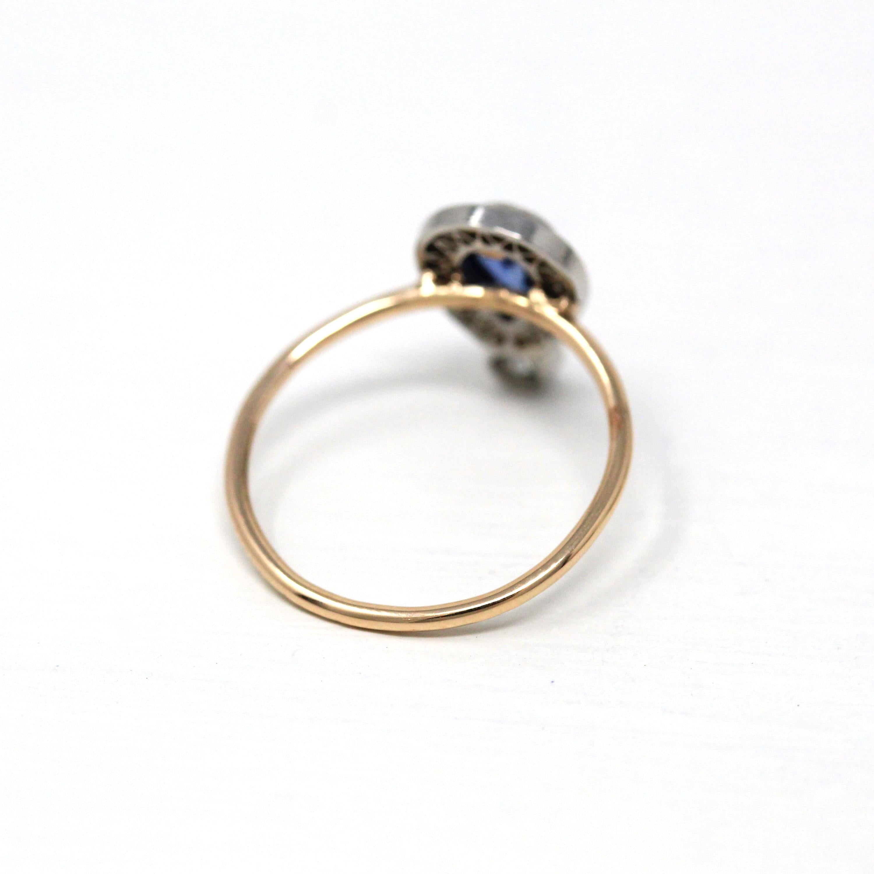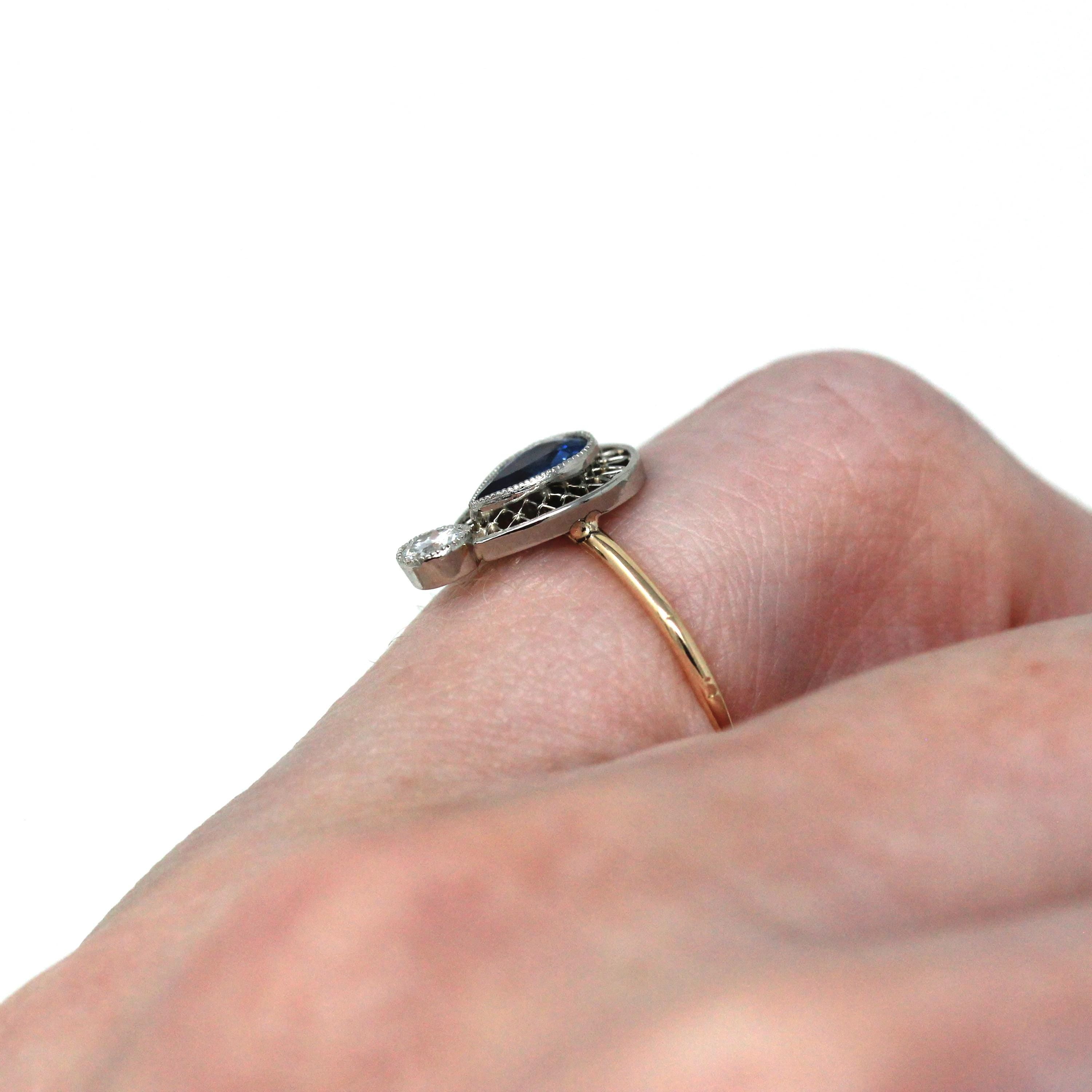 Marquise Halo Ring - Modern 14k Yellow Gold Created Sapphire Natural Diamond Gemstones - Estate Circa 1990s Size 6 Engagement Fine Jewelry